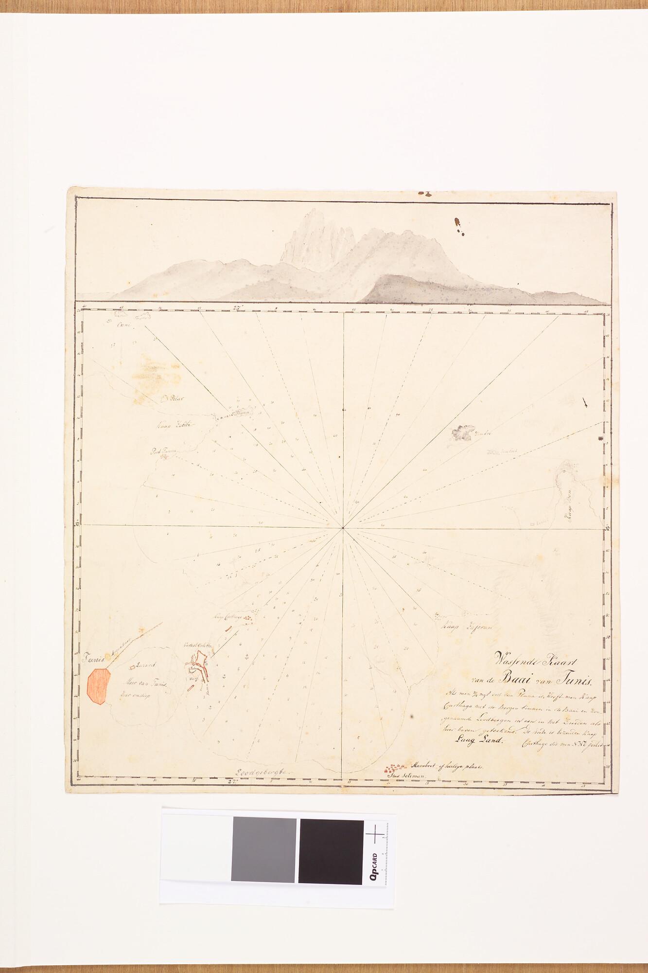 Kaart, opname van de baai van Tunis vermoedelijk door C.J.D. Wolterbeek Muller, circa 1850. Mercator projectie (schaal 1 op 300.000).