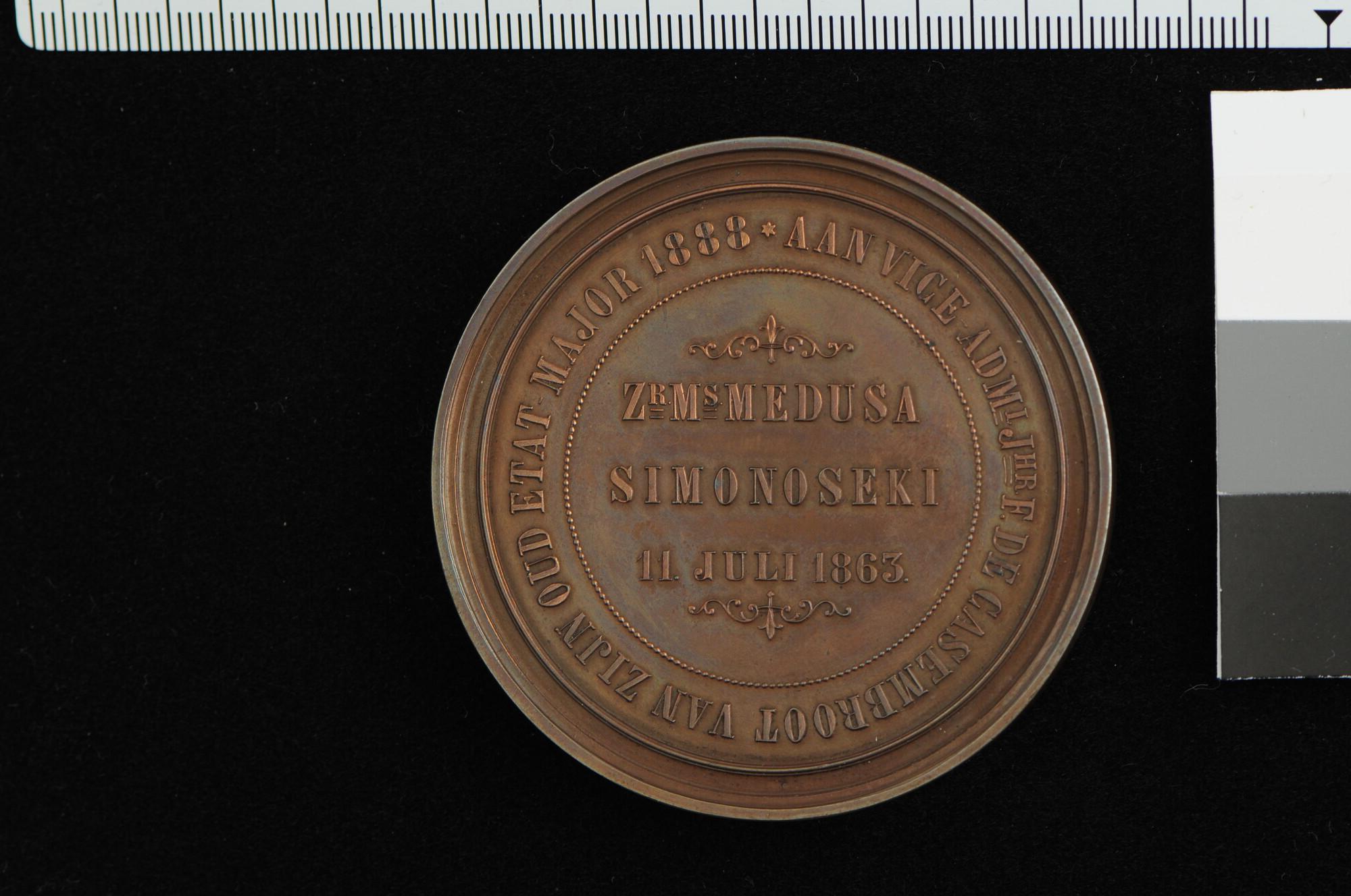 Penning op de 25-jarige herdenking van de forcering van de straat van Shimonoseki. Geslagen ter ere van vice-admiraal jonkheer François Frederik de Casembroot, geschonken door zijn officieren, 1888.