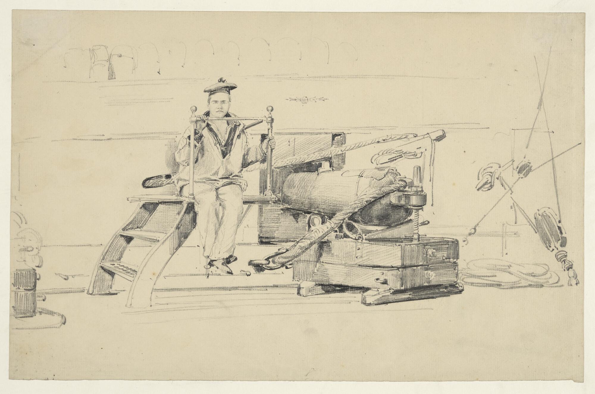 Franse matroos zittend op een franse carronade