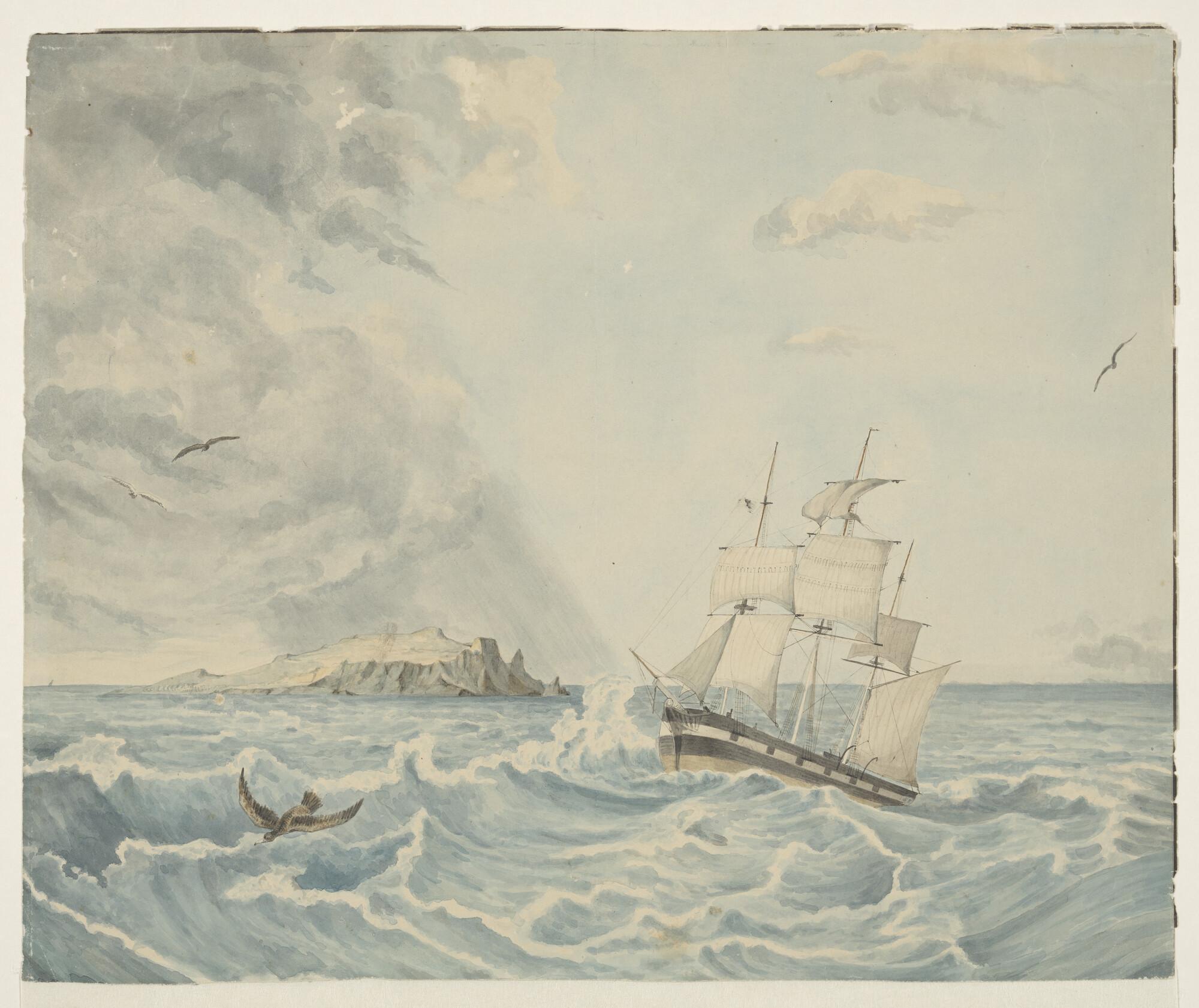 Een fregatschip varend ter hoogte van het eiland Amsterdam