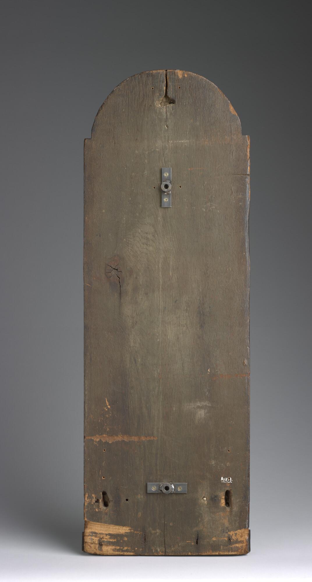 Rechthoekig bord met een halfronde bovenkant. Van boven naar beneden gedecoreerd met beschilderd snijwerk gescheiden door gekartelde randen.