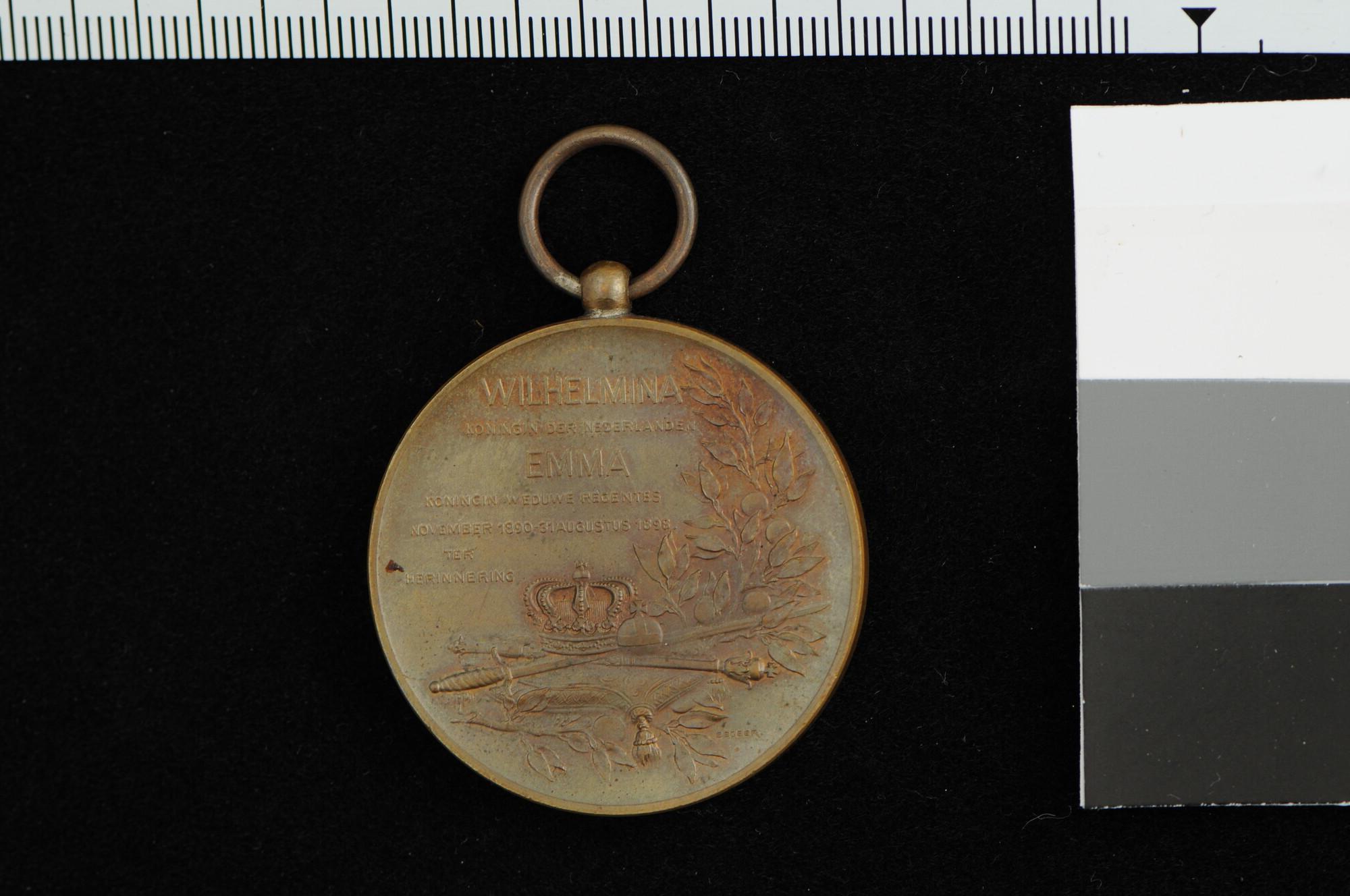 Draagpenning op de inhuldiging van koningin Wilhelmina en ter herdenking aan het regentschap van koningin Emma, 1898