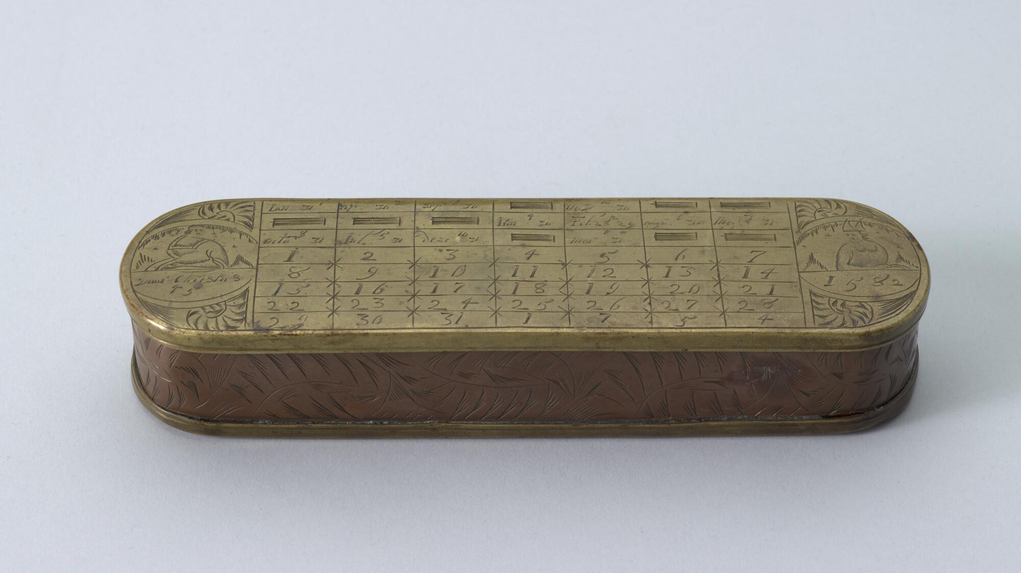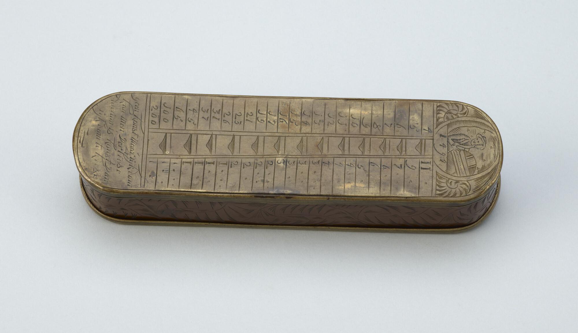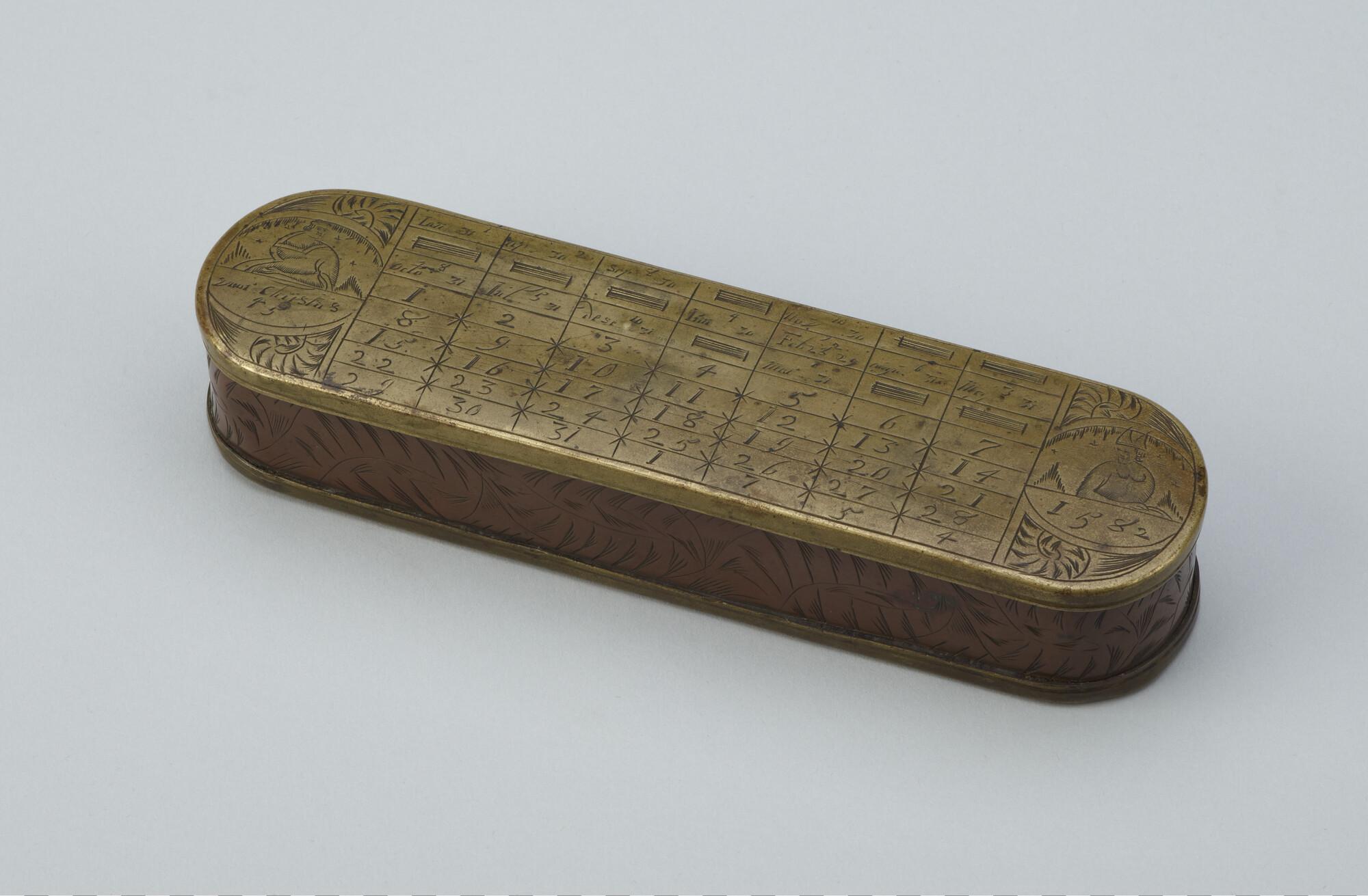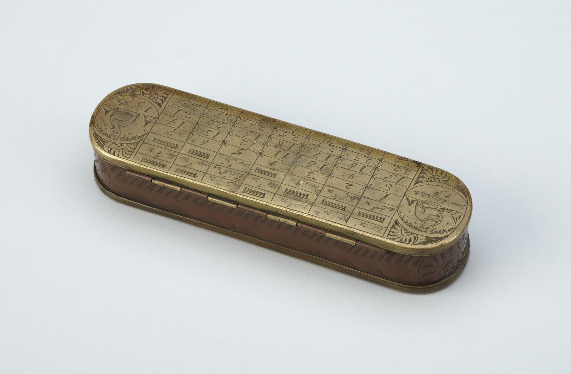 Tabaksdoos van Pieter Holm, Amsterdam, 1754. Op de voorzijde een eeuwigdurende kalender en een afbeelding van Cesar en Paus Gregorius, aan de achterzijde een zeemeter en een afbeelding van Amerigo Vespucci.