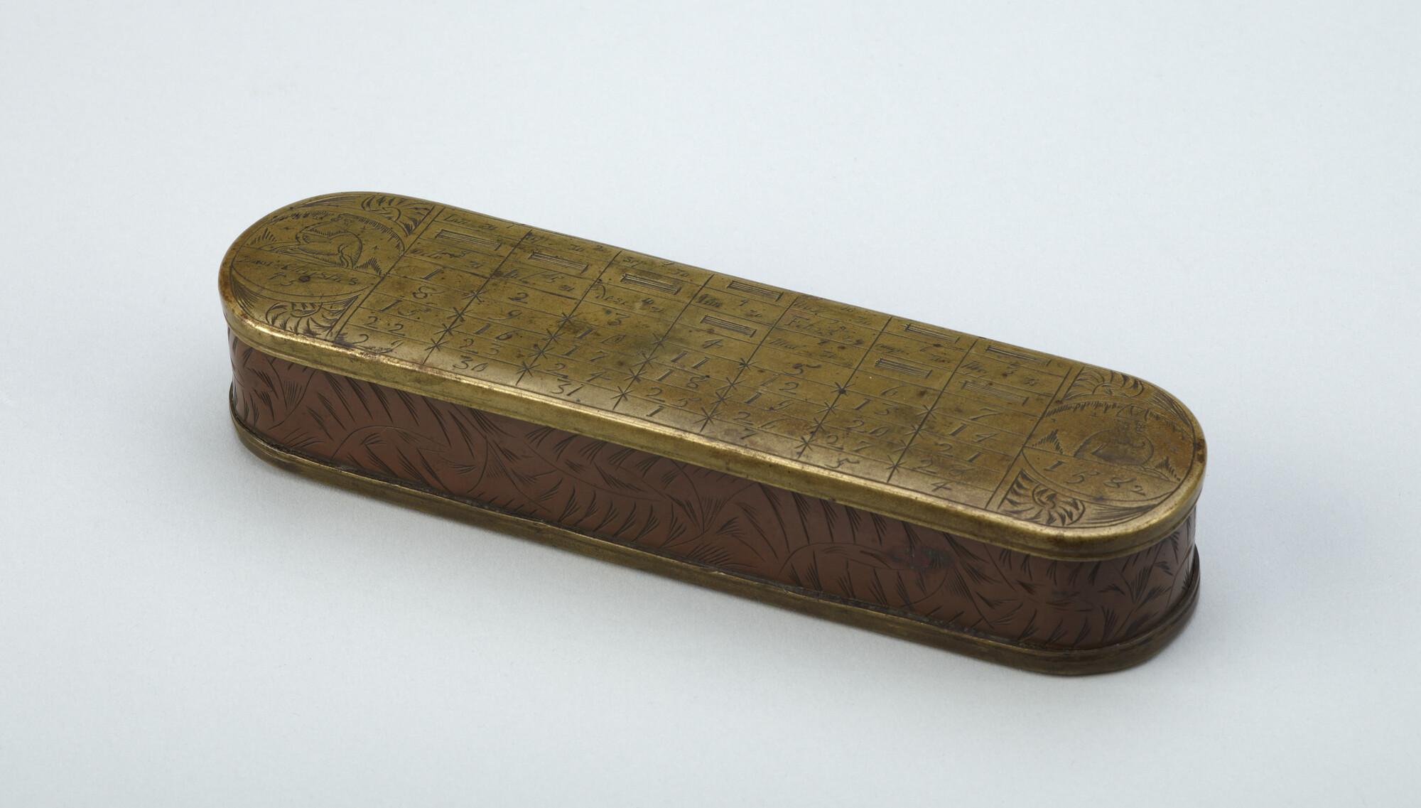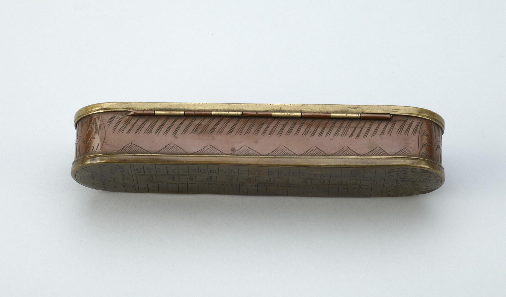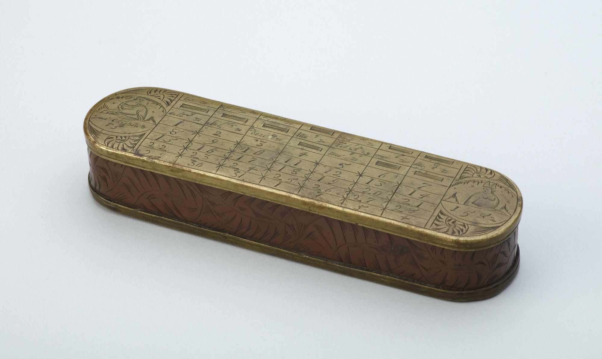 Tabaksdoos van Pieter Holm, Amsterdam, 1754. Op de voorzijde een eeuwigdurende kalender en een afbeelding van Cesar en Paus Gregorius, aan de achterzijde een zeemeter en een afbeelding van Amerigo Vespucci.