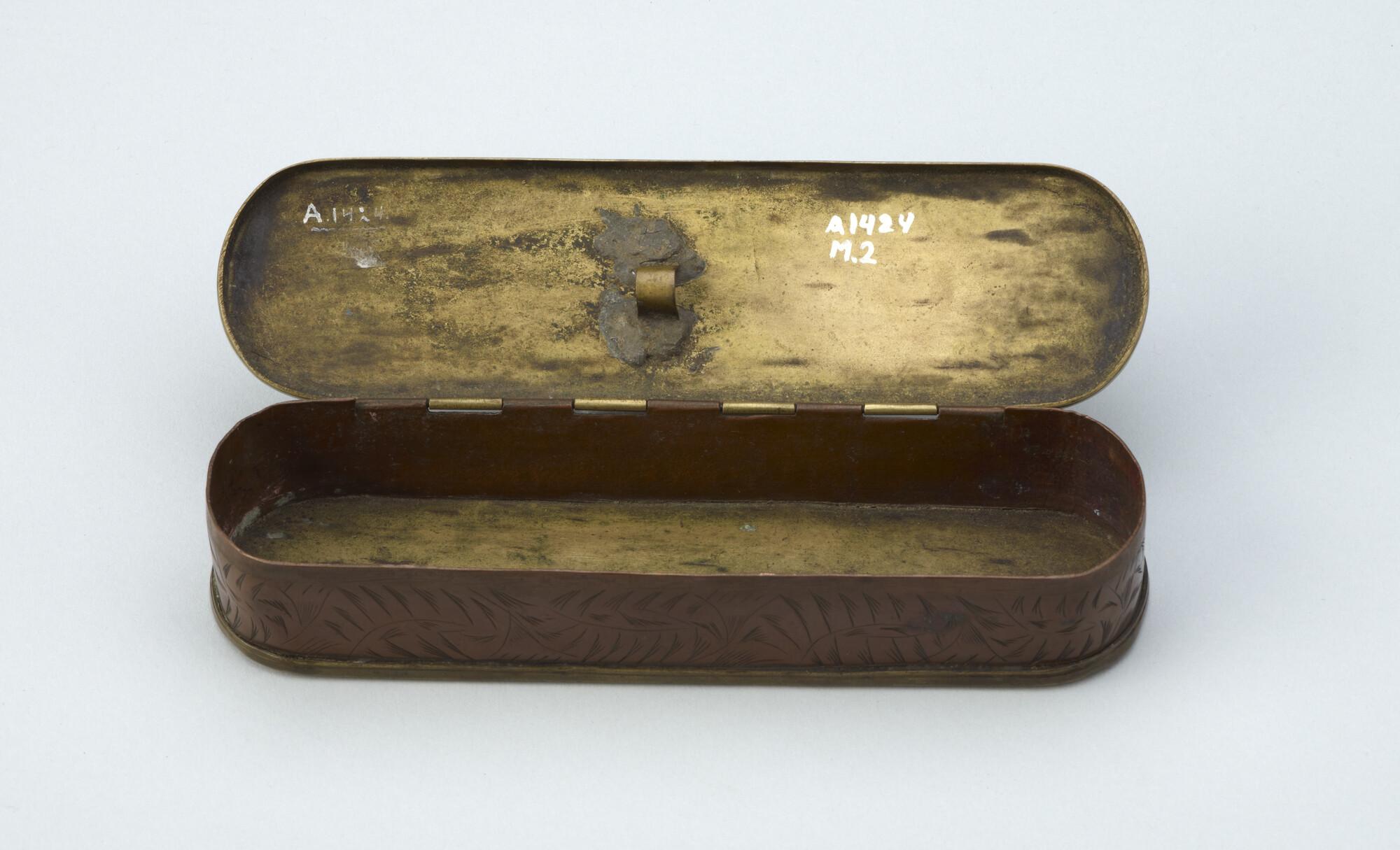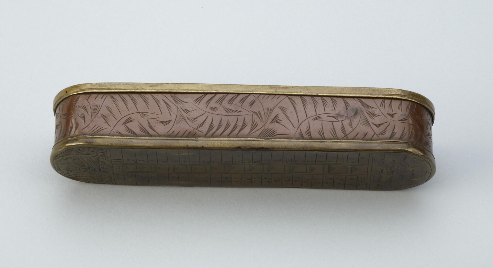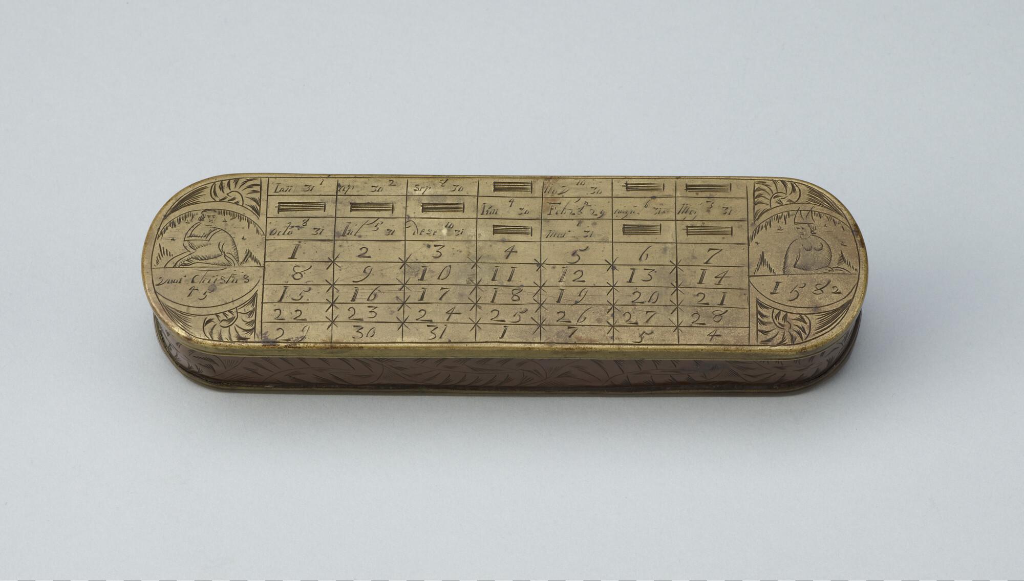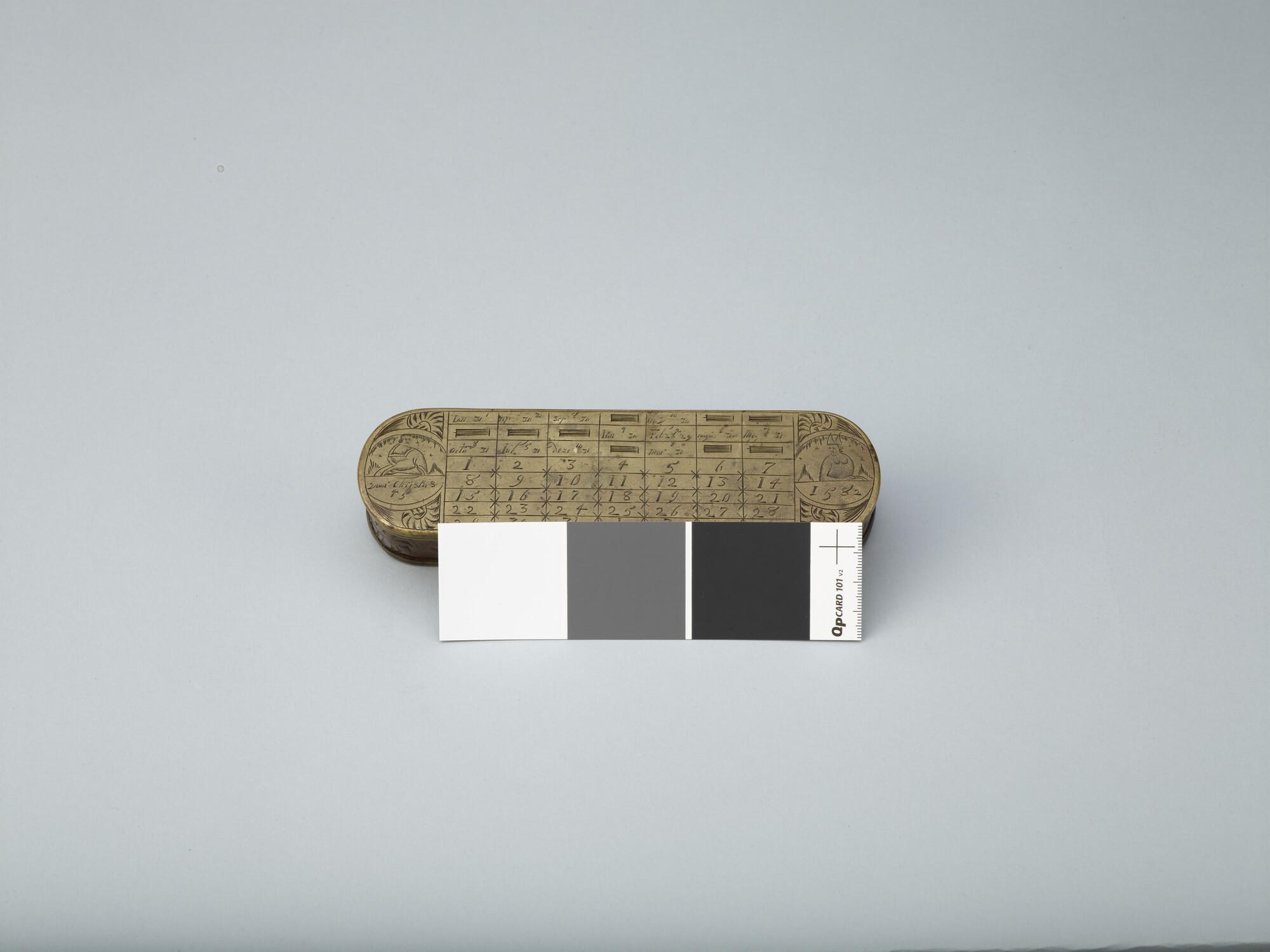 Tabaksdoos van Pieter Holm, Amsterdam, 1754. Op de voorzijde een eeuwigdurende kalender en een afbeelding van Cesar en Paus Gregorius, aan de achterzijde een zeemeter en een afbeelding van Amerigo Vespucci.
