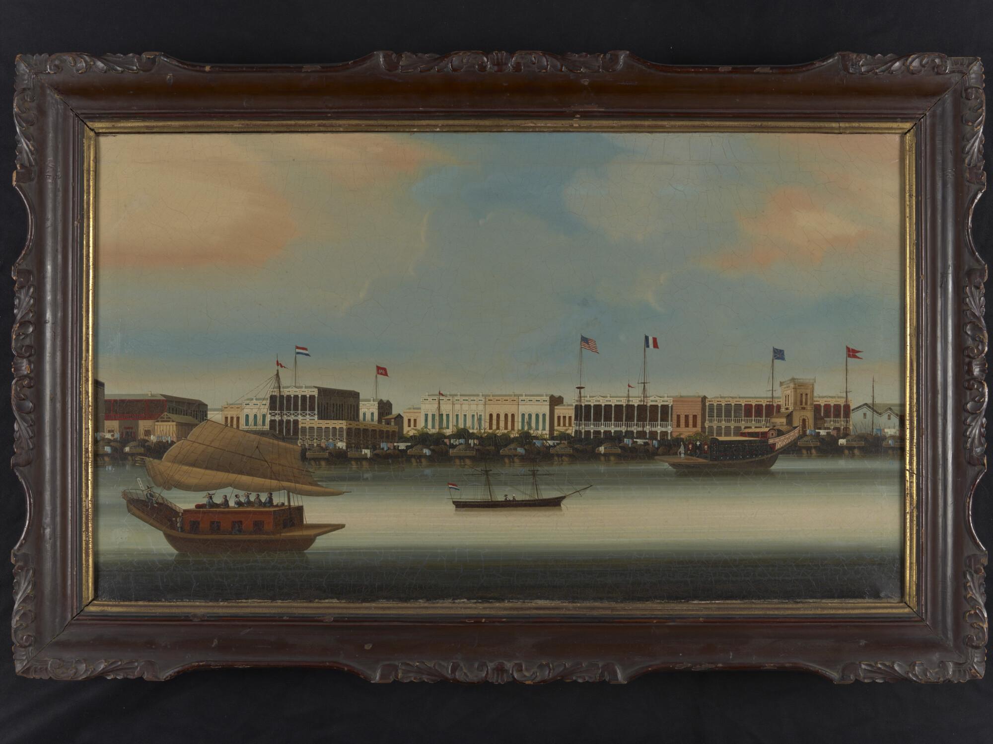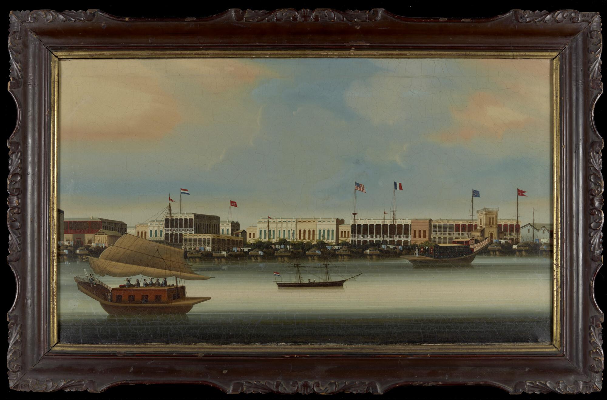 Gezicht op Canton met de verschillende van de in totaal dertien factorijen, herkenbaar aan de vlaggen van onder andere Nederland, de Verenigde Staten, Frankrijk, het Verenigd Koninkrijk en Denemarken. Langs de kade en op het water liggen meerdere Chinese schepen en een klein tweemastig schip met de Nederlandse vlag.