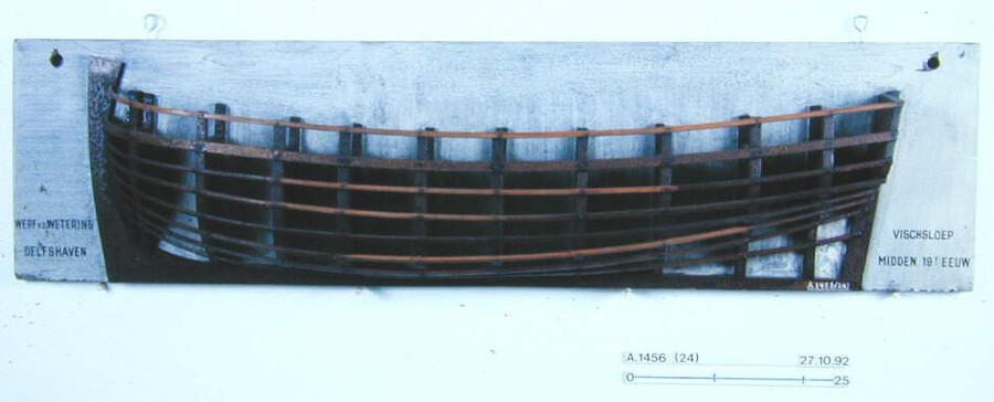 Open bewerkt halfmodel van een vissloep met plat achterschip.