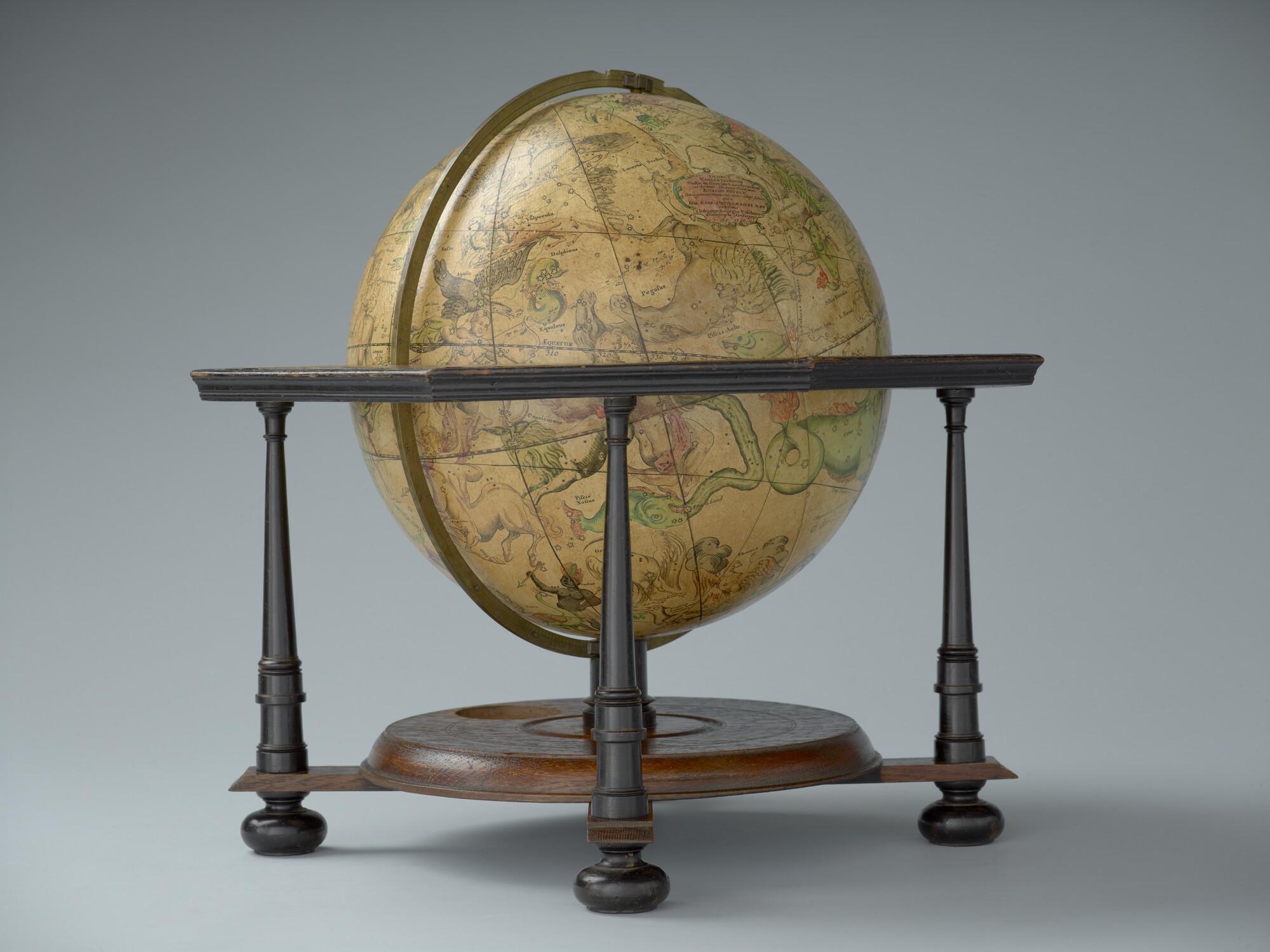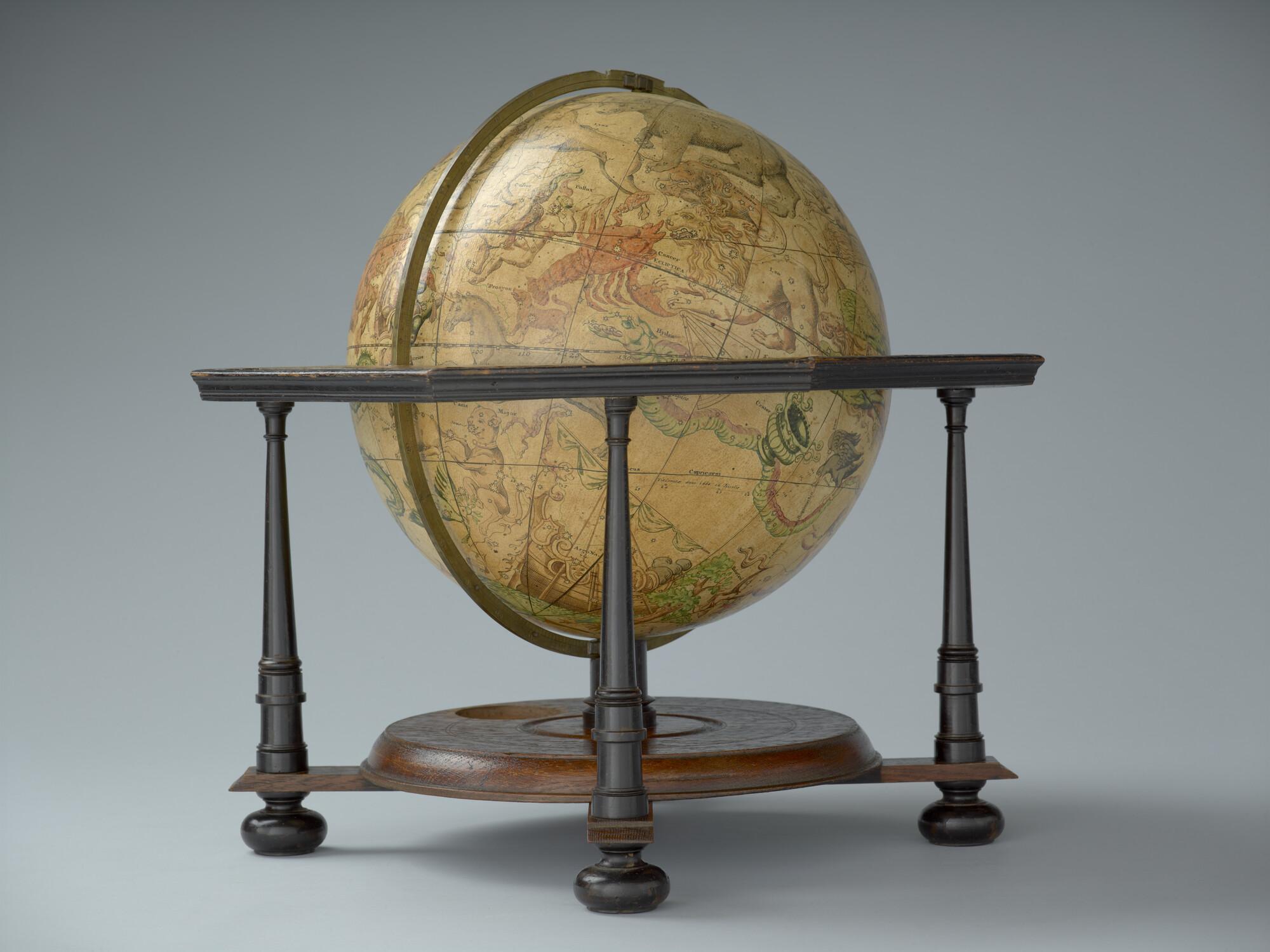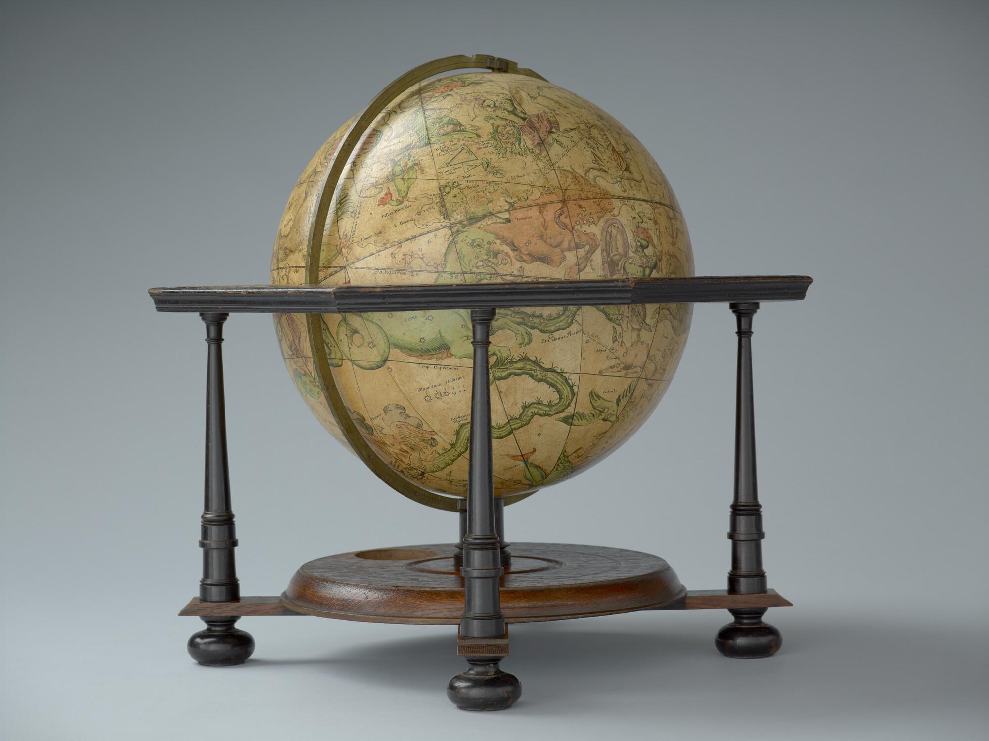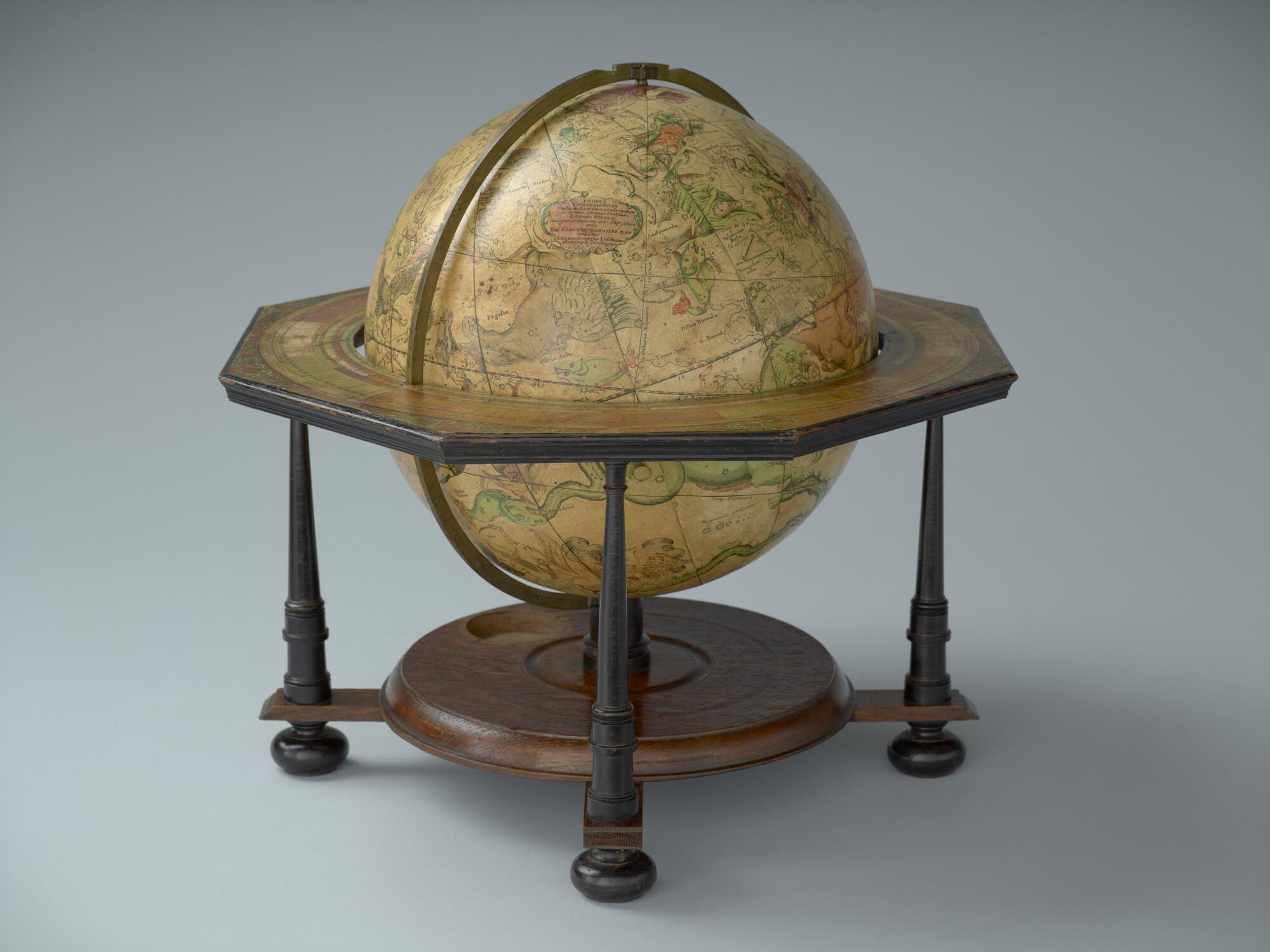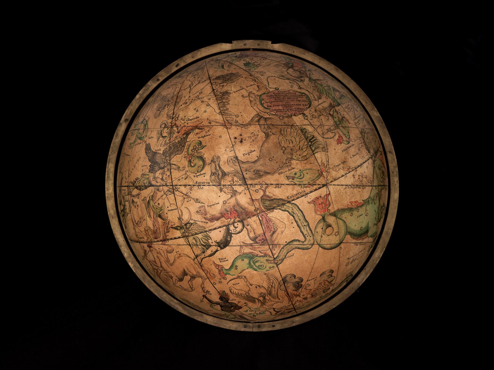 Hemelglobe van 32 cm. in doorsnede door Johann Gabriel Doppelmayer, 1728. Weergegeven is de positie van de sterren in het jaar 1730, volgens de catalogus van Johannes Hevelius. Het kompas in de basis ontbreekt.