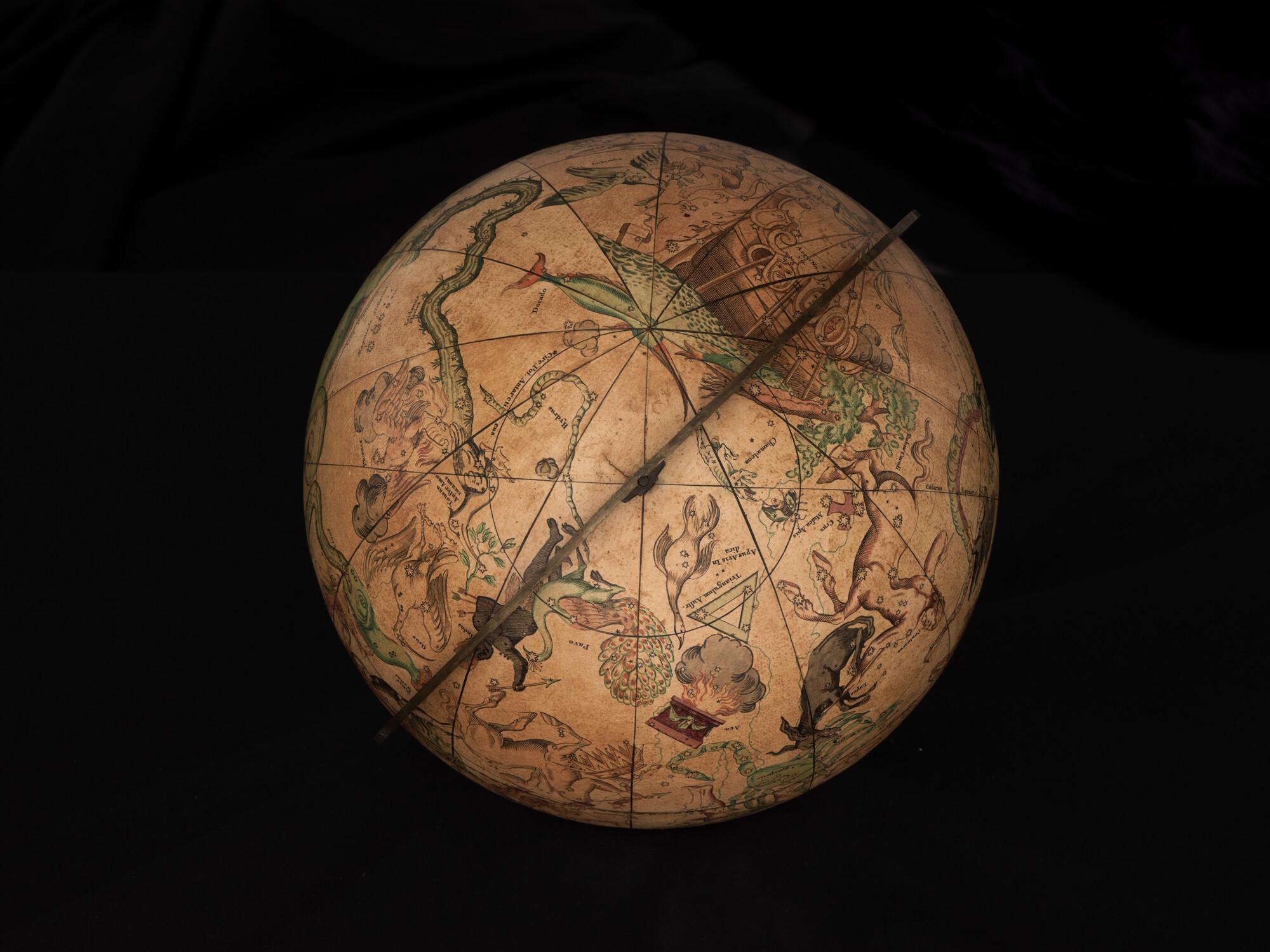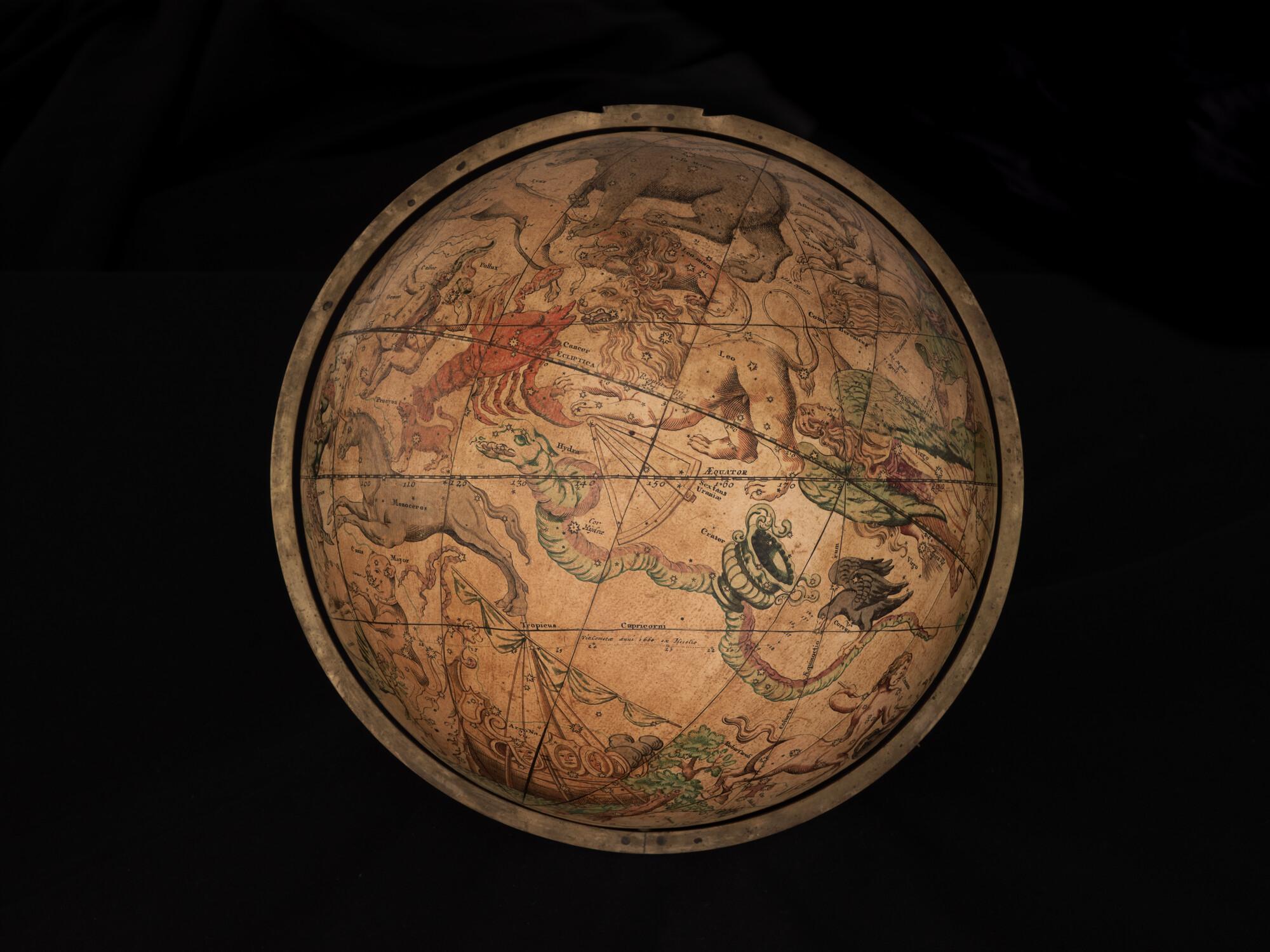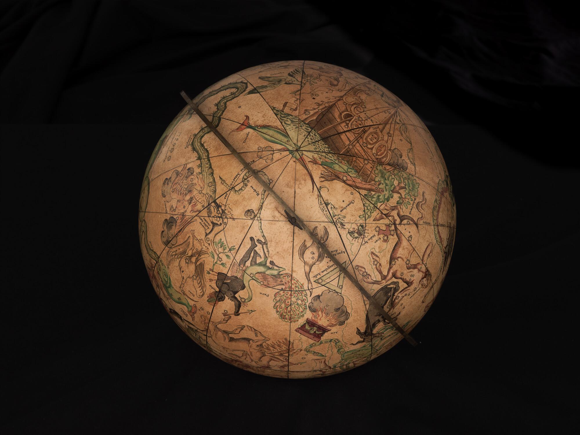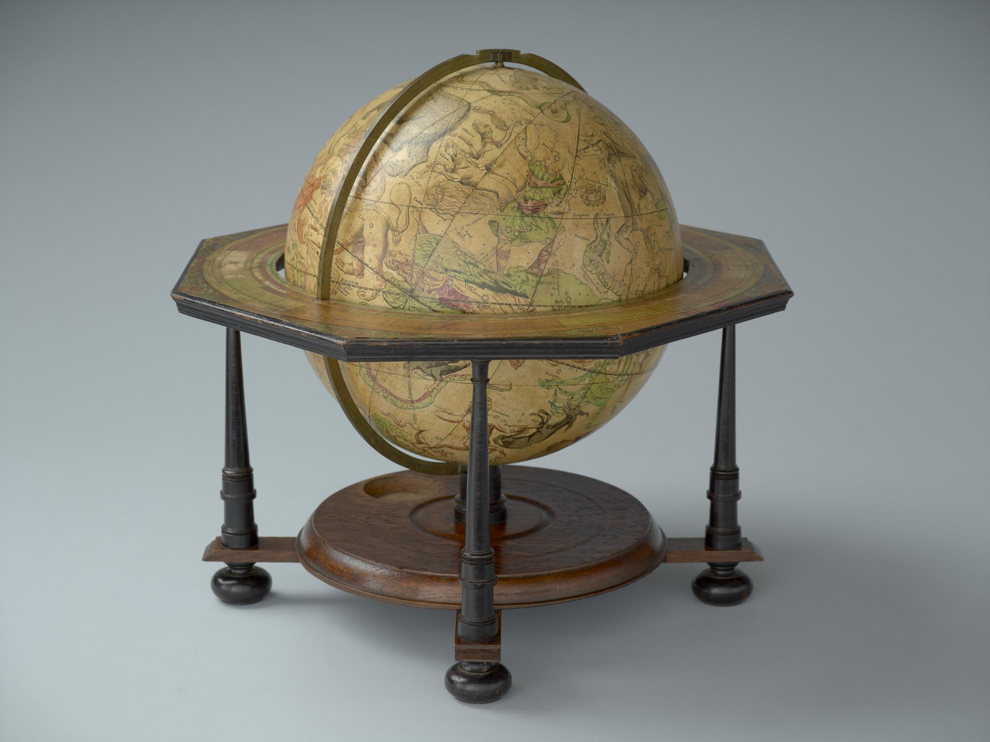 Hemelglobe van 32 cm. in doorsnede door Johann Gabriel Doppelmayer, 1728. Weergegeven is de positie van de sterren in het jaar 1730, volgens de catalogus van Johannes Hevelius. Het kompas in de basis ontbreekt.