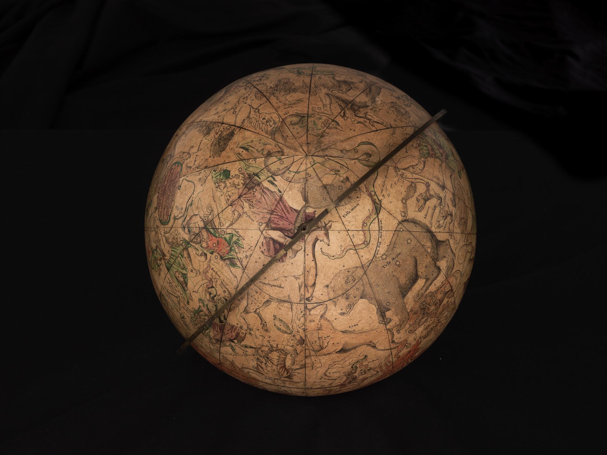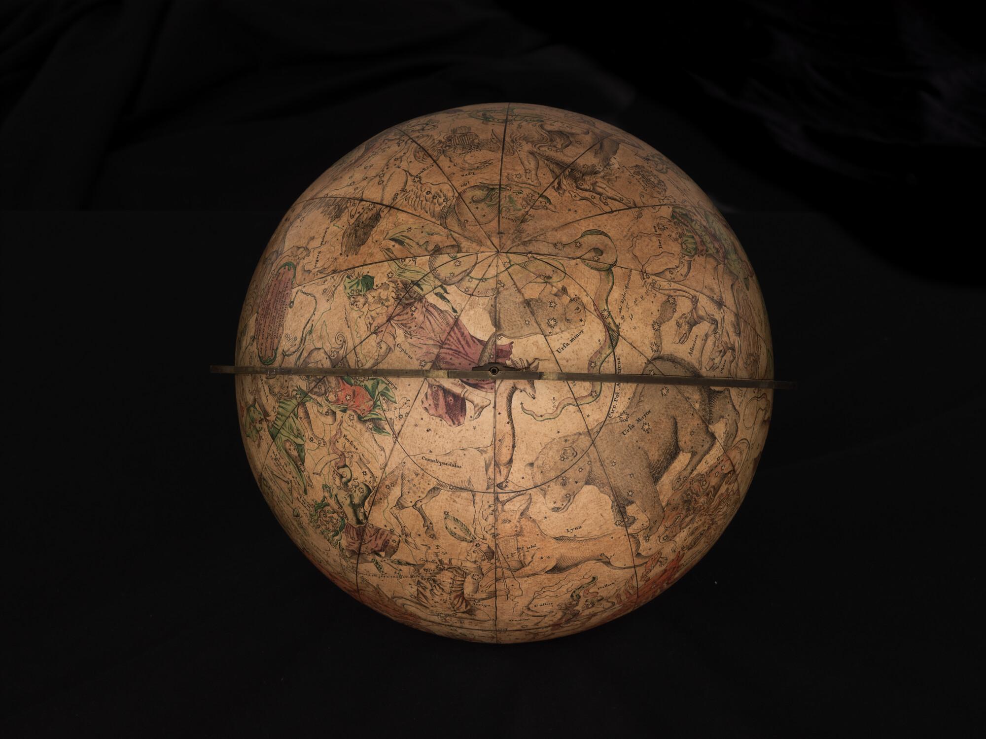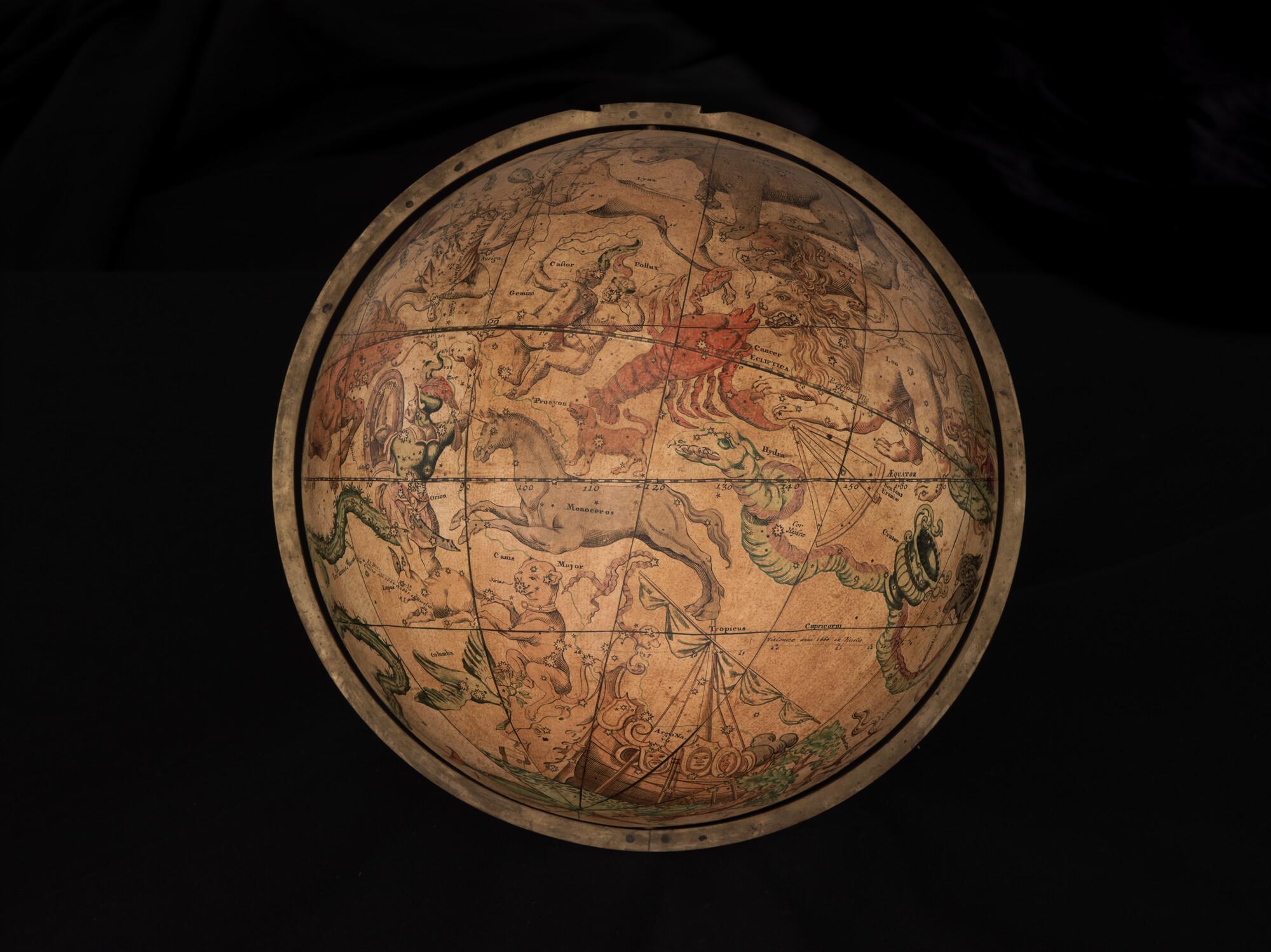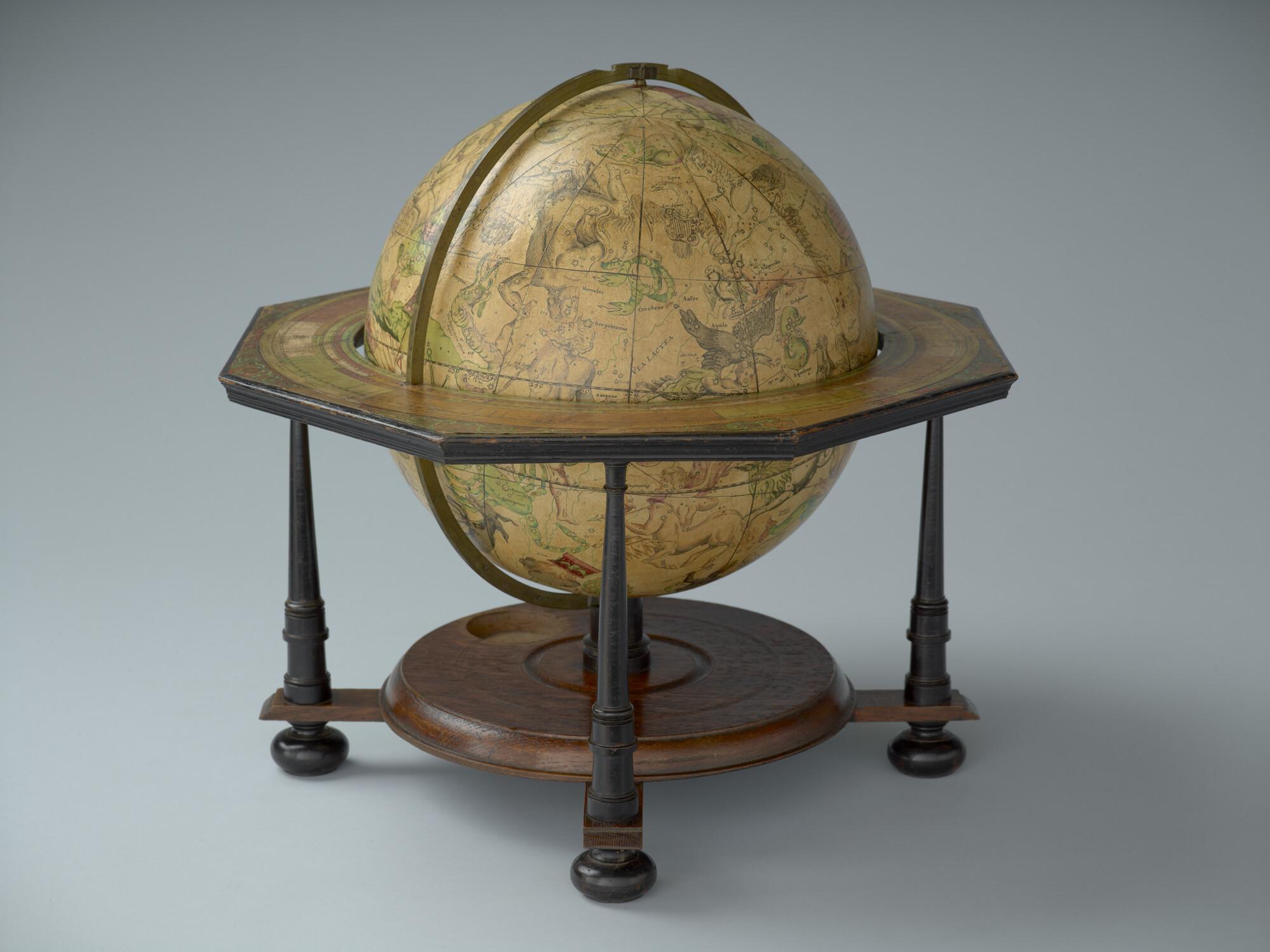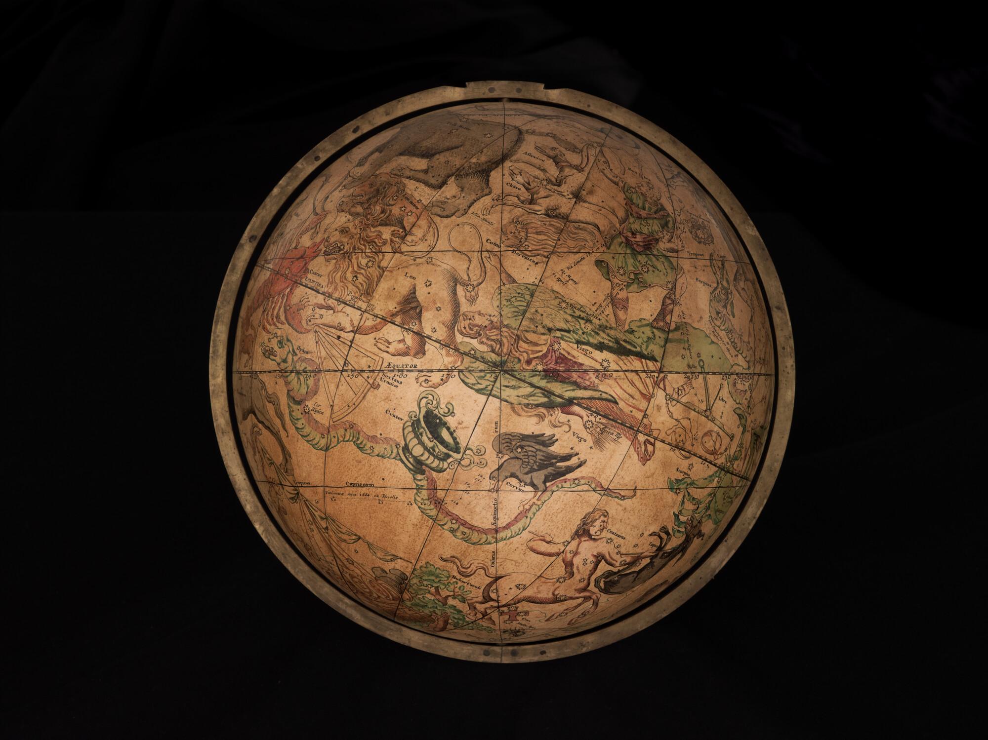 Hemelglobe van 32 cm. in doorsnede door Johann Gabriel Doppelmayer, 1728. Weergegeven is de positie van de sterren in het jaar 1730, volgens de catalogus van Johannes Hevelius. Het kompas in de basis ontbreekt.