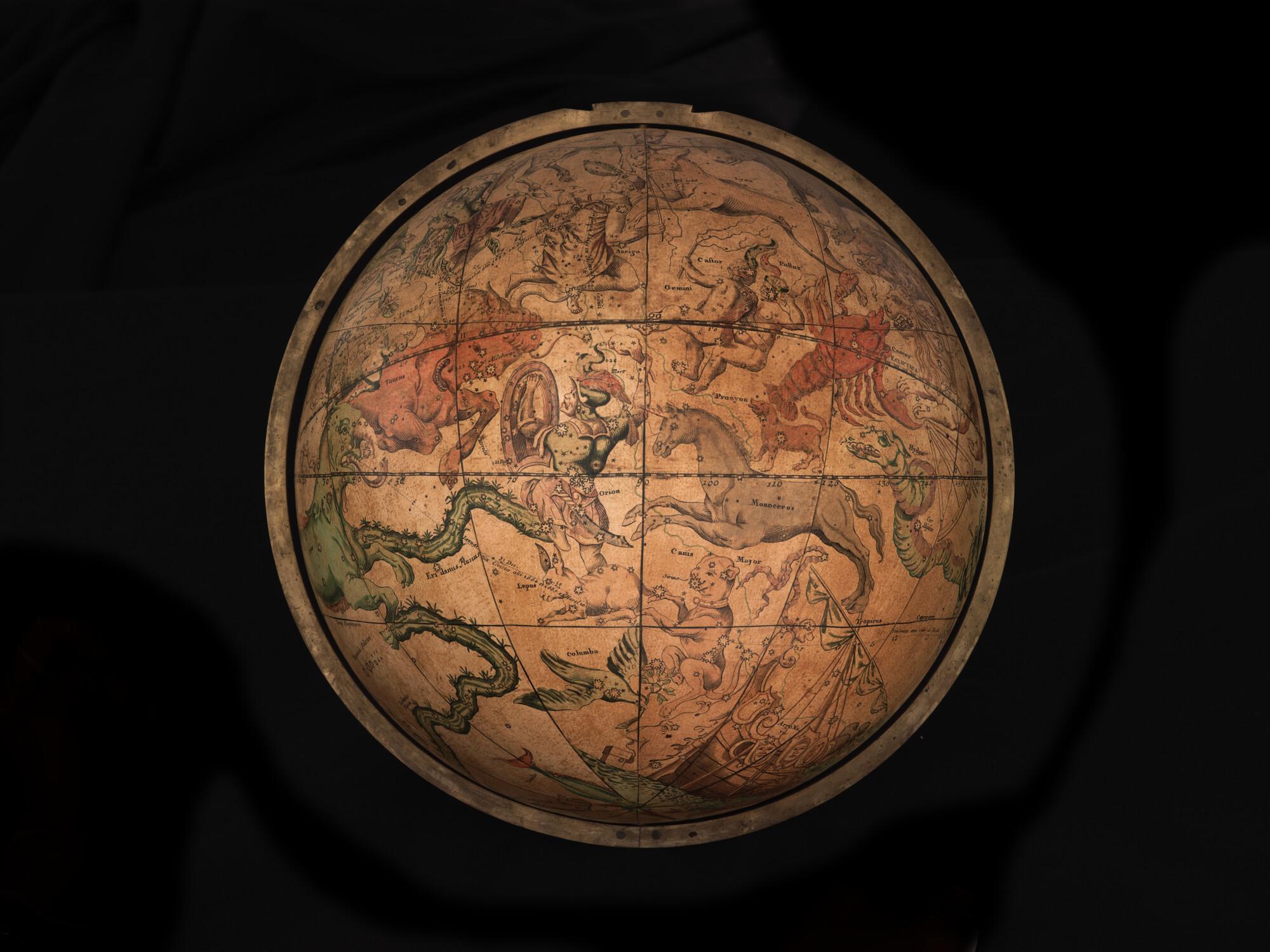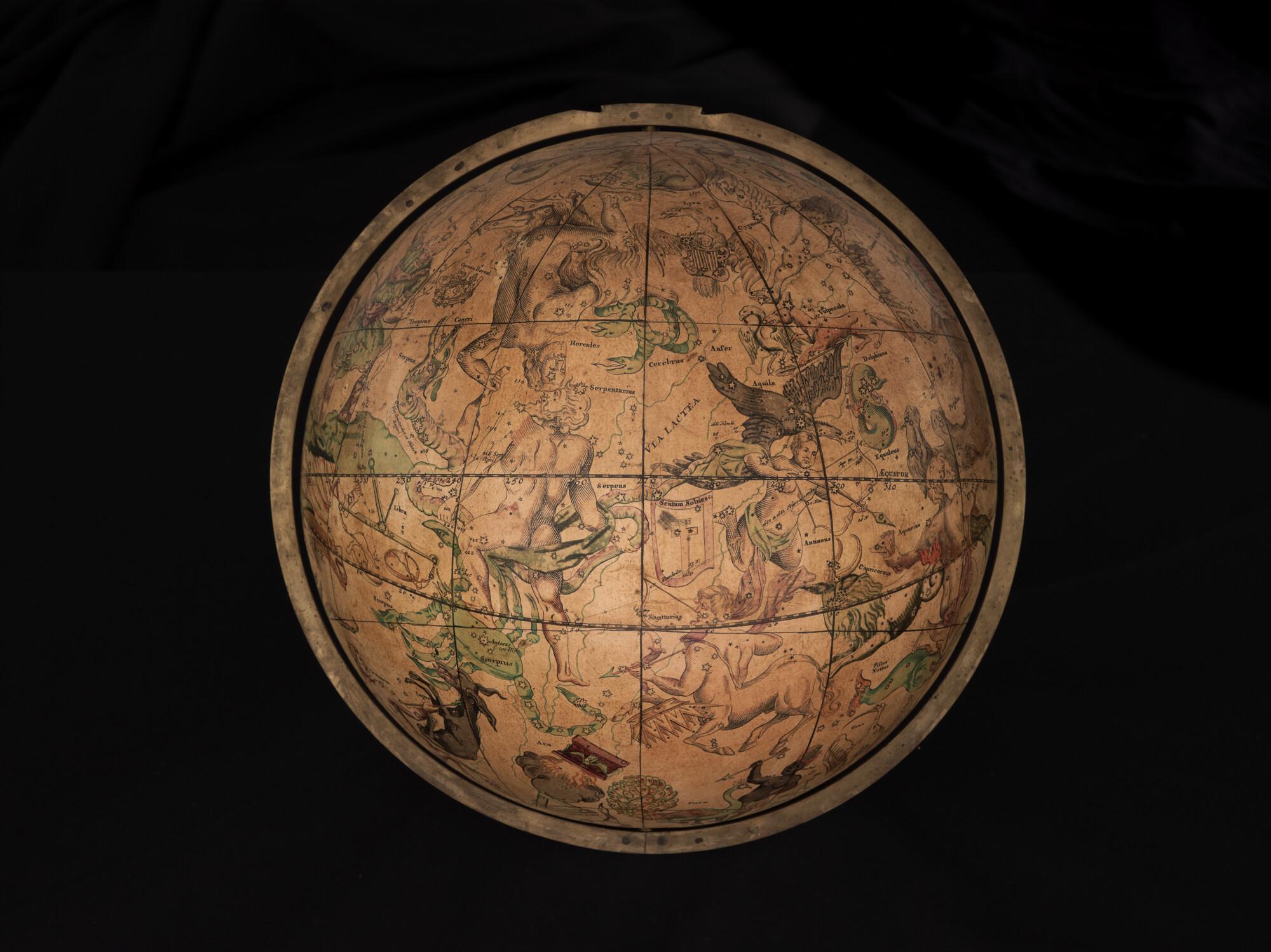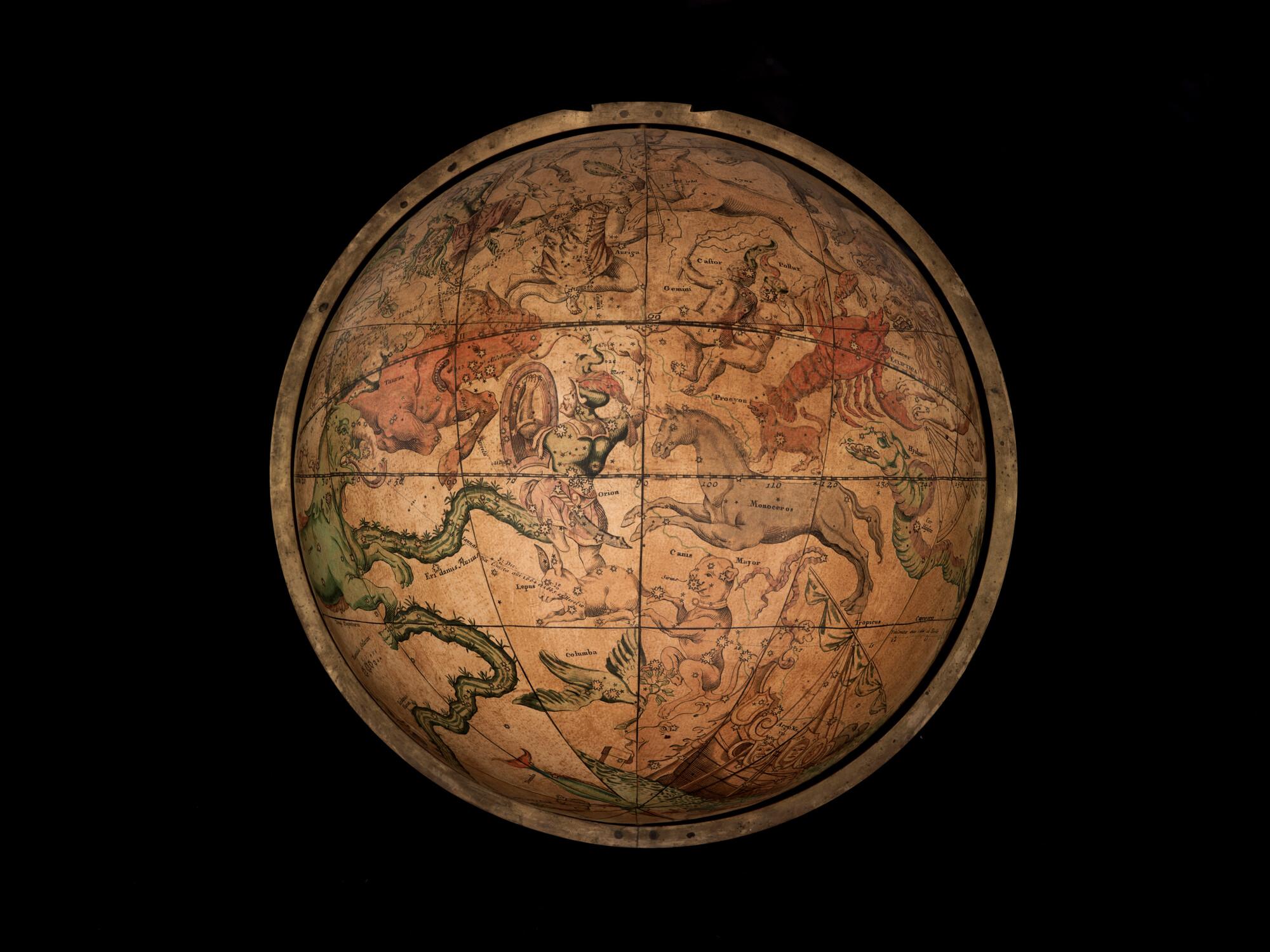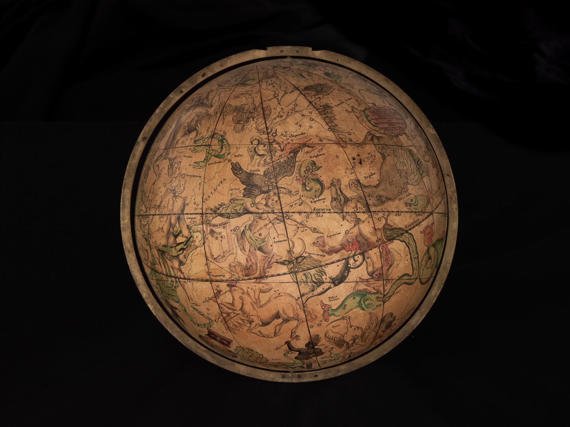 Hemelglobe van 32 cm. in doorsnede door Johann Gabriel Doppelmayer, 1728. Weergegeven is de positie van de sterren in het jaar 1730, volgens de catalogus van Johannes Hevelius. Het kompas in de basis ontbreekt.