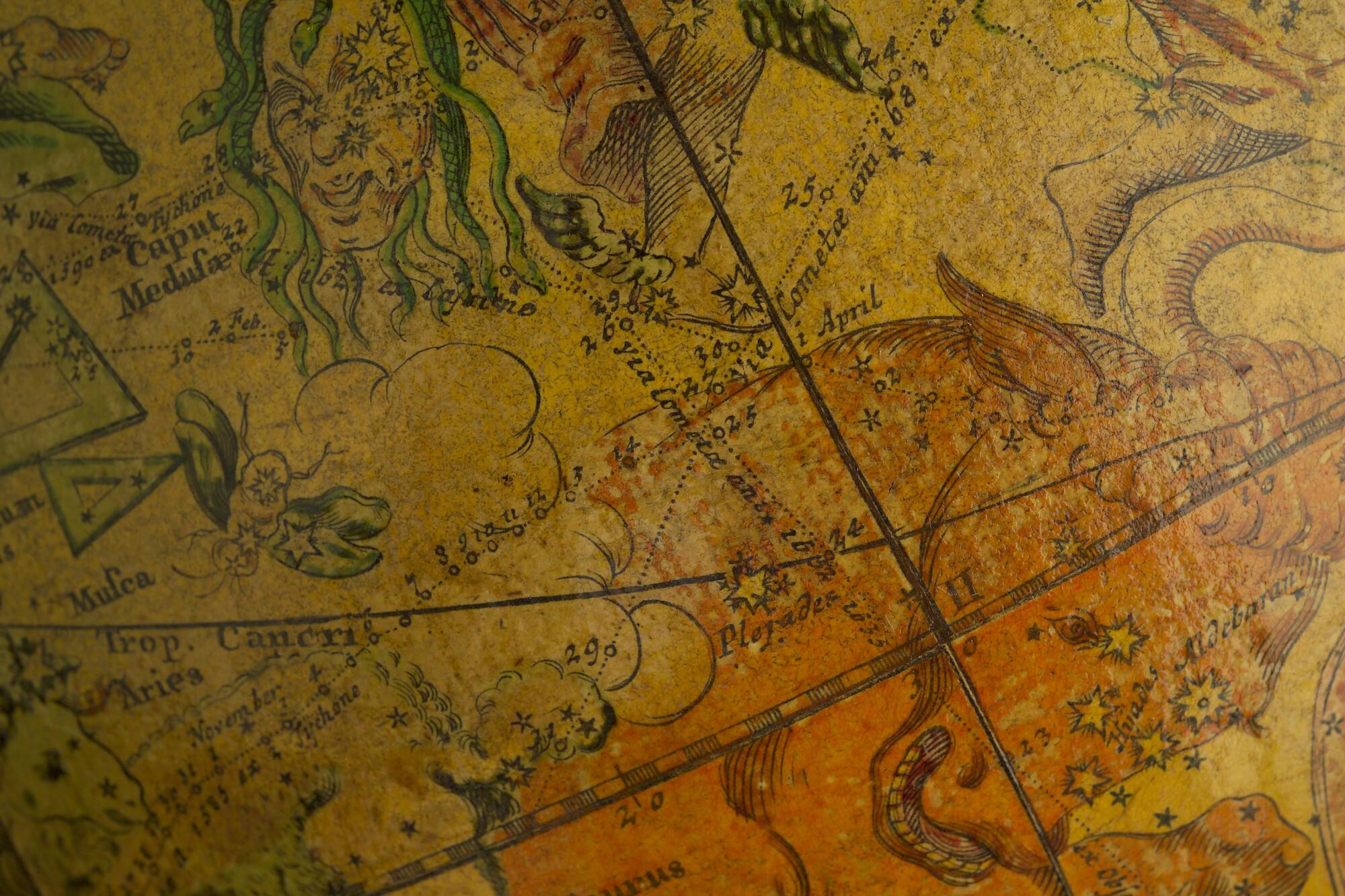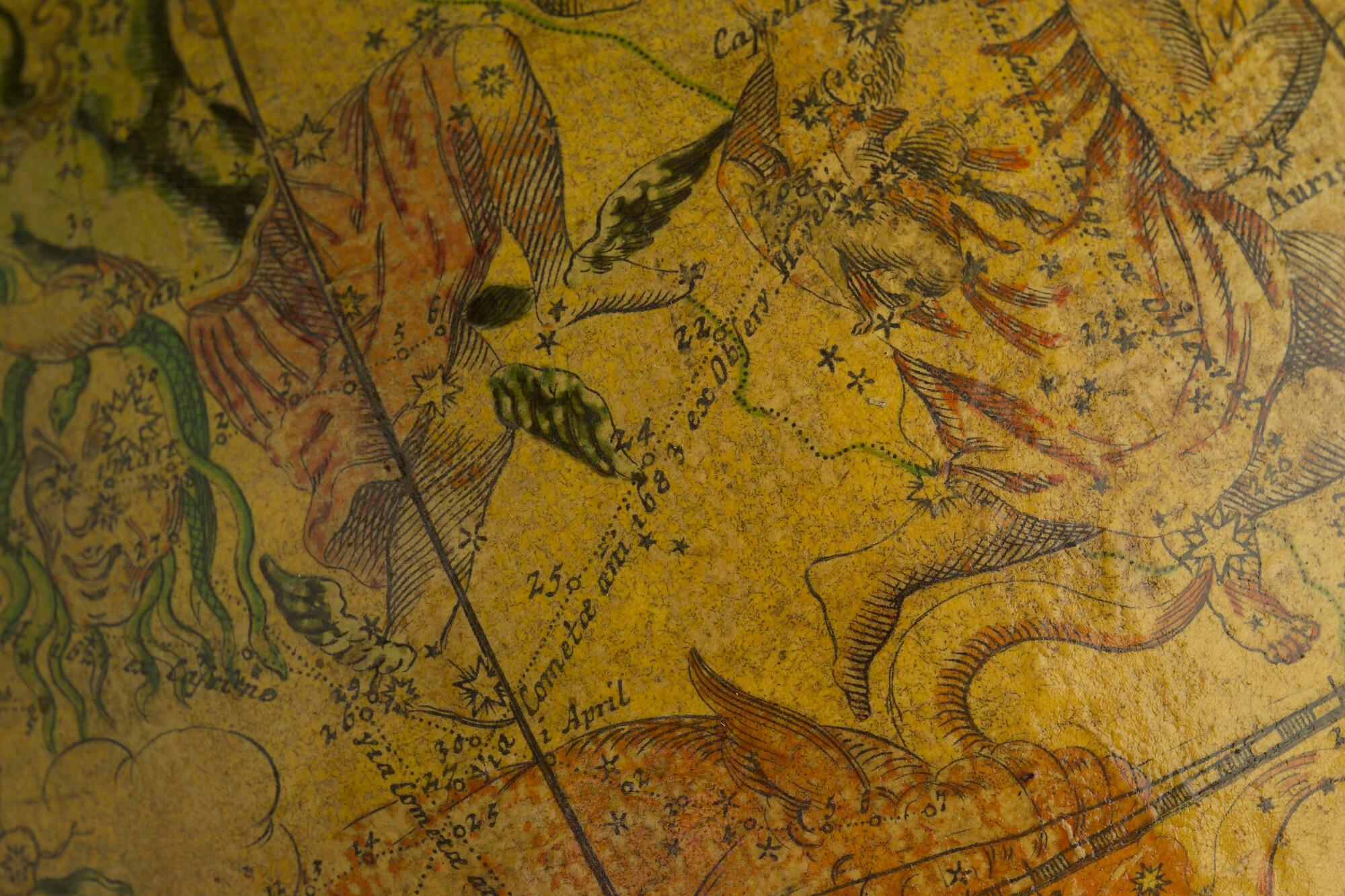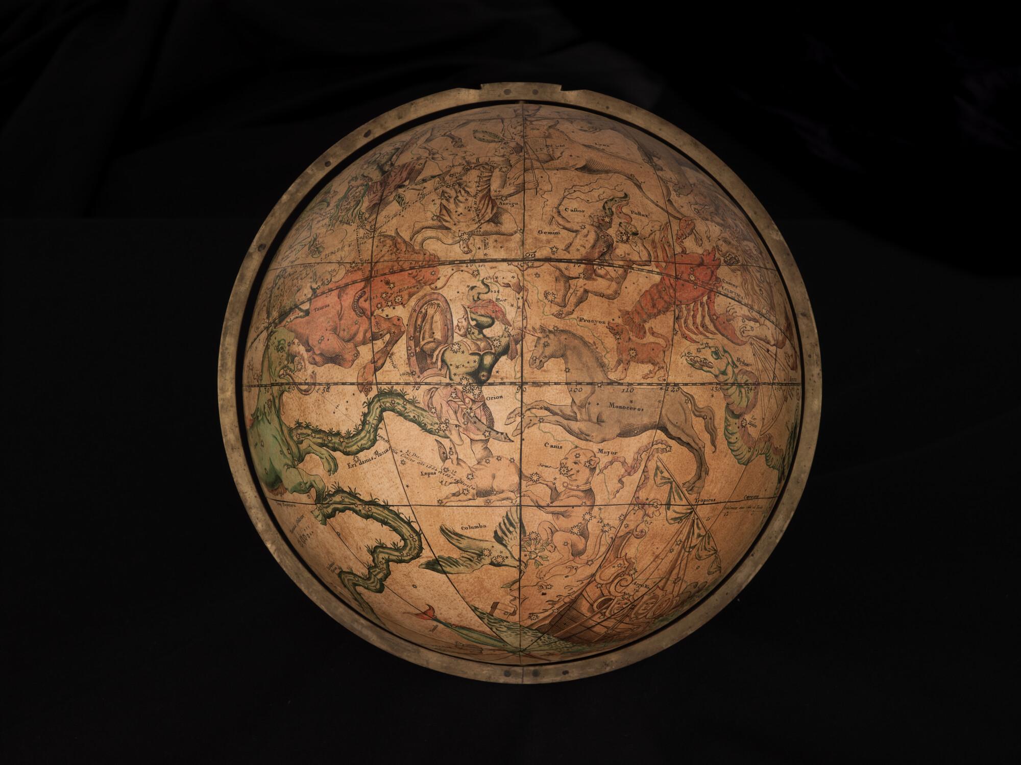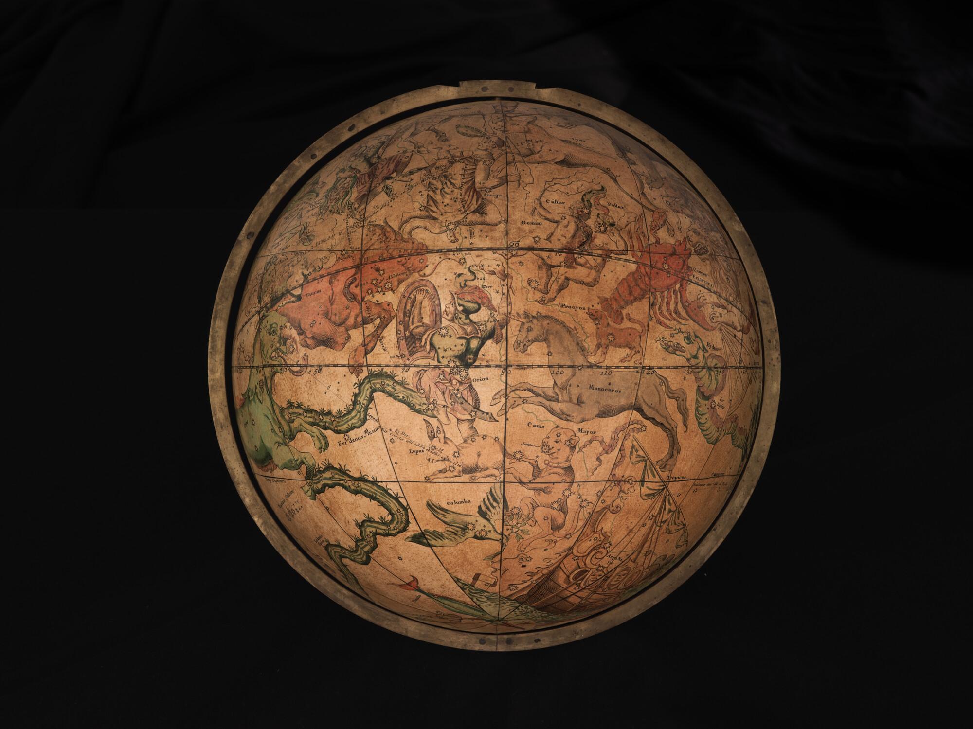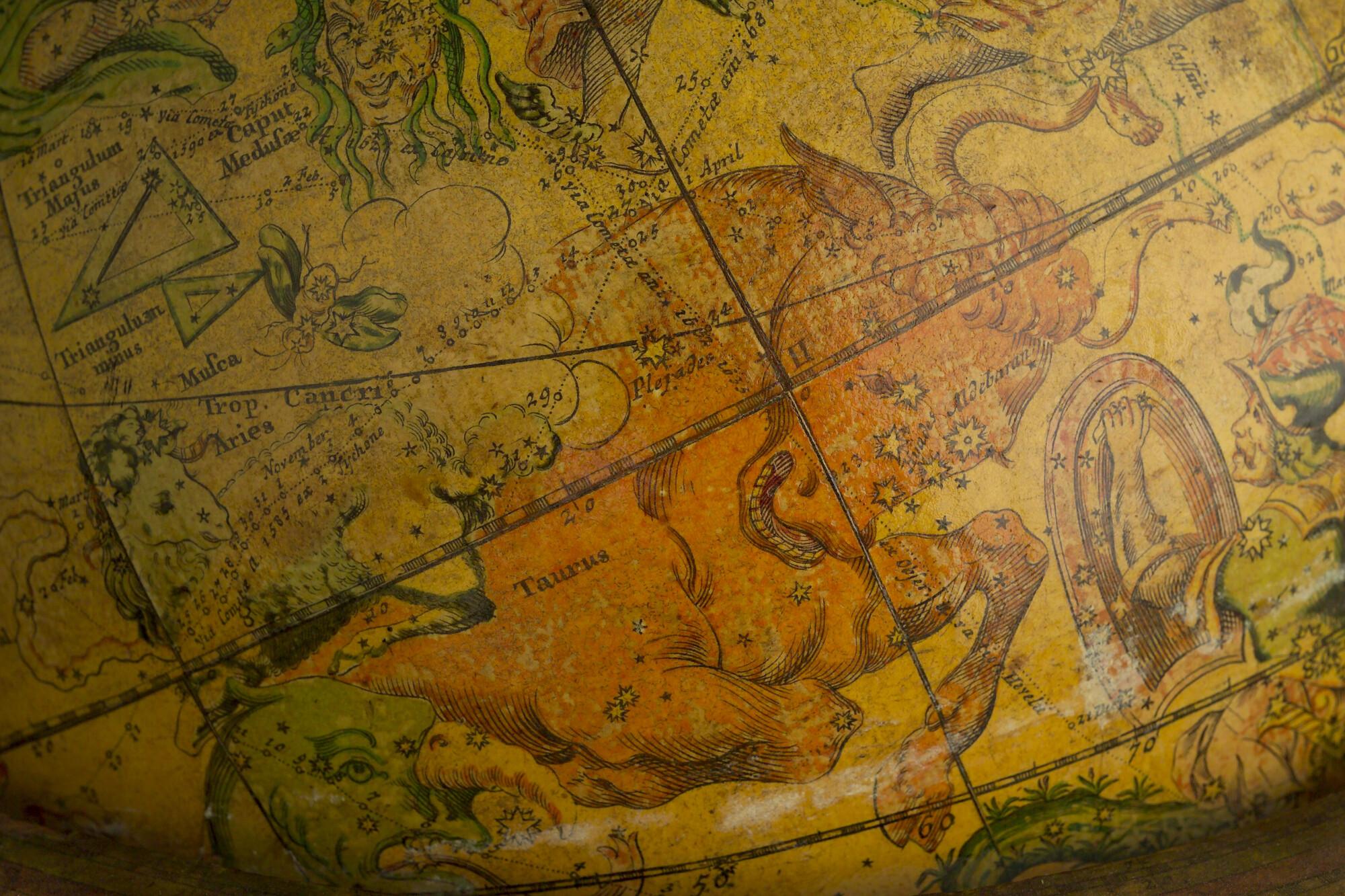 Hemelglobe van 32 cm. in doorsnede door Johann Gabriel Doppelmayer, 1728. Weergegeven is de positie van de sterren in het jaar 1730, volgens de catalogus van Johannes Hevelius. Het kompas in de basis ontbreekt.