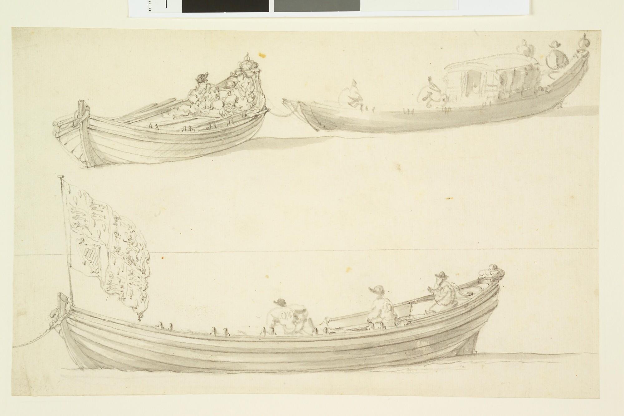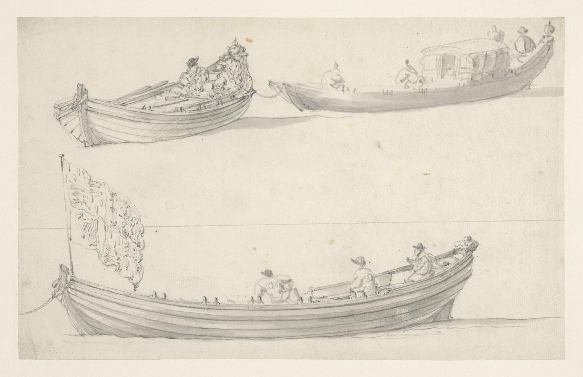 Twee roeisloepen en een glazen sloep; een van de roeisloepen voert de Engelse koninklijke standaard van de Stuarts.