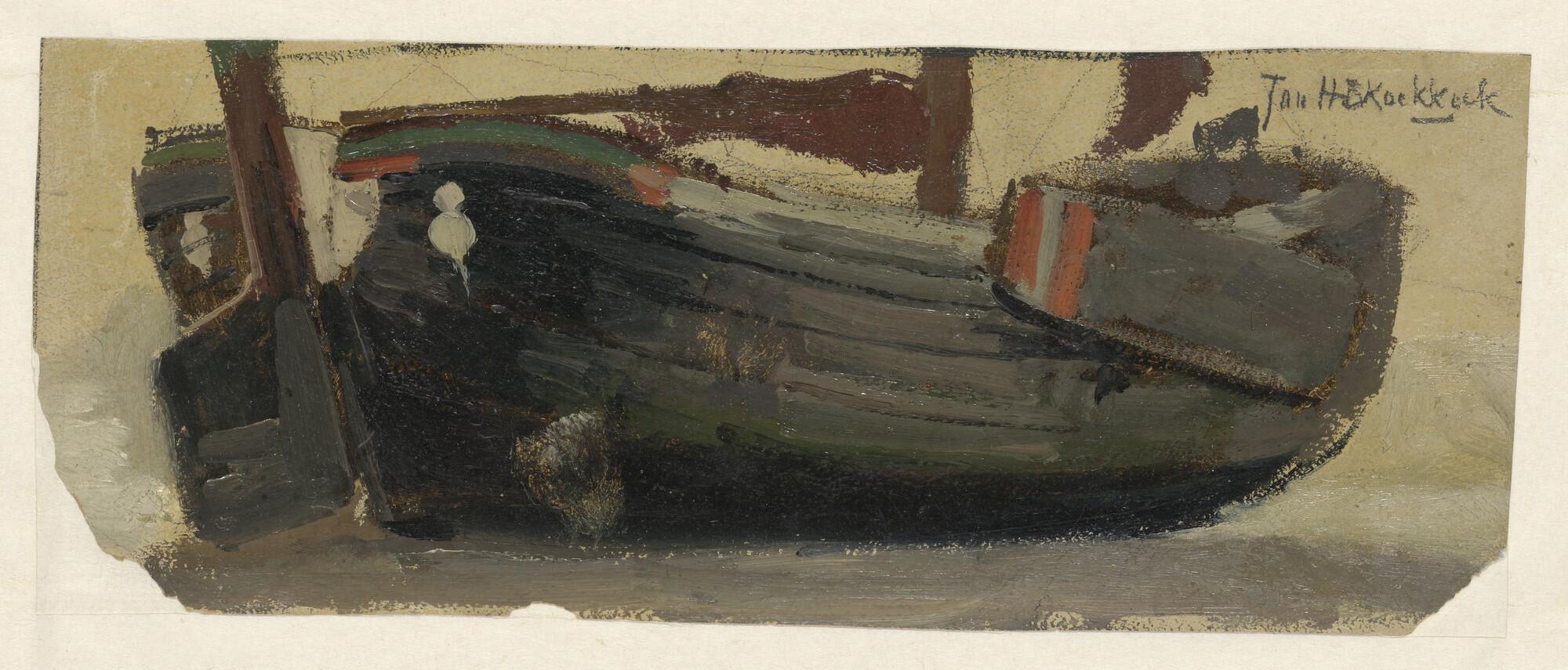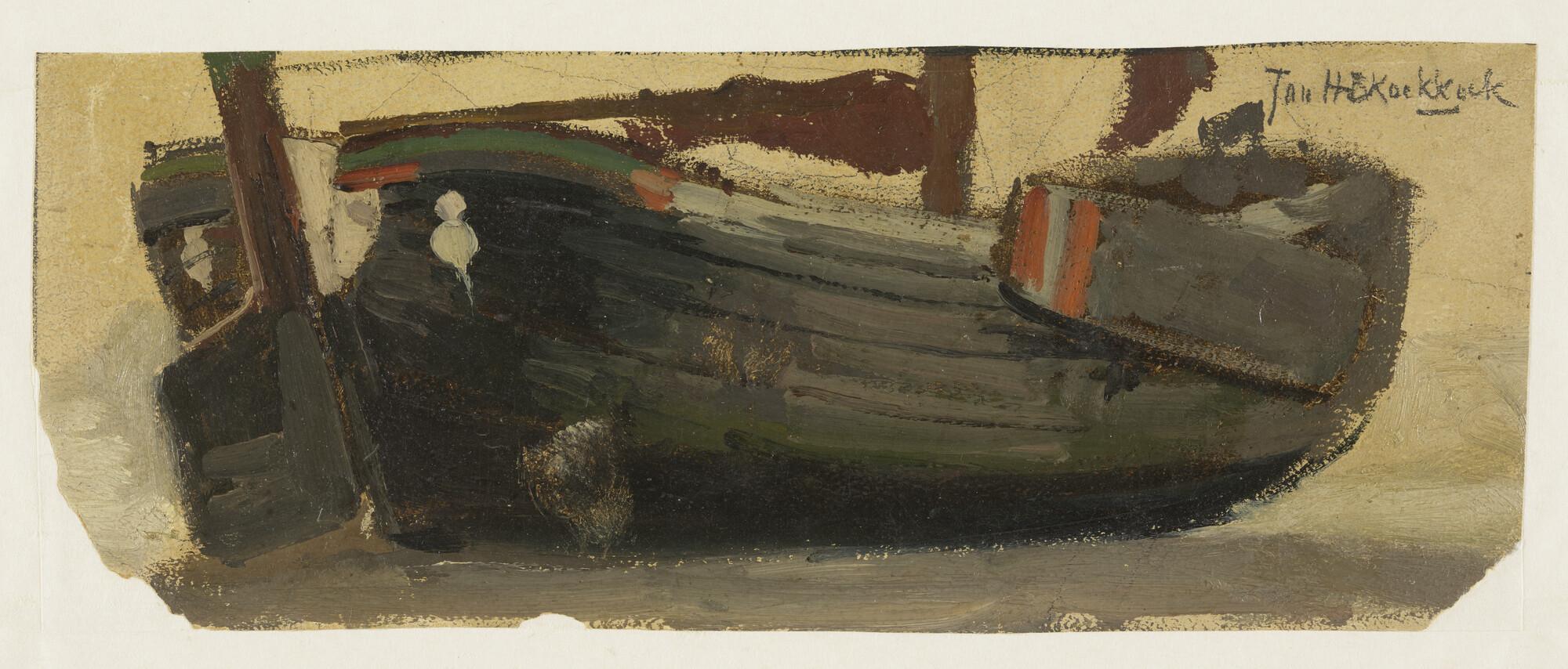 Tekening van een hektjalk bij een havenhoofd