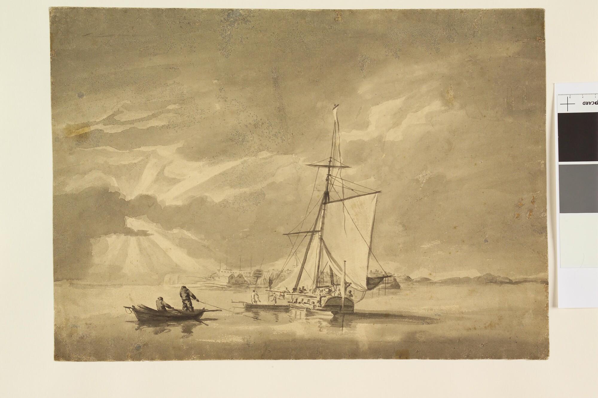 Een klein, bewapend schip aan de grond; op de achtergrond een marinewerf, mogelijk in Frankrijk.