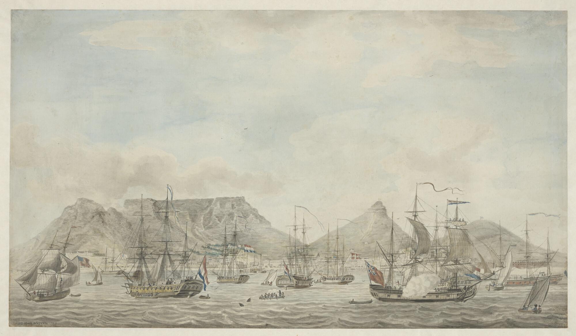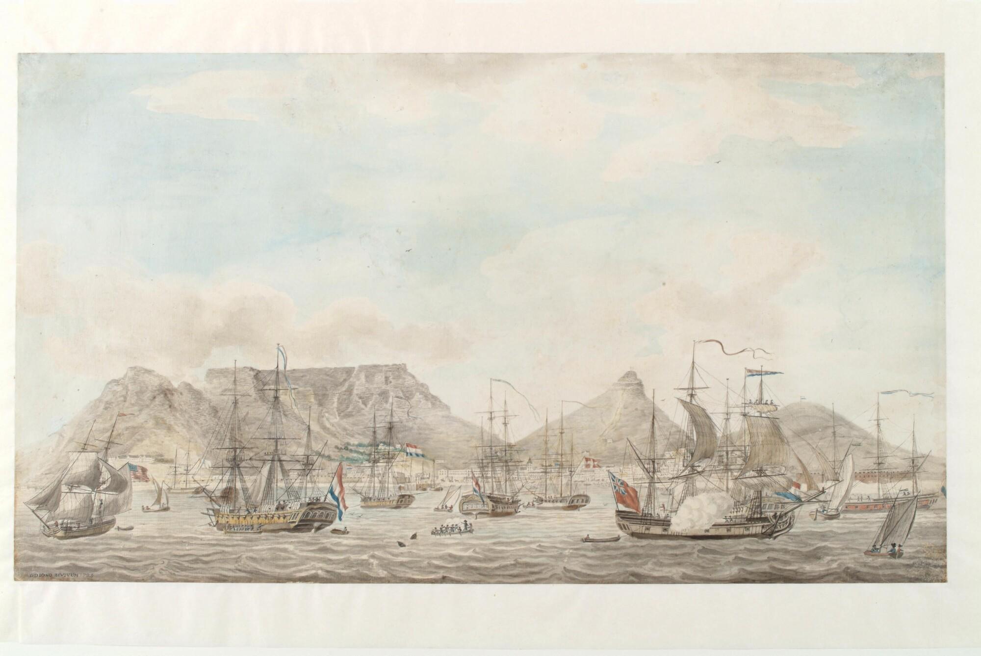 's Lands eskader onder bevel van Kapitein Cornelius de Jong ten anker op de rede van Kaapstad. Met schepen van de Verenigde Staten, Frankrijk, Denemarken en Groot Brittannië.
