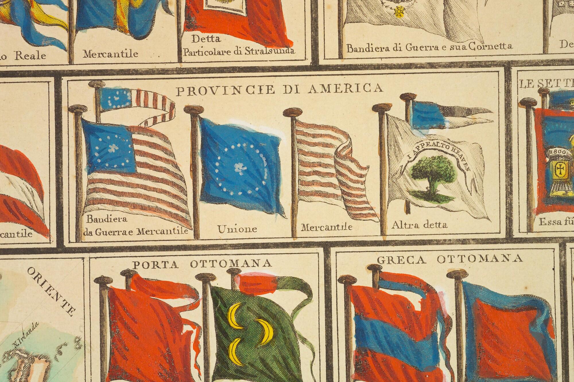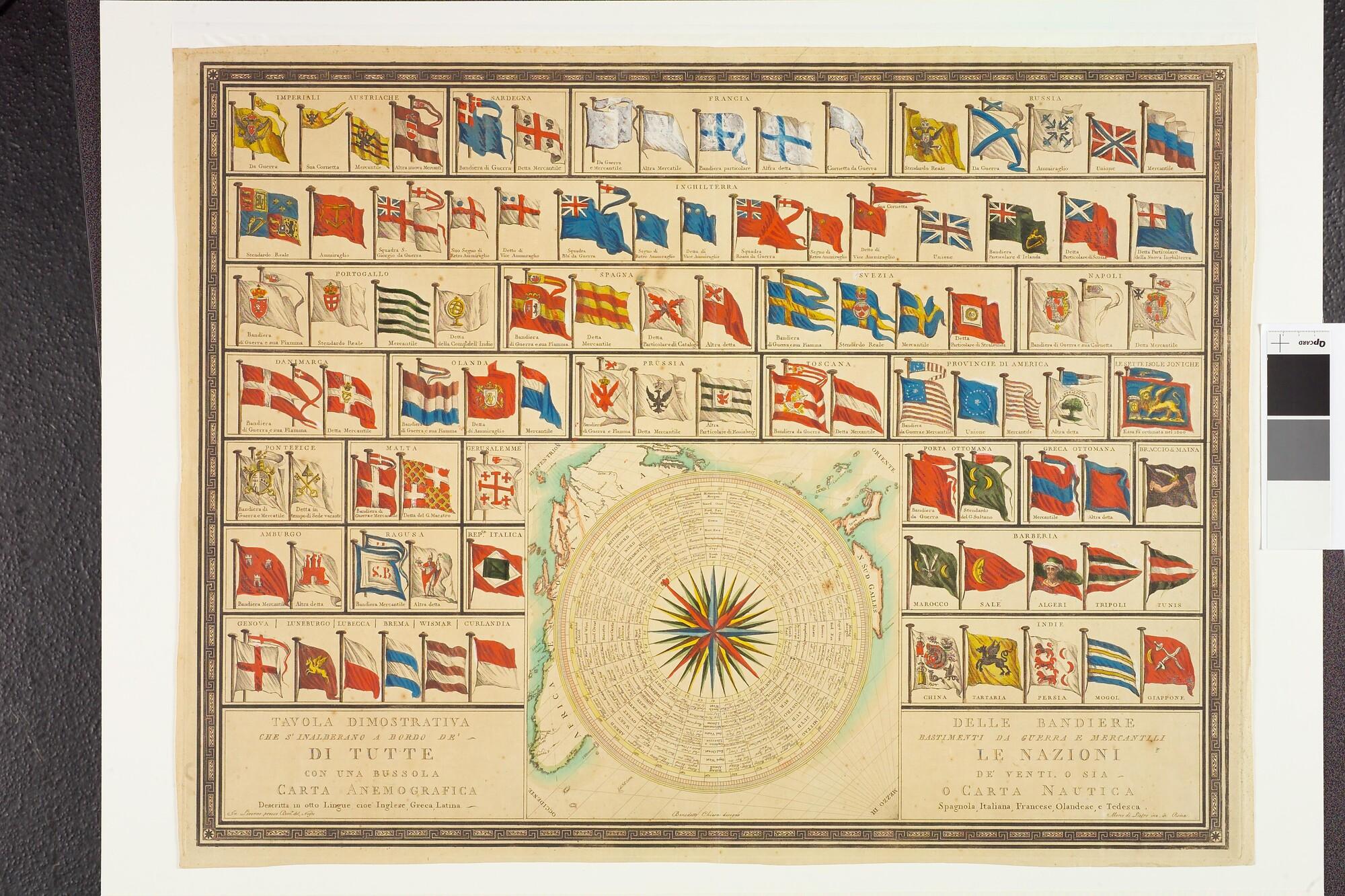 Een Italiaanse handgekleurde vlaggenkaart met 110 afbeeldingen van vlaggen en wimpels van zeevarende naties tevens een zeekaart met daarop een kompasroos in acht talen verklaard.