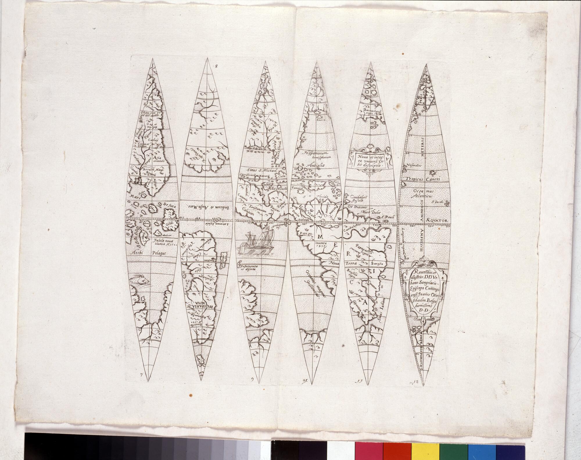 Segmenten van de aardglobe met horizonring, door Joannes Oterschaden, circa 1600. De globe is opgedragen aan Urbain de Saint-Gelais, bisschop van Comminges van 1580 tot 1613(schaal 1:71.000.000).
