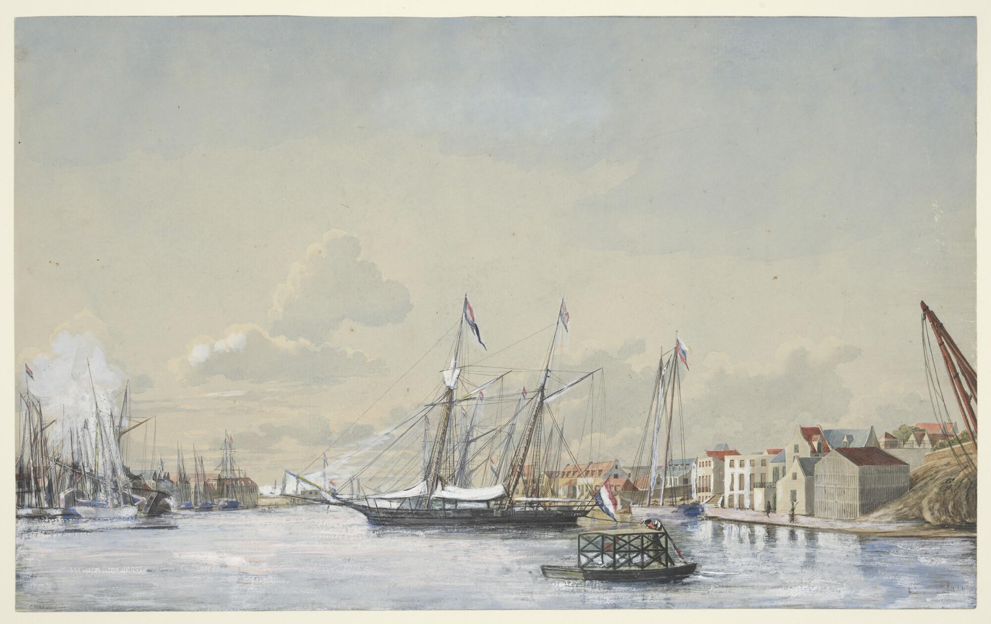 De haven van Curaçao met de drie Nederlandse oorlogsschoeners, Hr.Ms."Wesp", Hr.Ms. "Schorpioen" en Hr.Ms. "Arend", op devoorgrond een pontje.