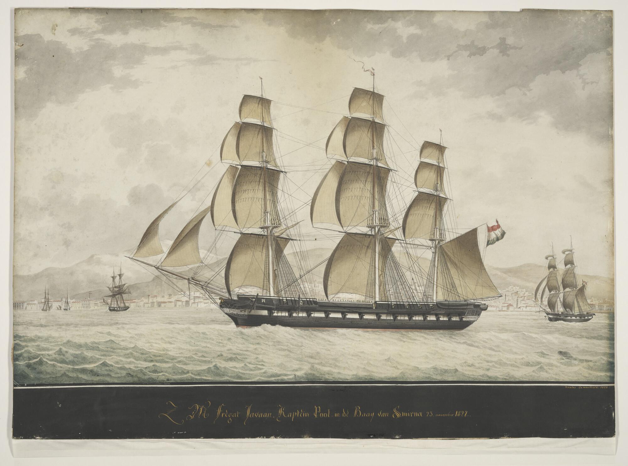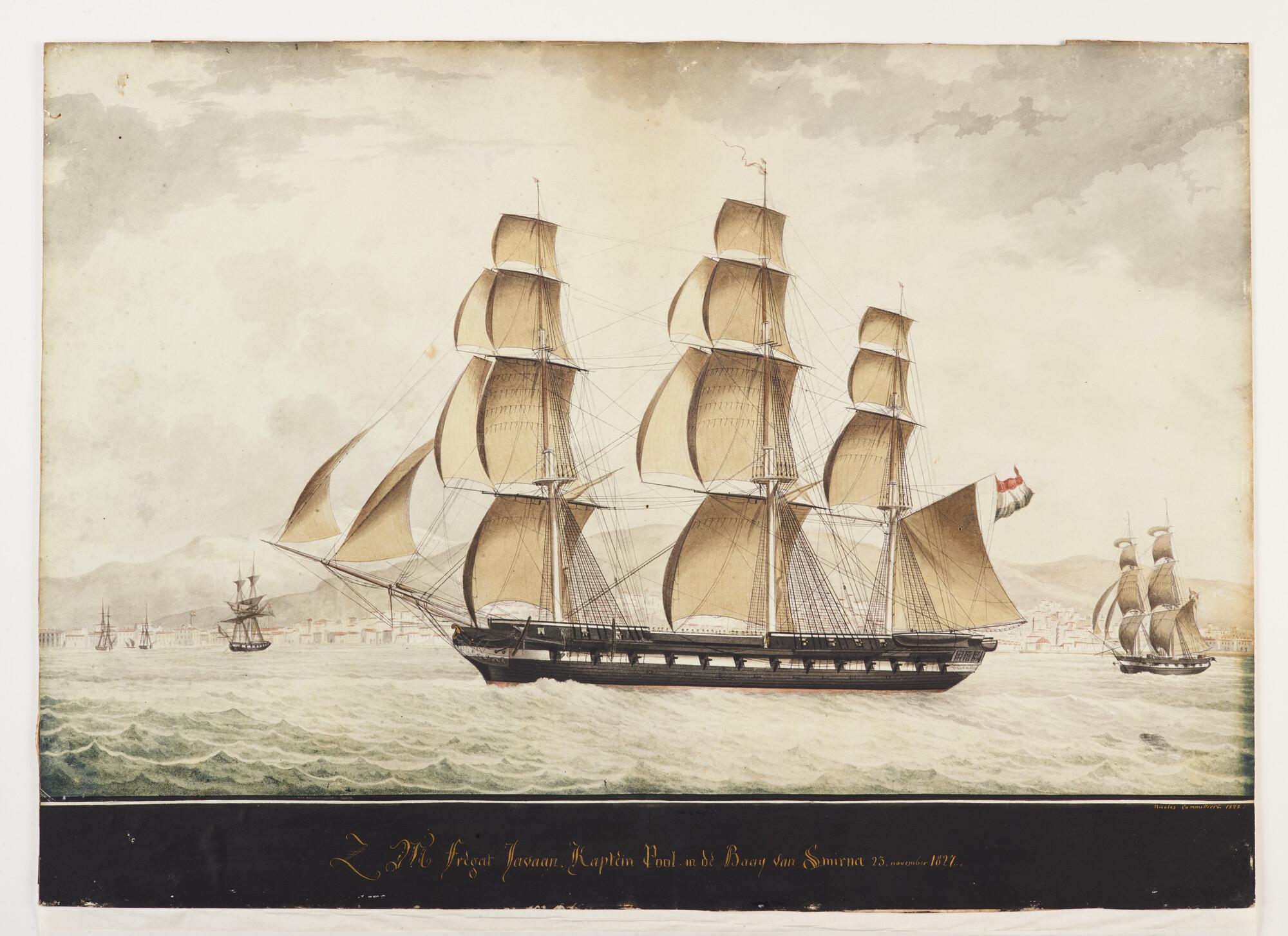 Het fregat Zr.Ms. Javaan zeilend in de baai van Smirna op 28 november 1827.