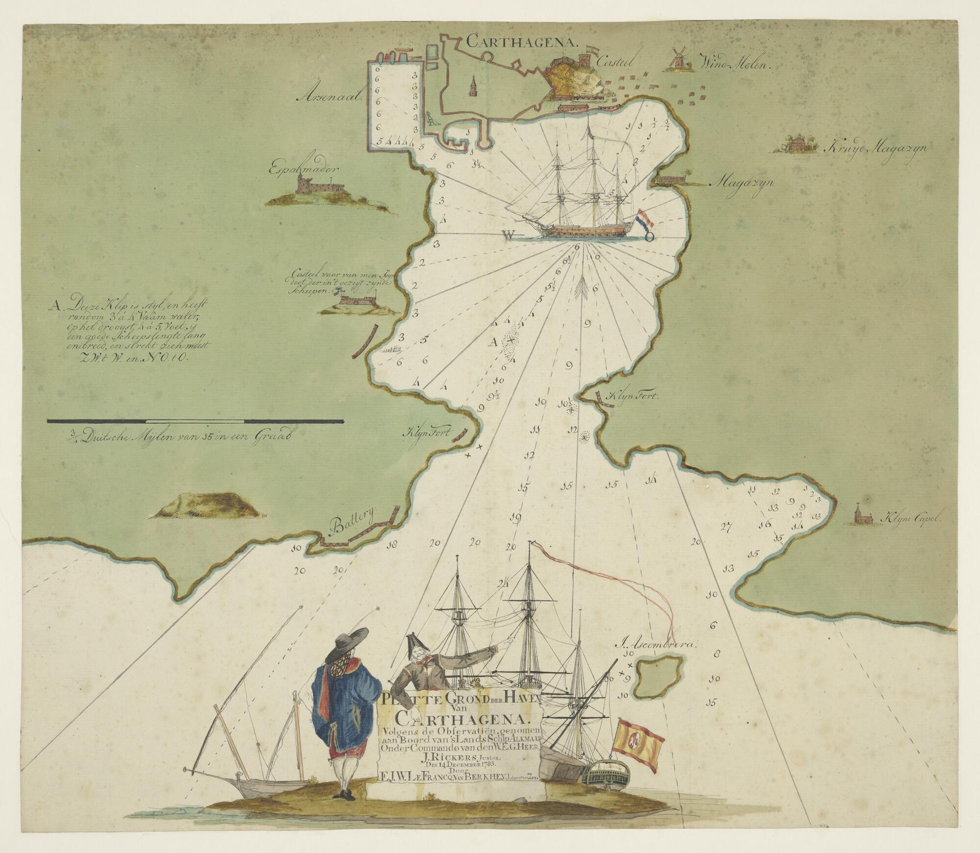 Gekleurde handschrift plattegrond van de haven van Cartagena in Spanje, in december 1785 opgenomen door E.J.W. le Francq van Berkhey op de "Alkmaar" onder J. Rickers jr.