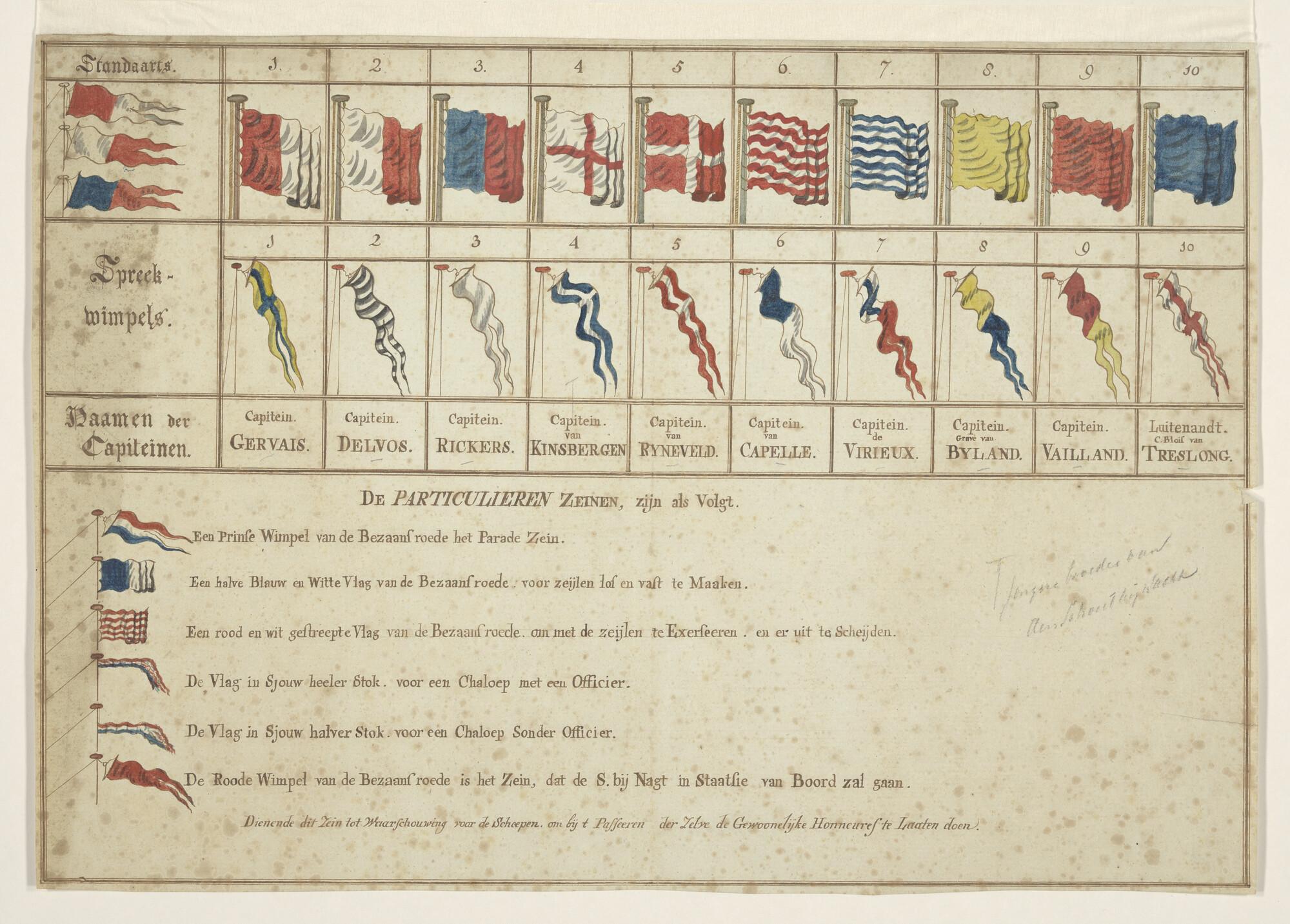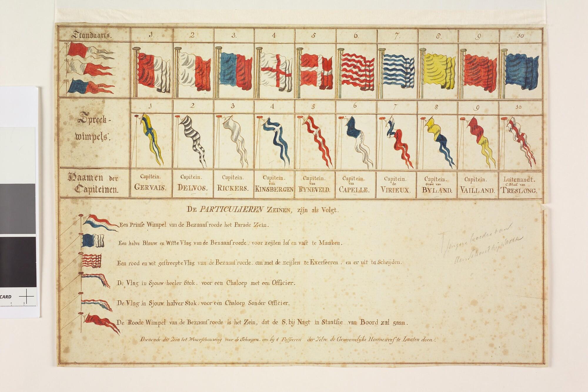 Seinvlaggen, spreekwimpels der kapiteins (persoonlijke naamvlag van de kapitein) en bijzondere seinen, gebruikt door het eskader naar de Middellandse Zee, onder bevel van Schout bij Nacht J.H. van Van Kinsbergen, 1784 - 1786.