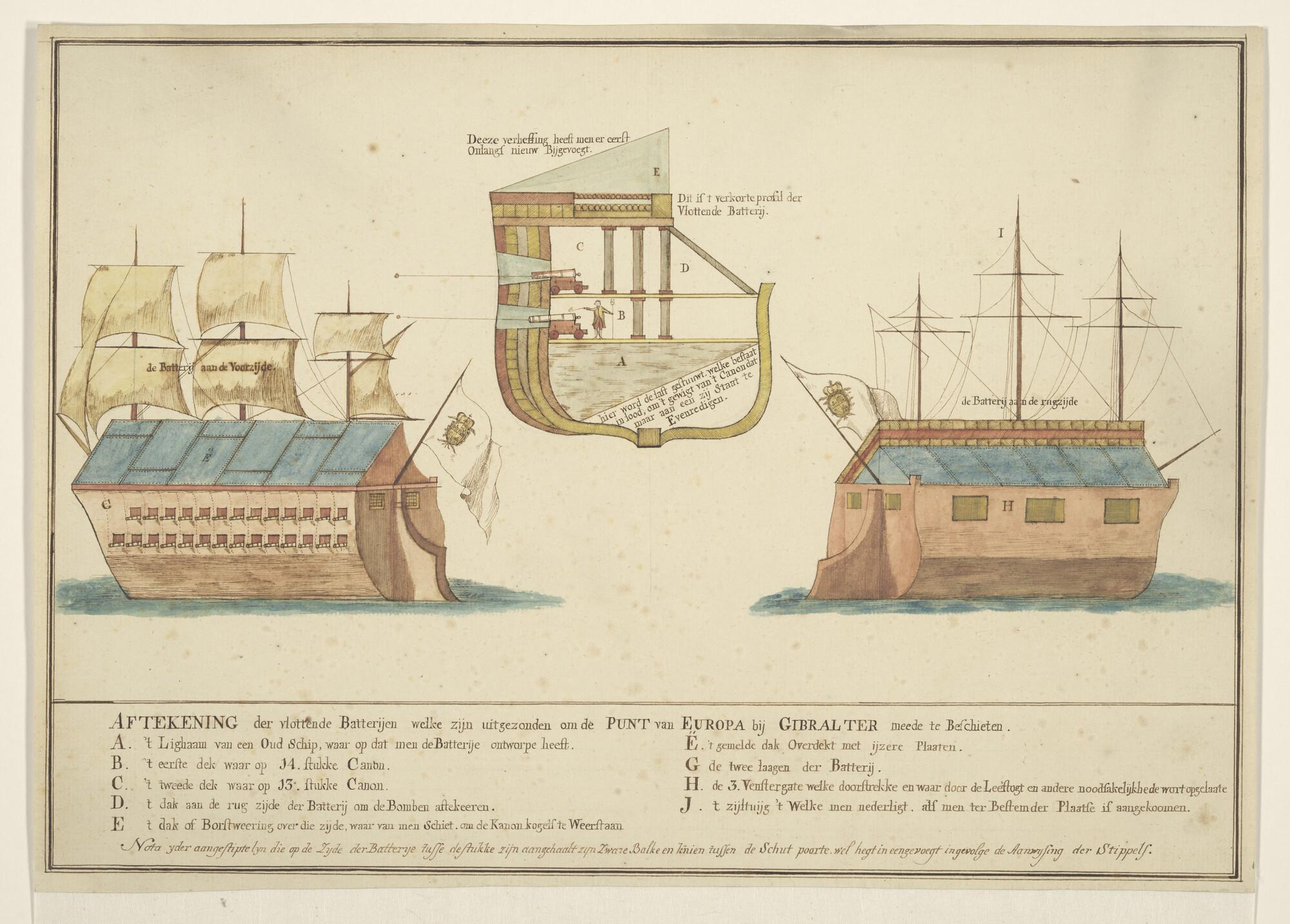 Een Spaanse drijvende batterij van drie zijden gezien, gebruikt bij het beleg van Gibraltar, 1779 - 1782.