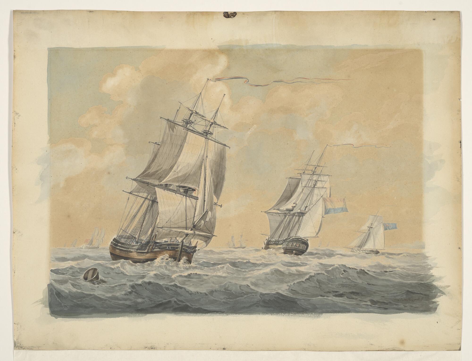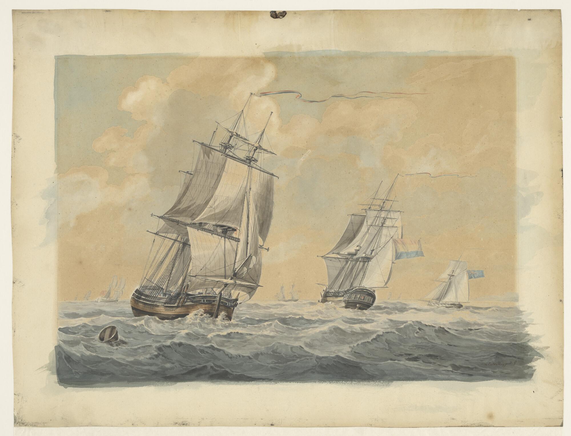 Een driemastkofschip, een fregatschip en een Engelse kotter