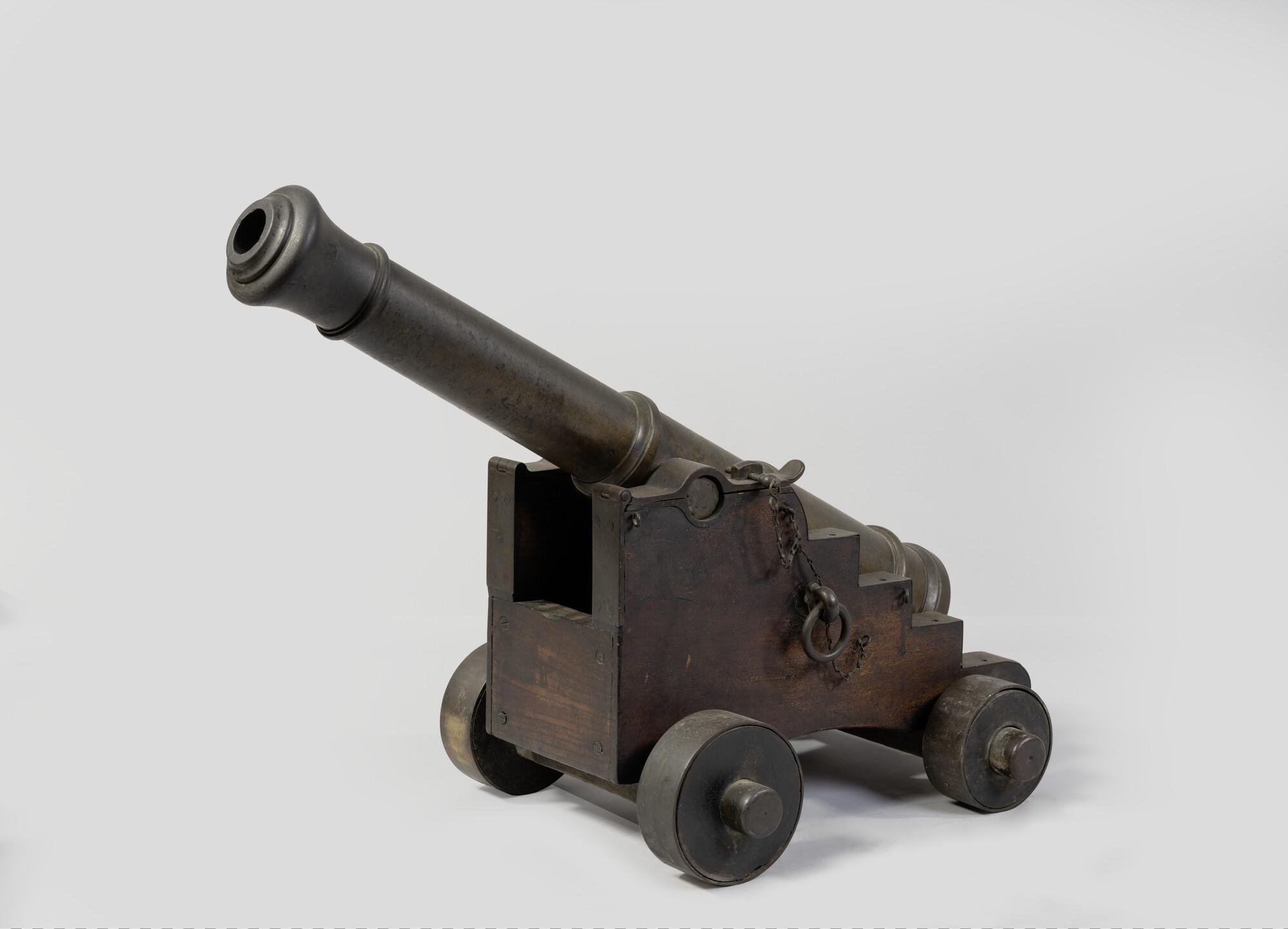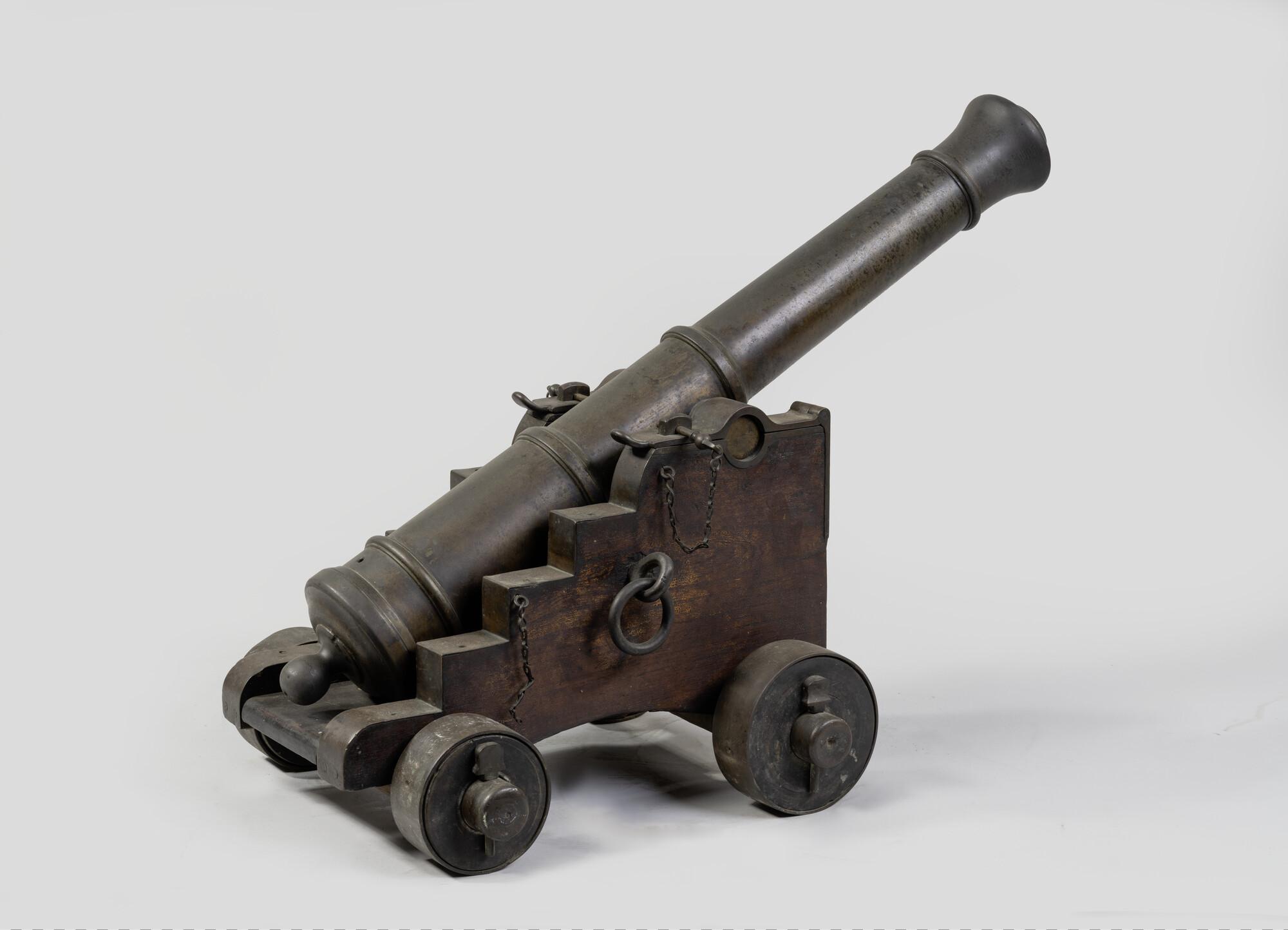 Bronzen scheepskanon op rolpaard.