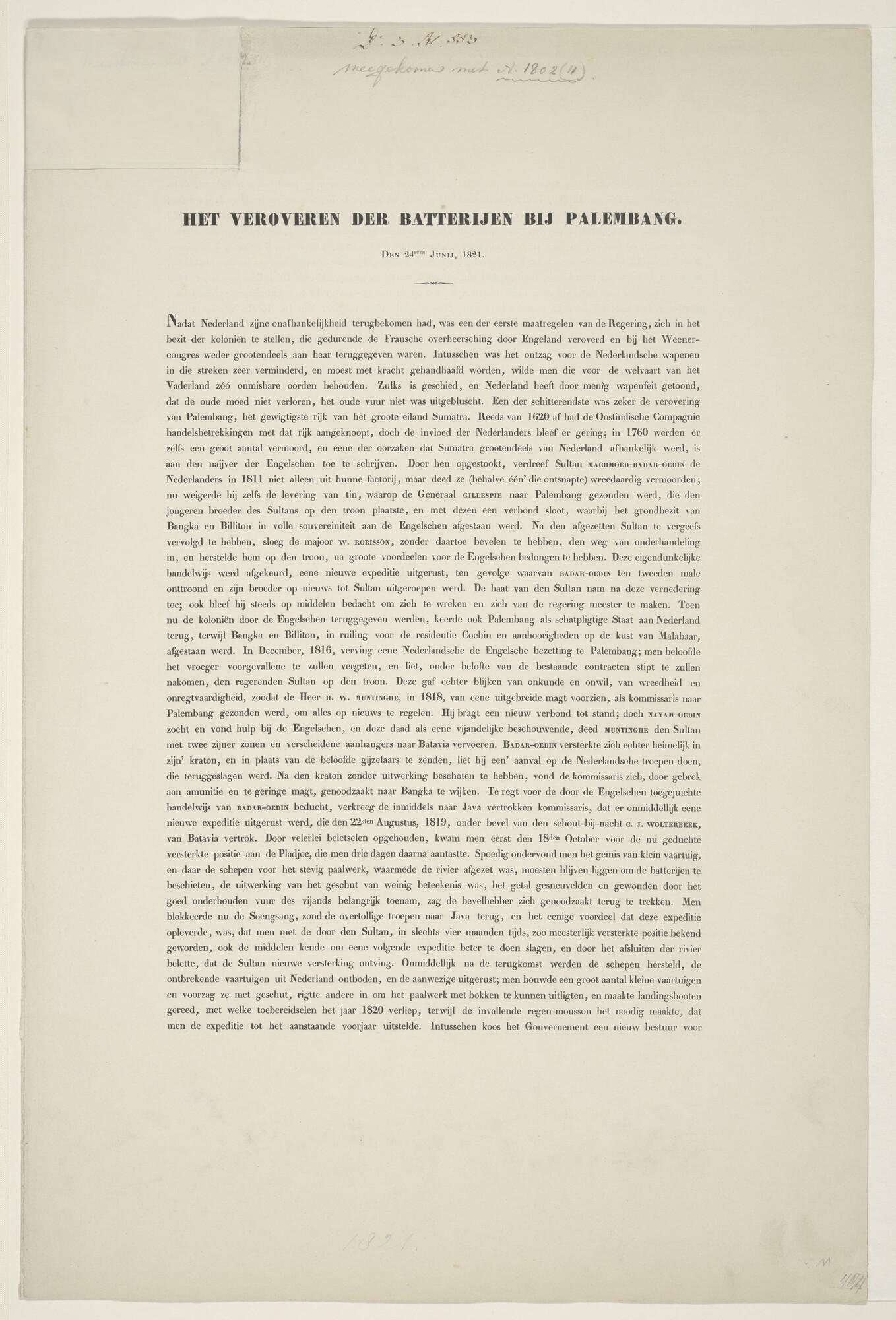 Toelichting van 4 pagina's bij de prent door P.J. Schotel van de verovering van de batterijen bij Palembangijen bij Palembang op 24 Juni 1821.