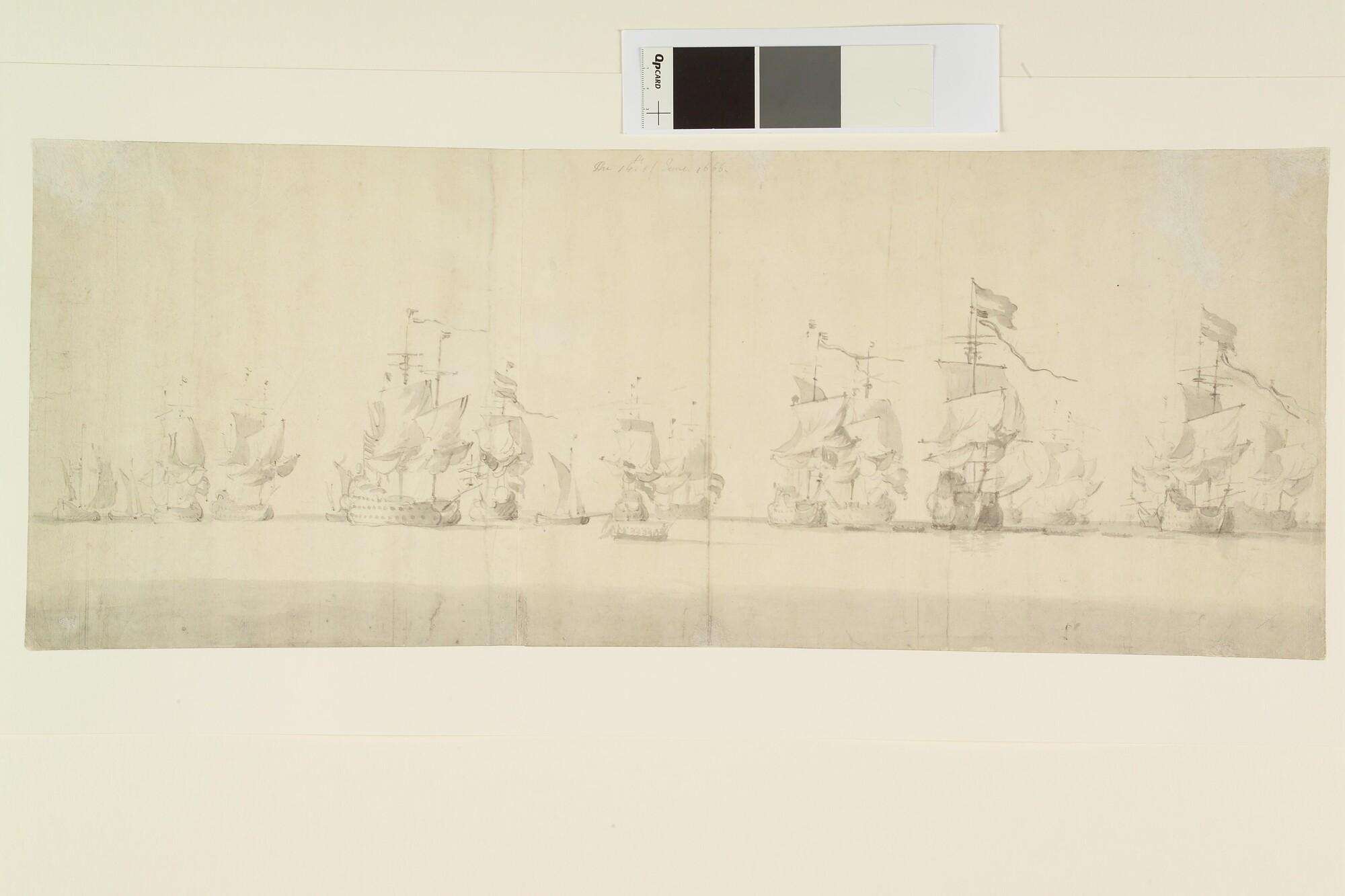 De vierde dag van de Vierdaagse Zeeslag, 14 juni 1666: de Nederlandse vloot, bijgedraaid liggende.