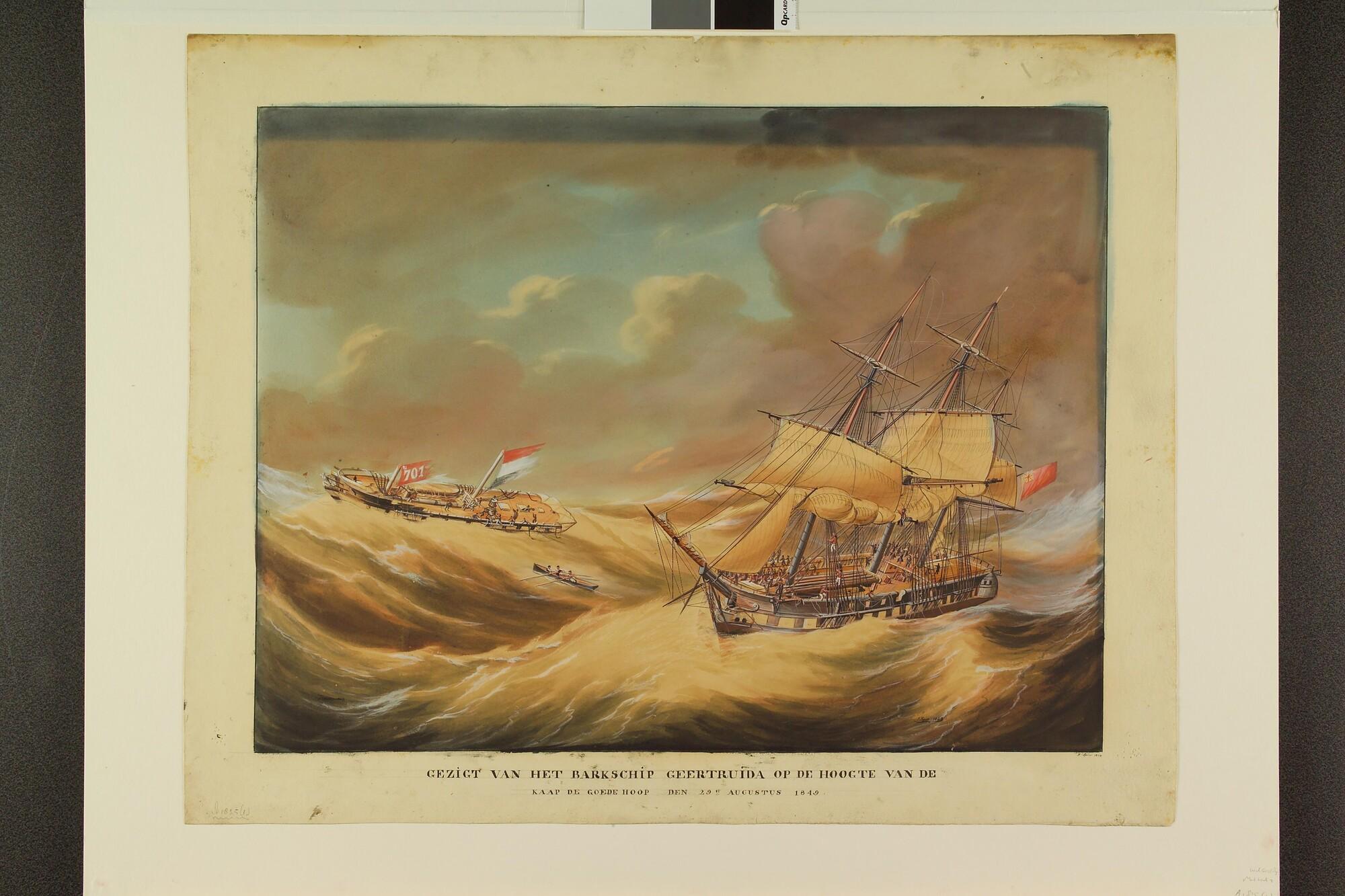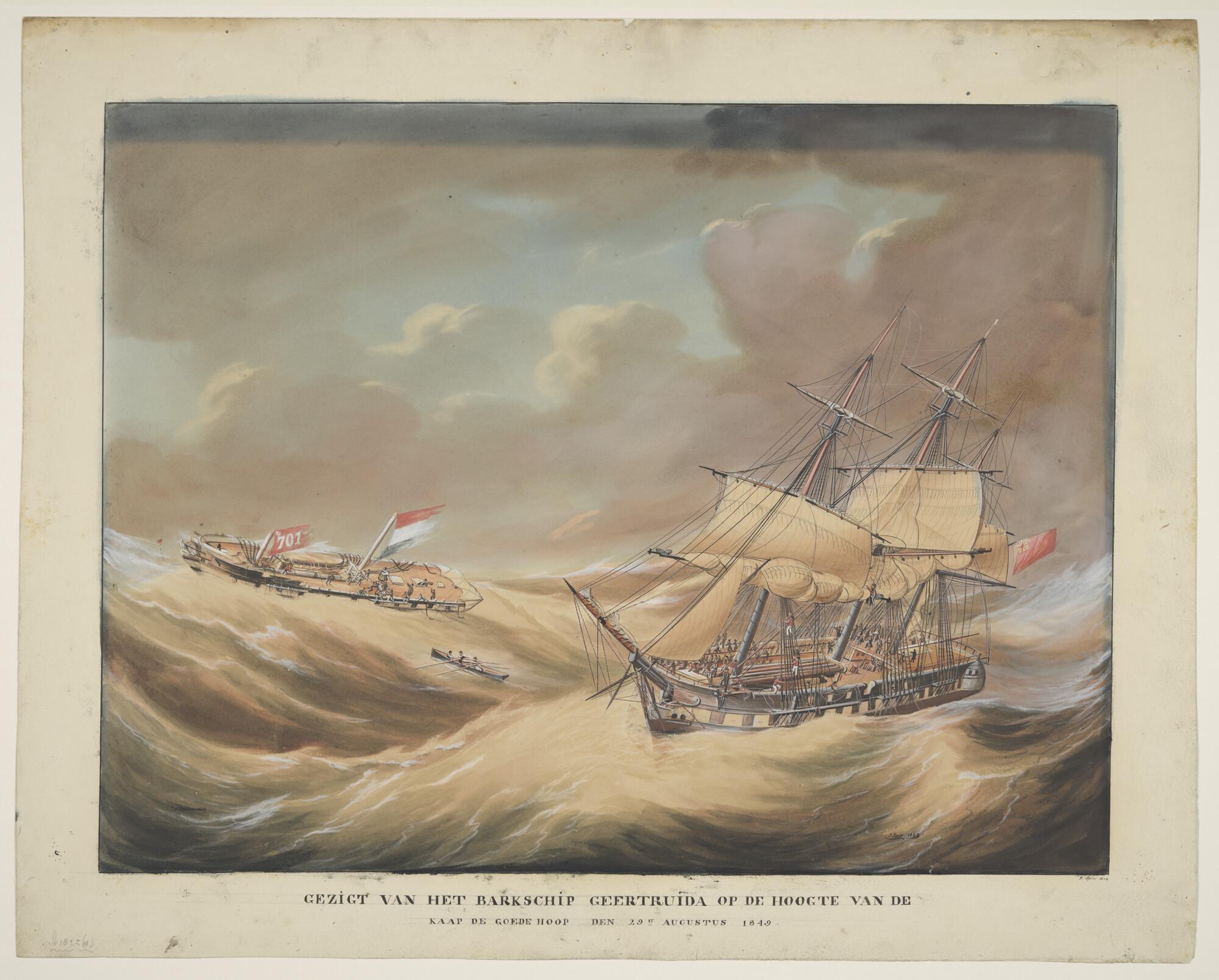 Het barkschip "Geertruida" schipbreuk lijdend; op de voorgrond een Brits schip dat hulp biedt