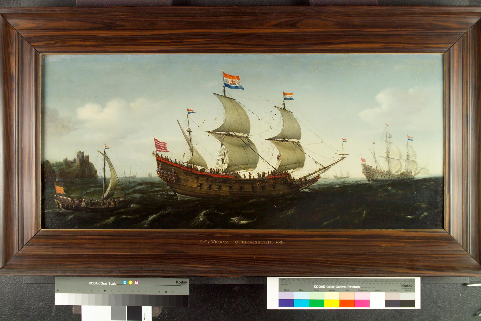 Schilderij in lijst van een Nederlands pinasschip onder zeil nabij een rotsachtige kust.