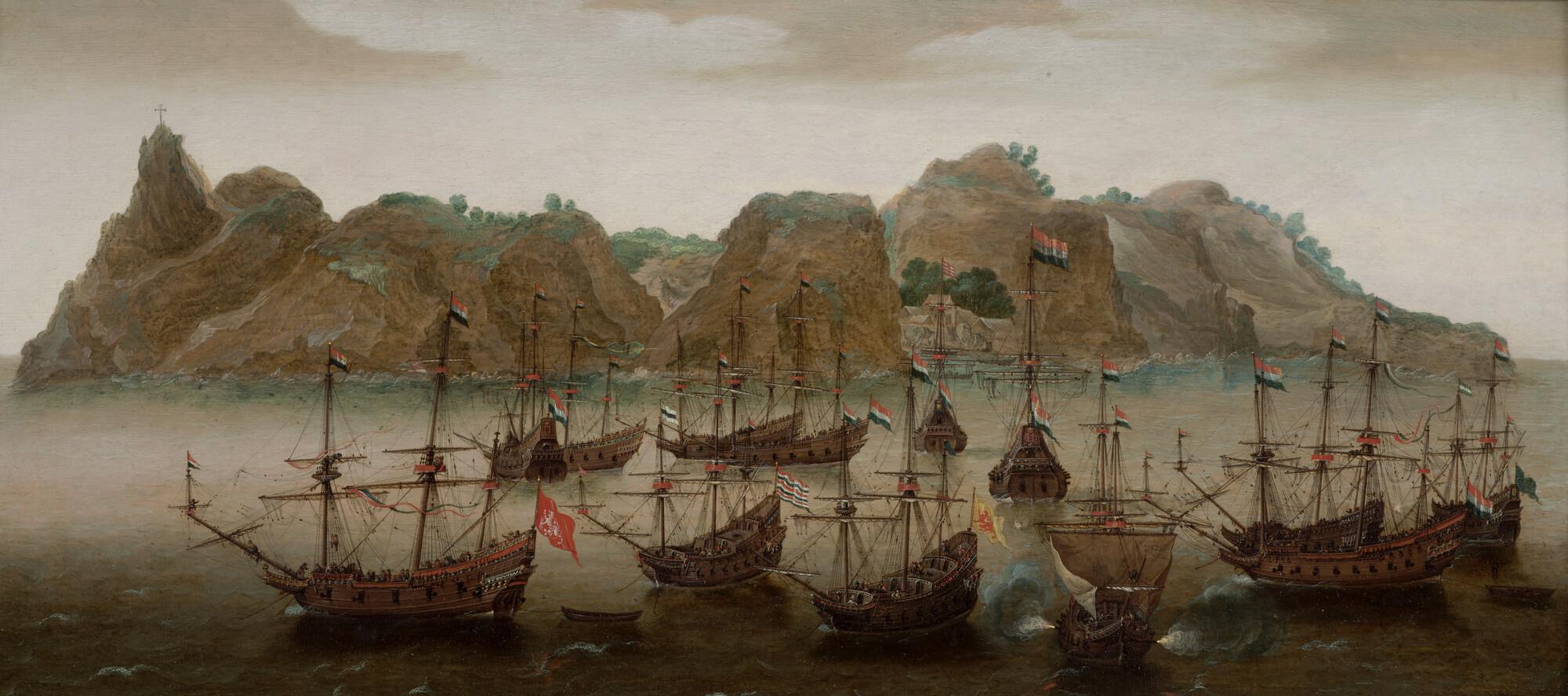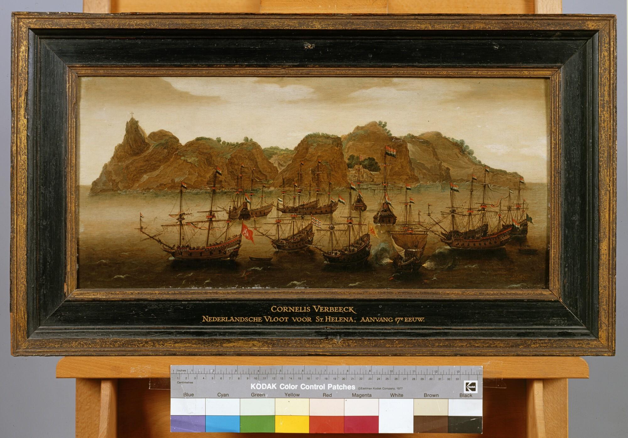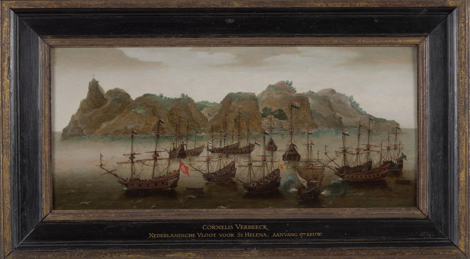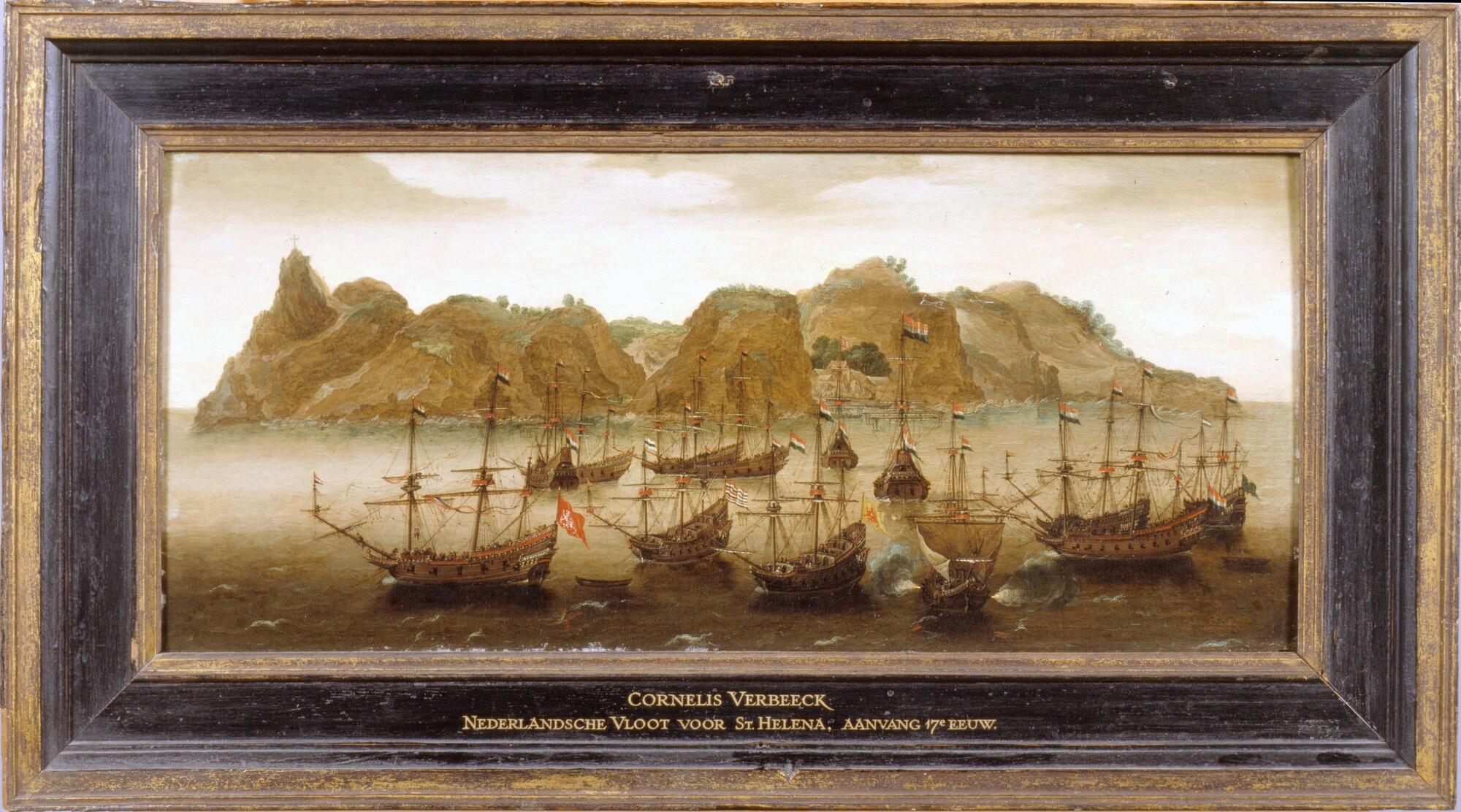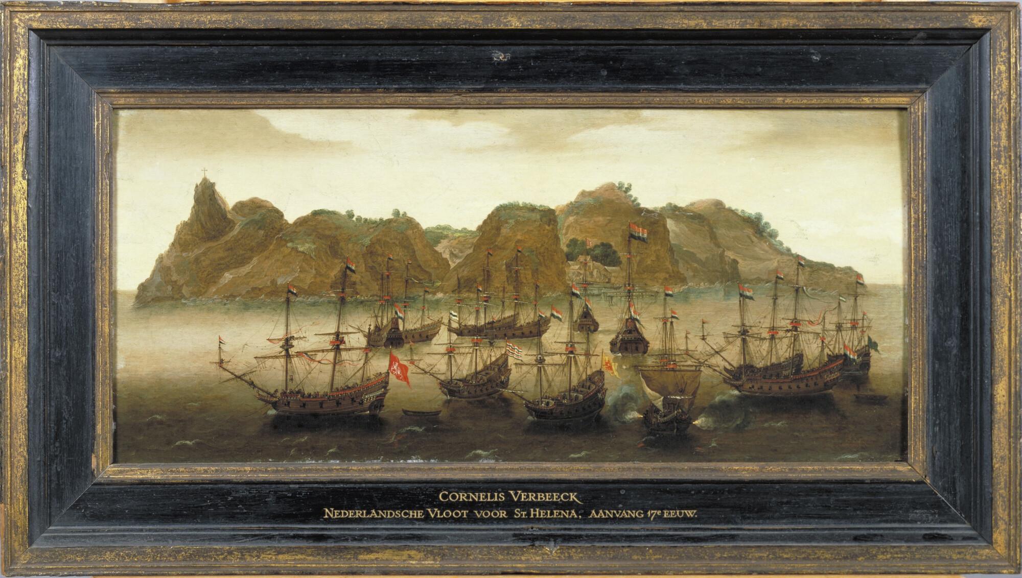 Een retourvloot ter rede van St. Helena. In lijst.