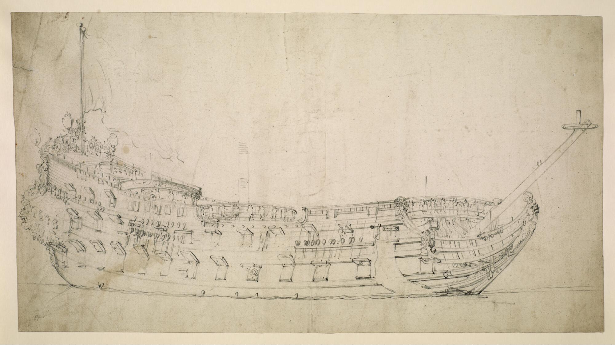 Romp van een, vermoedelijk Engels, oorlogsschip.