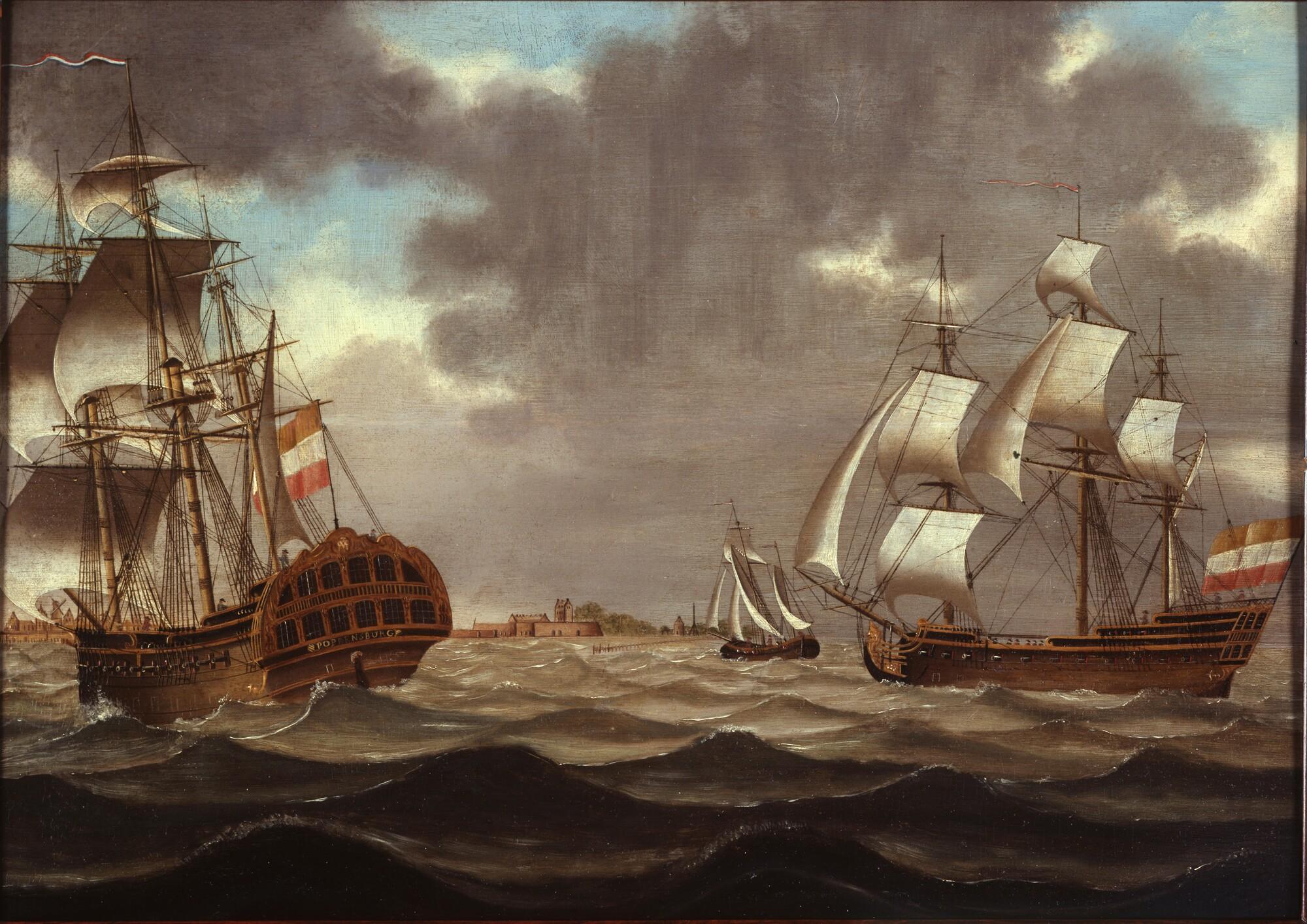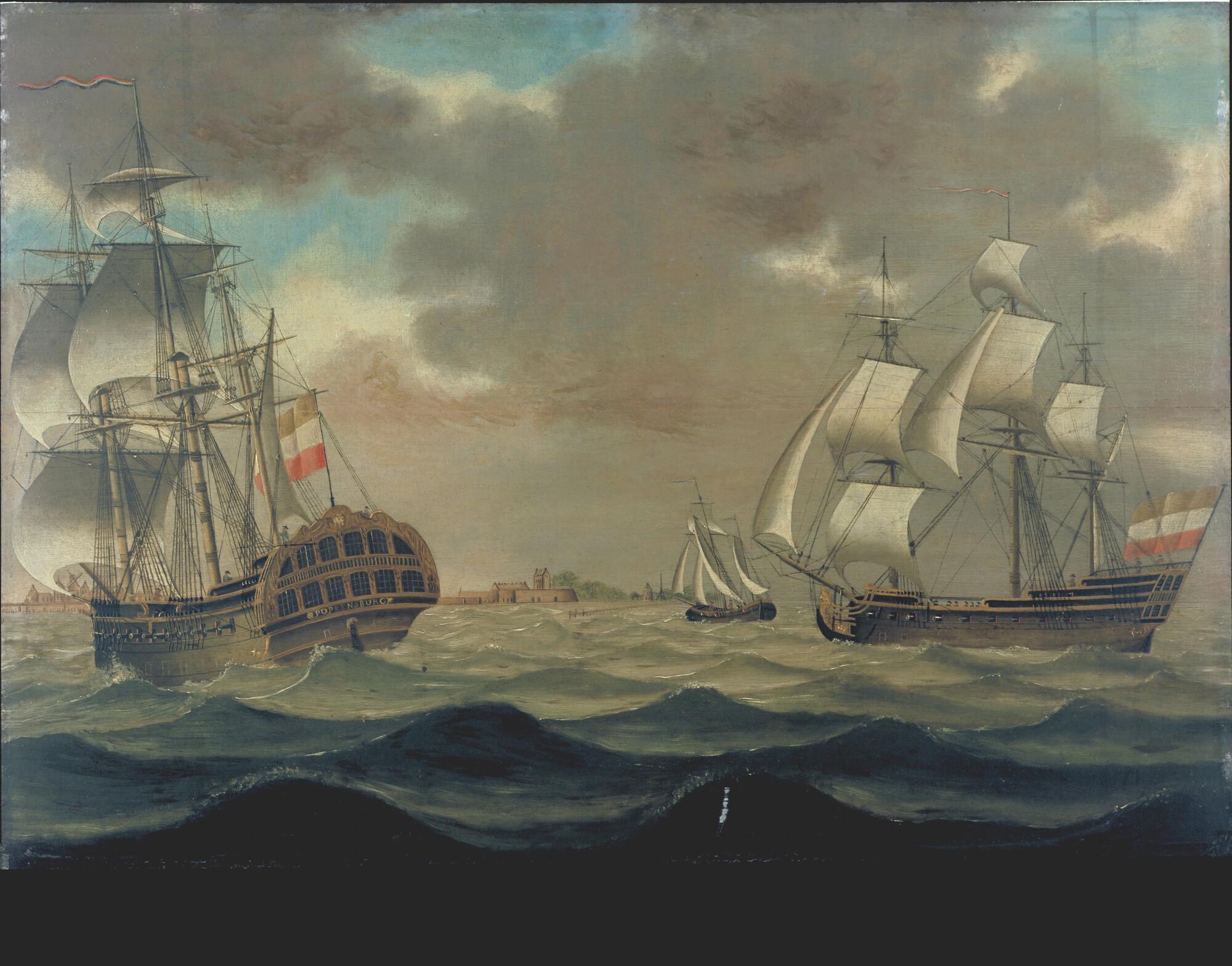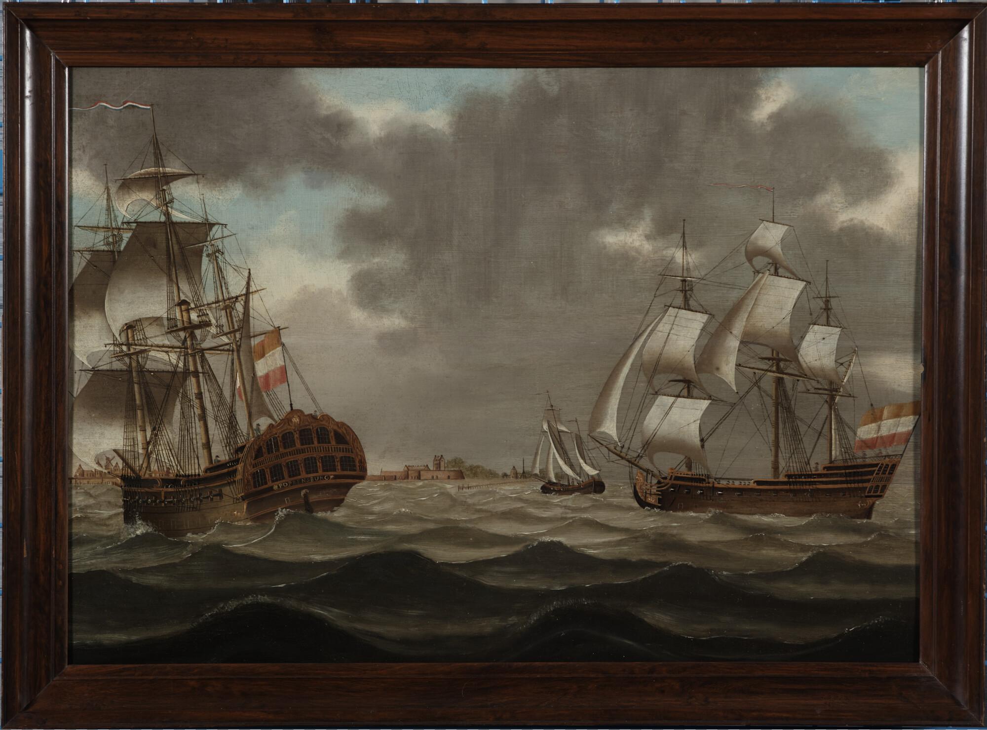 Het retourschip Popkensburg van de Kamer Middelburg van de VOC op de Westerschelde ter hoogte van het fort Rammekens.