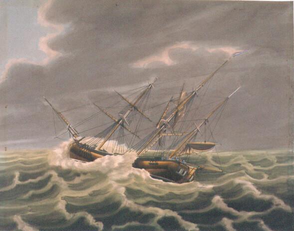 De Cocordia in stormweer op 29 november 1836 op 10 mijl ten N.W. van Texel