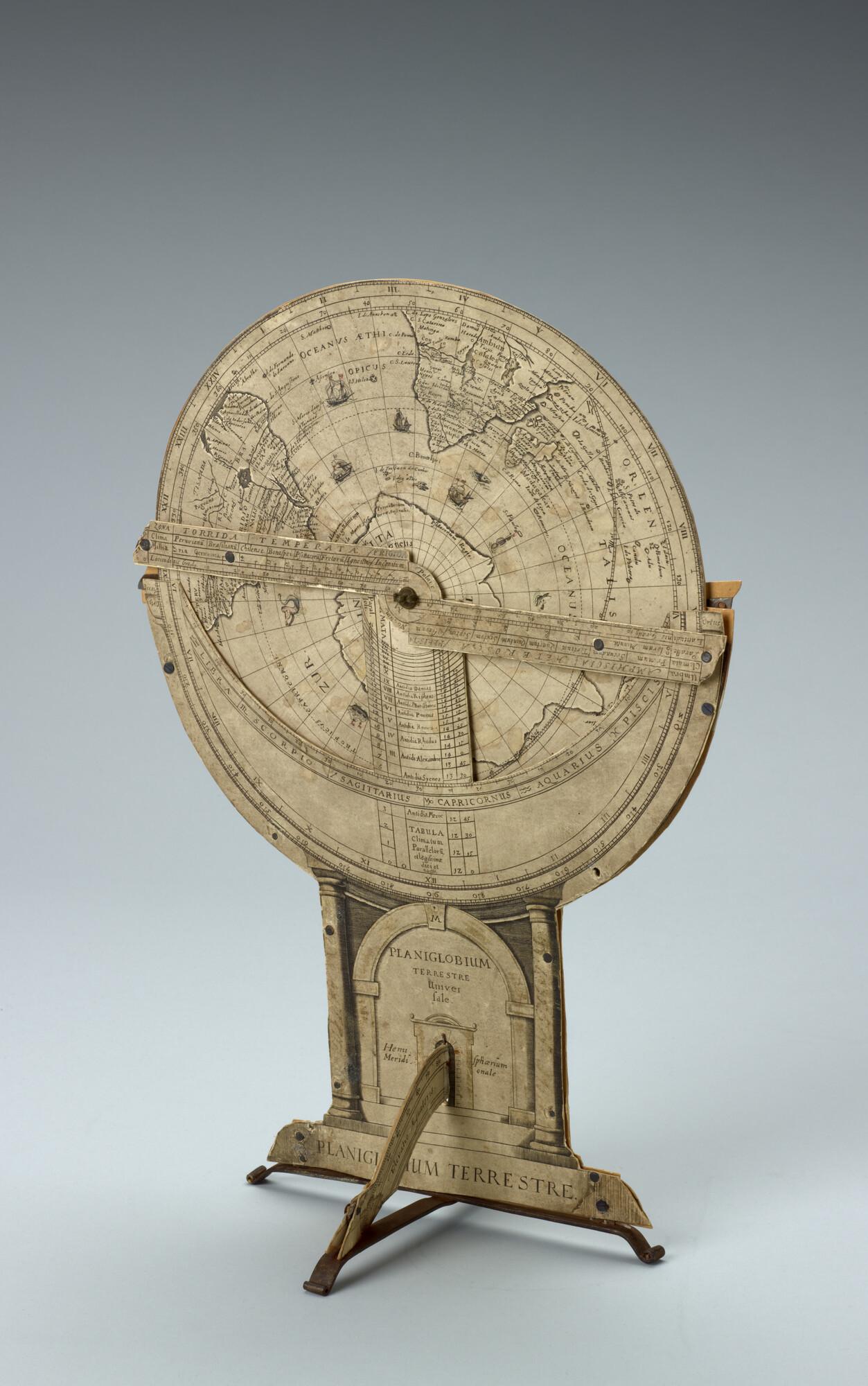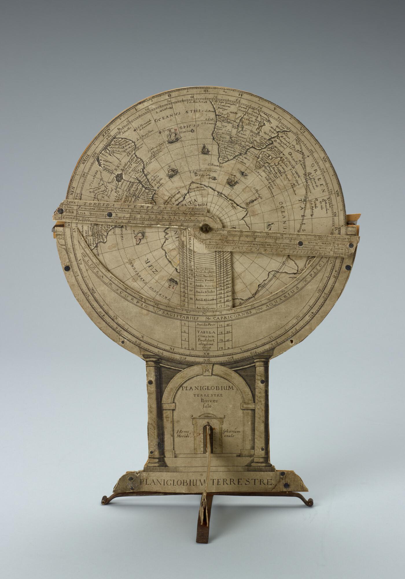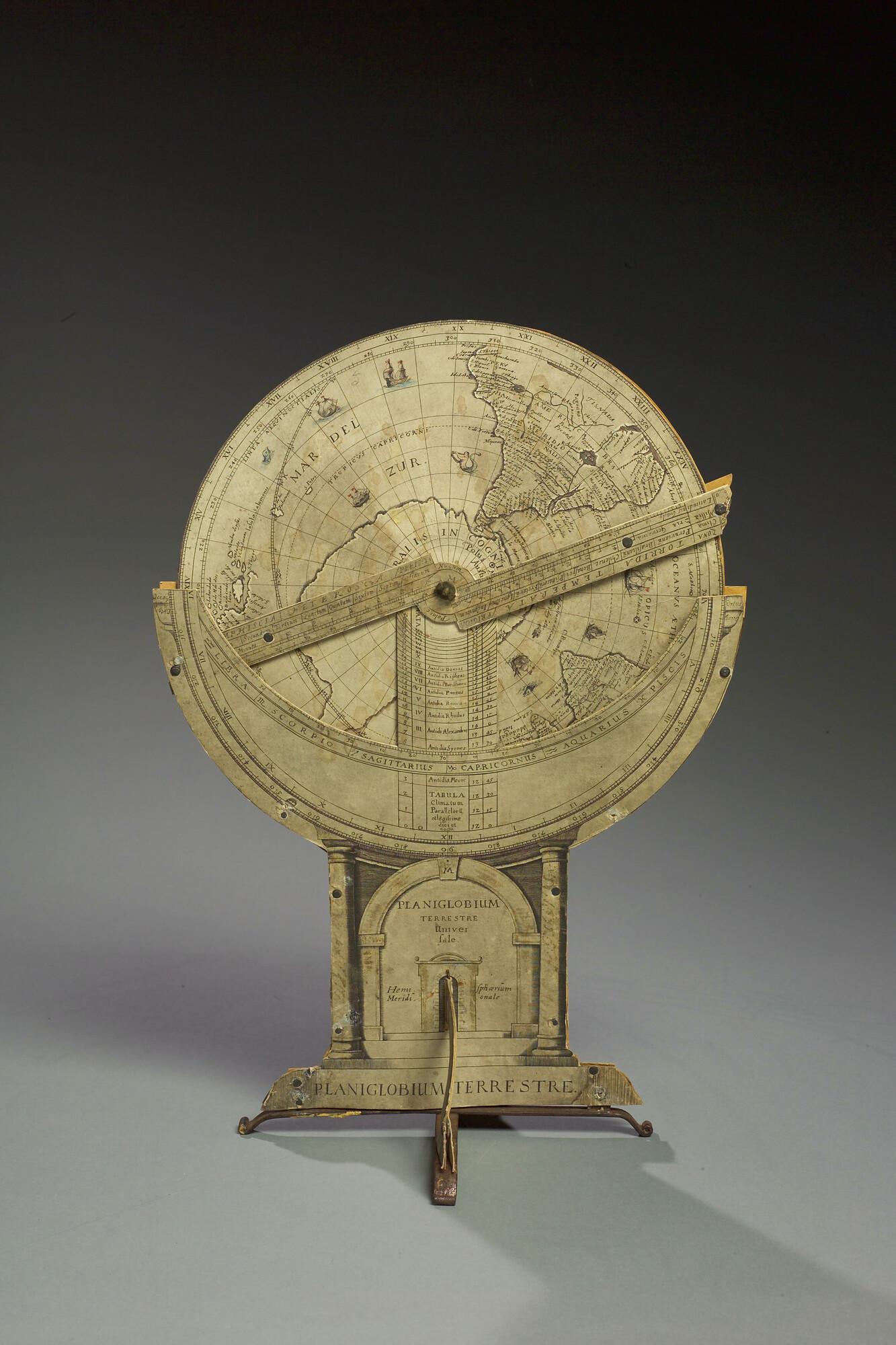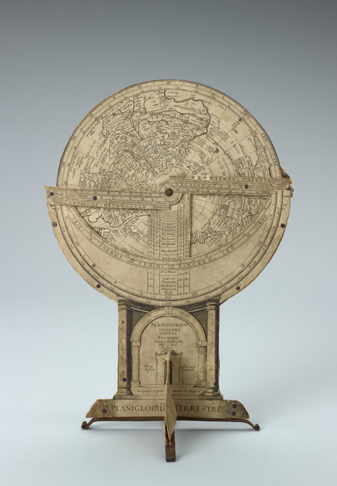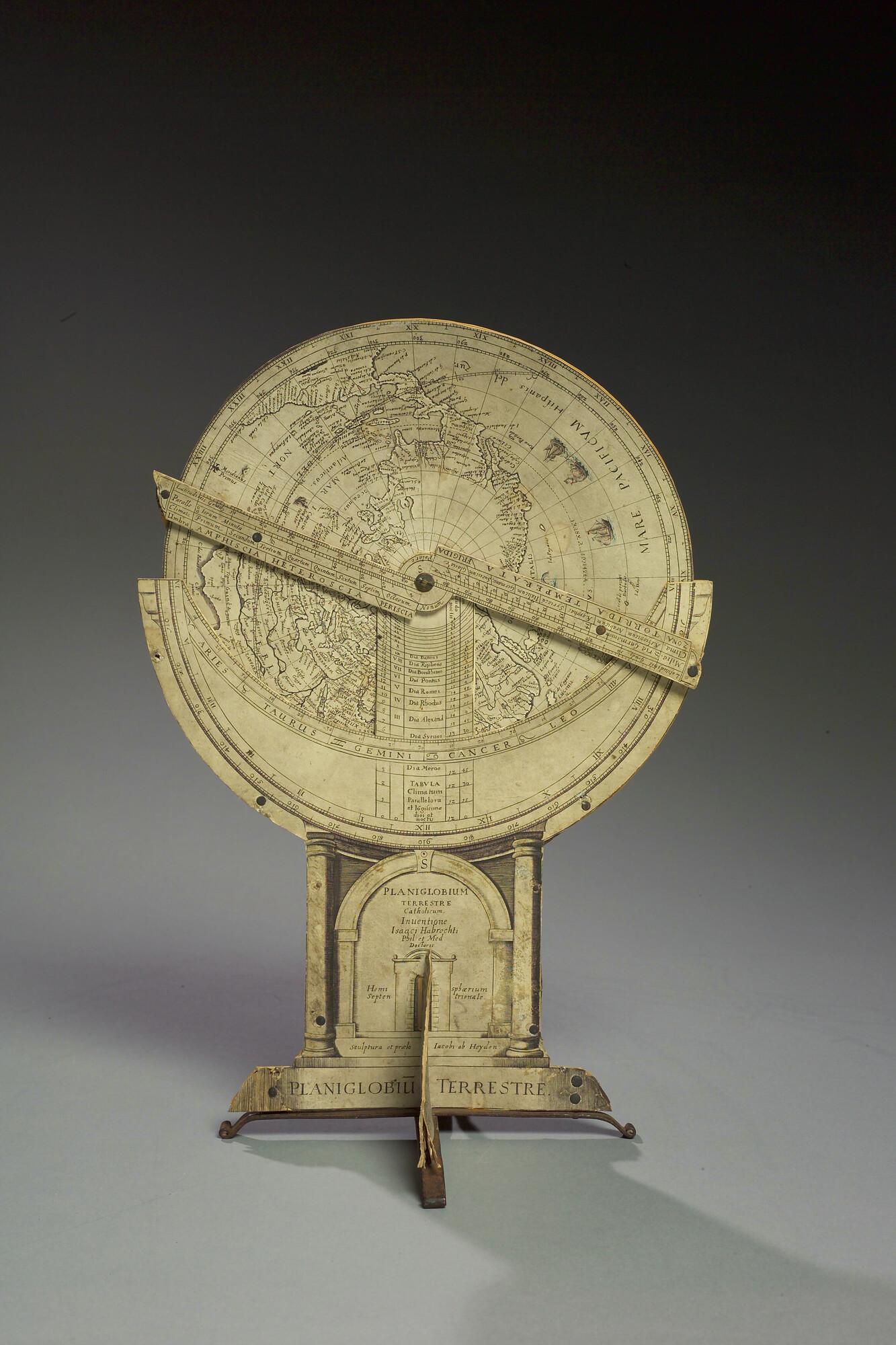 Planiglobium terrestre van Isaac Habrecht, uitgave Jakob von Heyden, Straatsburg, 1628. Noordelijke en zuidelijke polaire projecties. Met een draaibare wijzer.