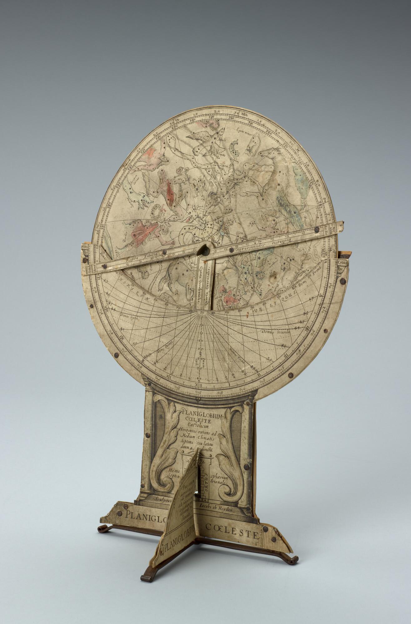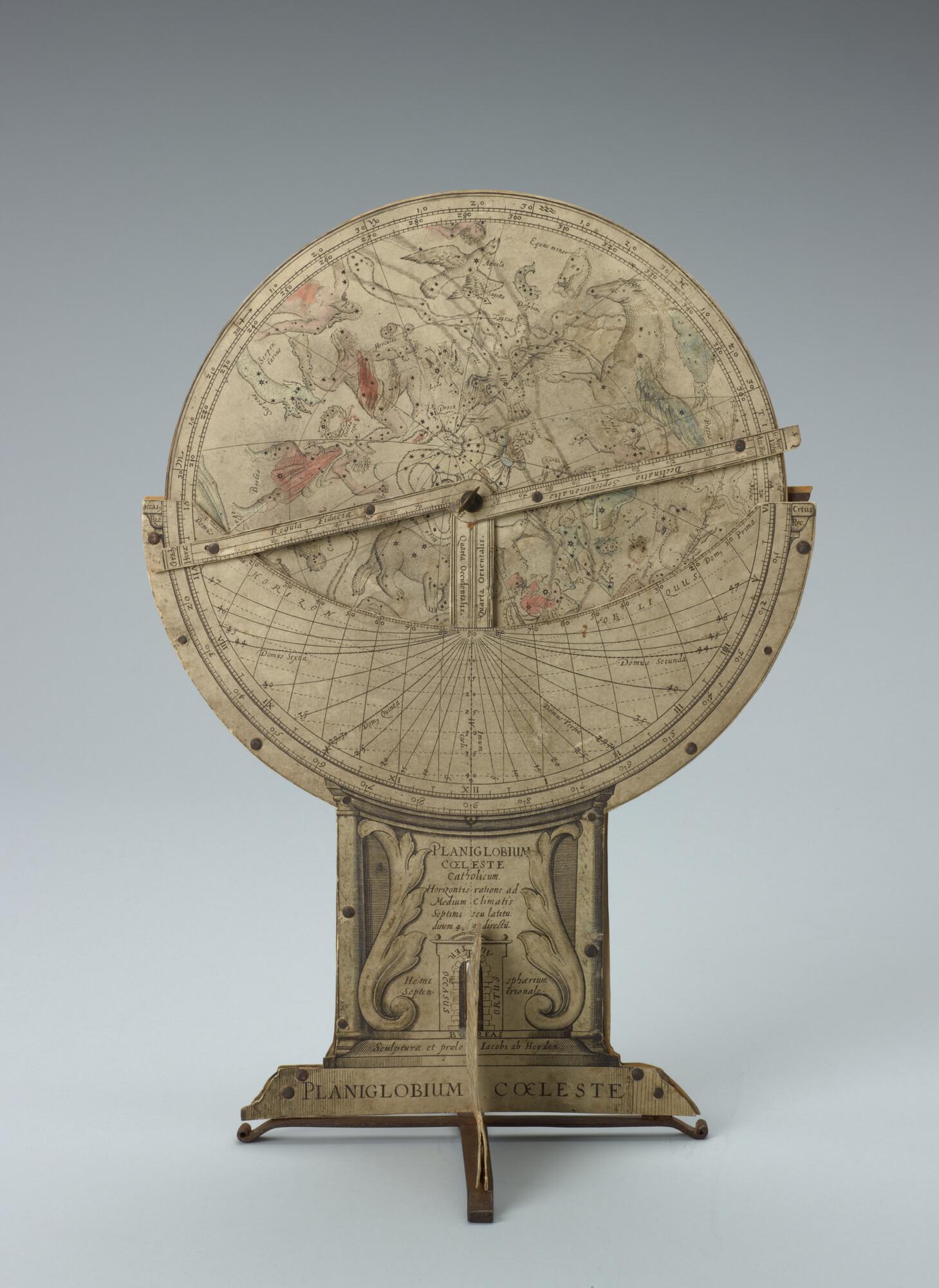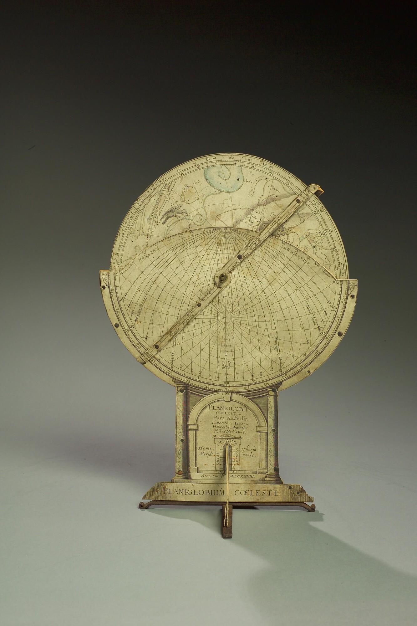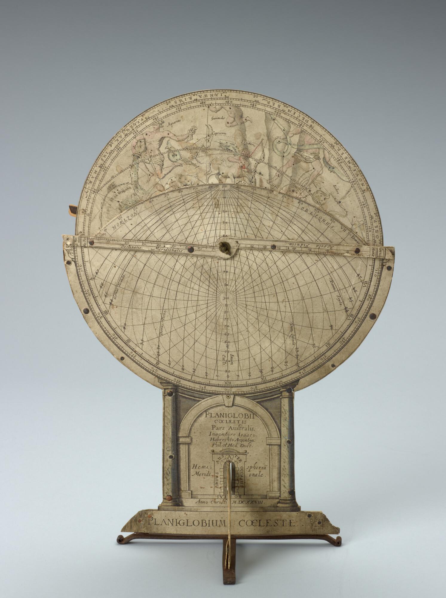 Planiglobium coeleste van Isaac Habrecht,uitgave door Jakob von Heydon, Straatsburg, 1628. Polaire projecties van de noordelijke en zuidelijke sterrenhemel. Met draaibare wijzer.