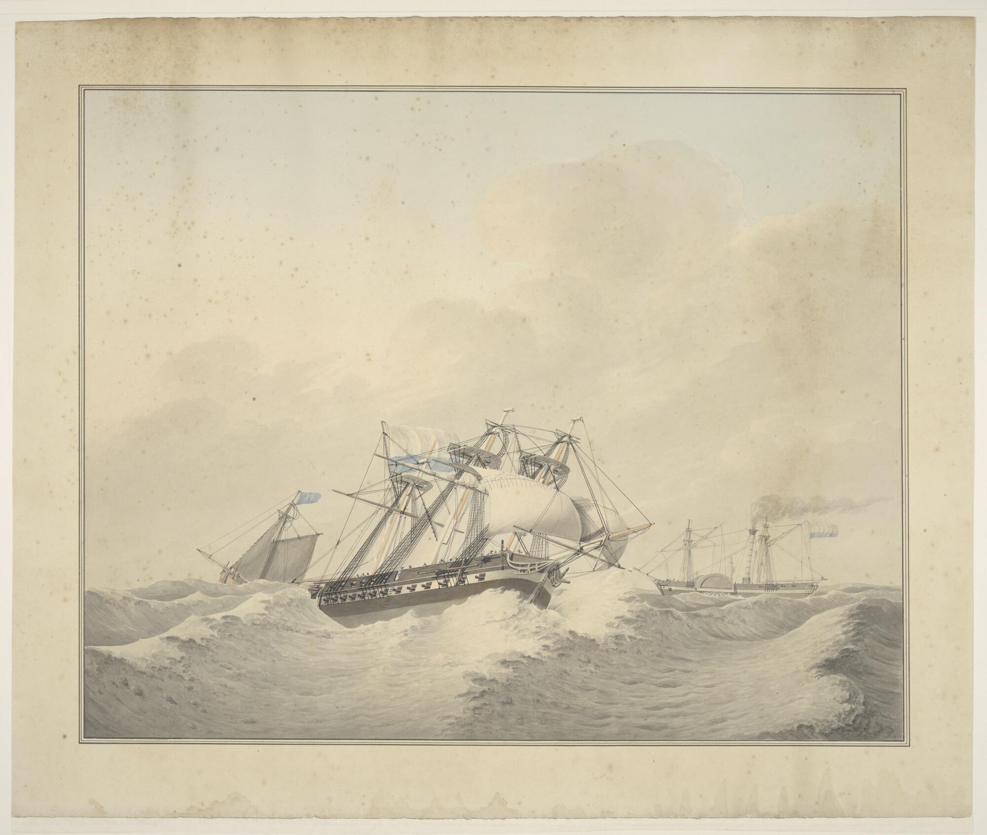 Een oorlogsschip met averij, lenzend onder noodtuig met l.a. een loodsboot met blauwe vlag nr.16; r.a een raderstoomschip onder stoom.