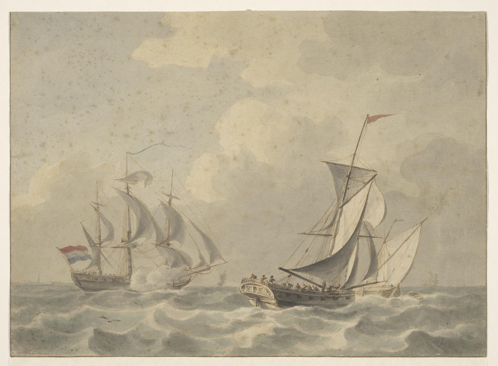 Een oorlogskotter en oorlogskorvet onder zeil in open water