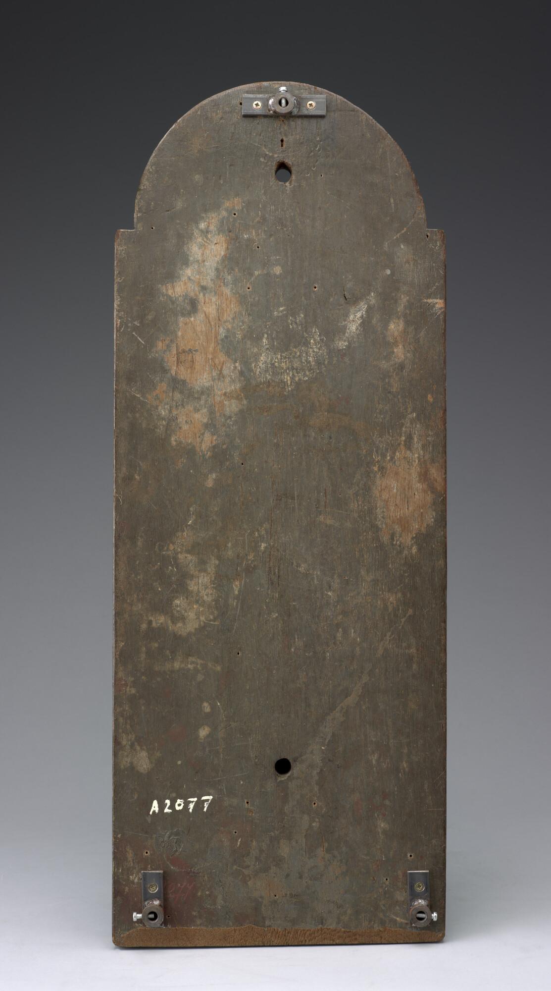 Rechthoekig bord met een halfronde bovenkant. Het bord is verdeeld in twee vlakken en gedecoreerd met beschilderd snijwerk. De omlijsting van de binnenrand is verguld.