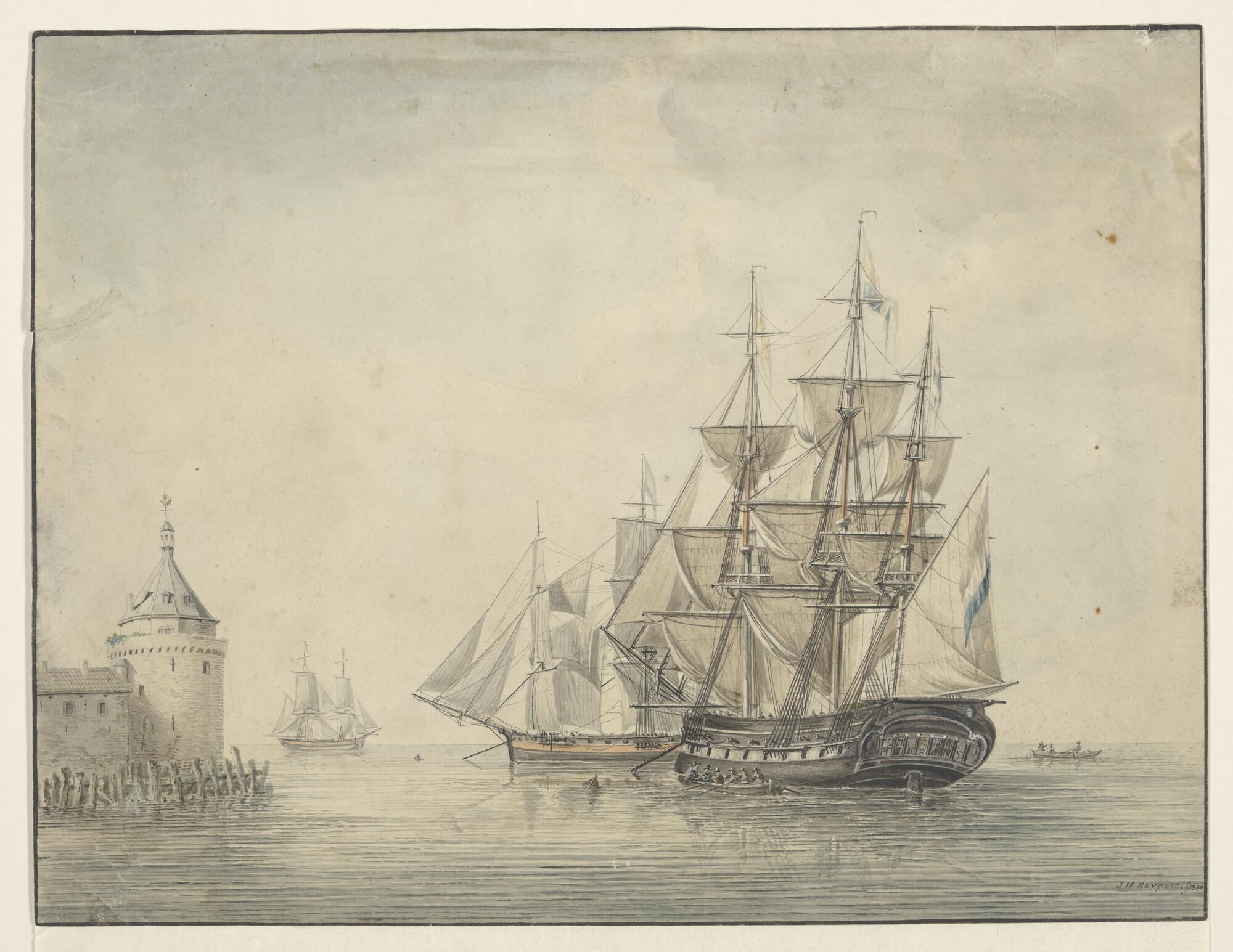 Een fregatschip en twee brikschepen ten anker voor Veere