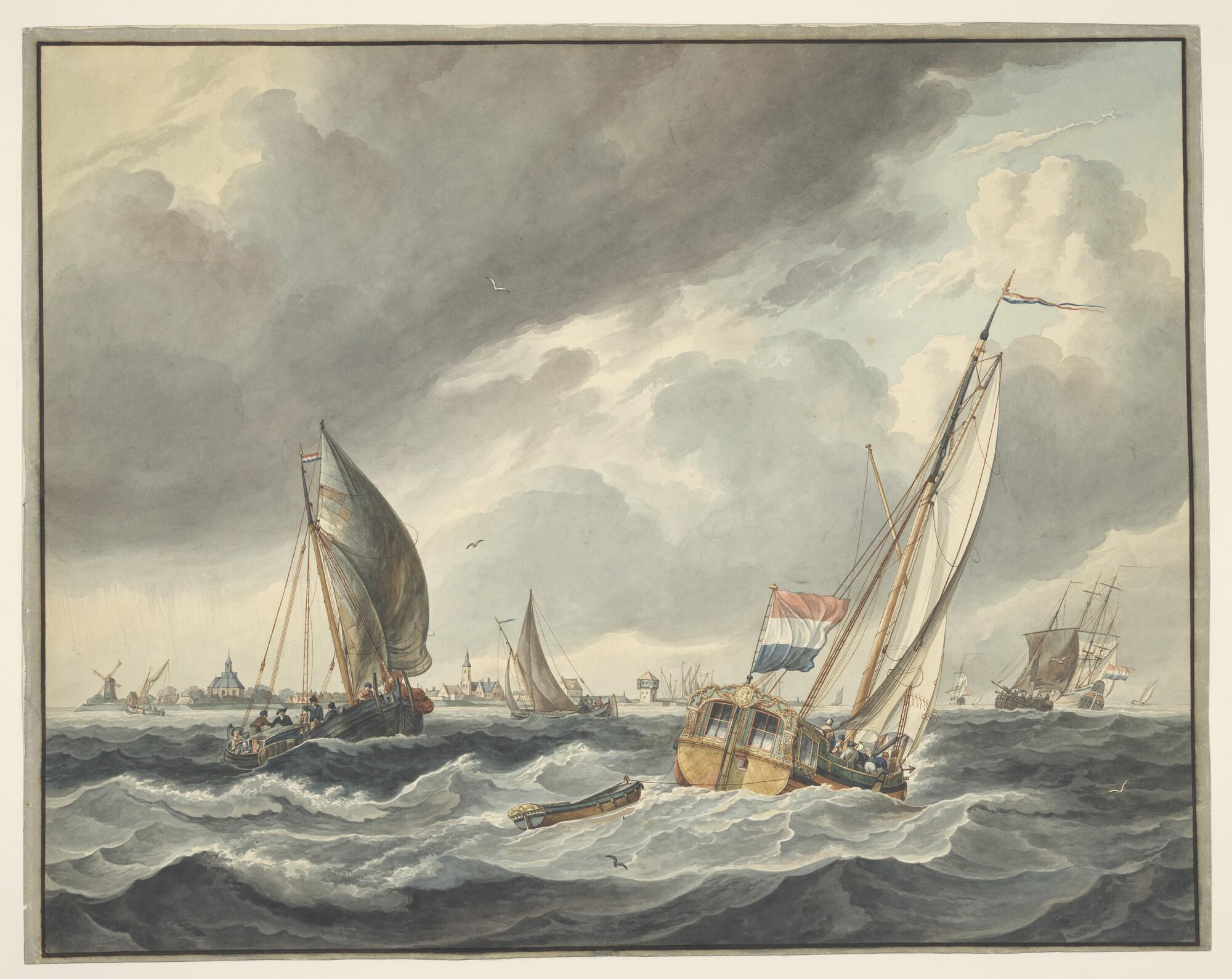 Scheepvaart op het Hollands Diep ter hoogte van Willemstad, rechts op de voorgrond een statenjacht