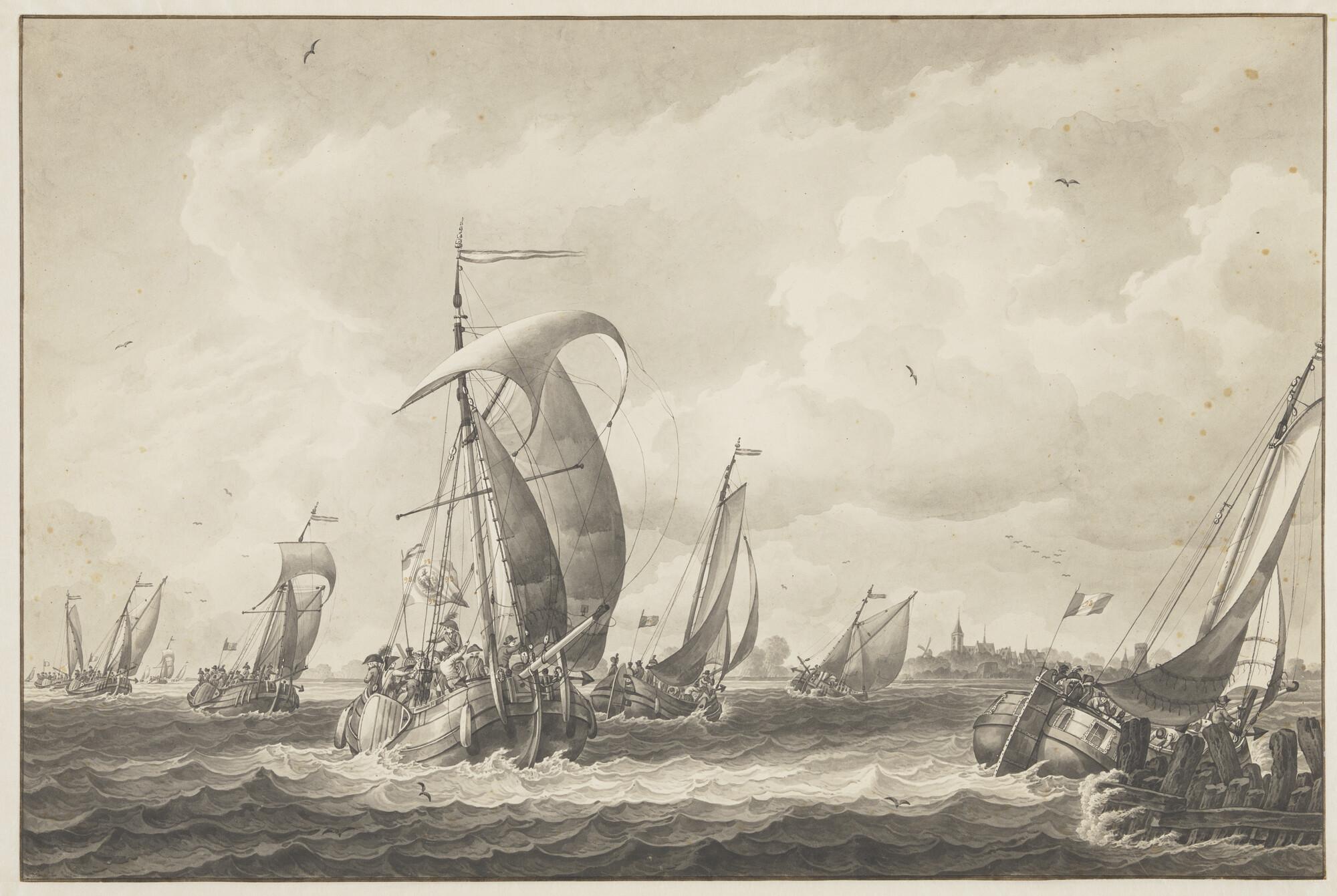 Aankomst van een transport Franse soldaten in de haven van Bergen op Zoom, aan boord van een aantal ponen