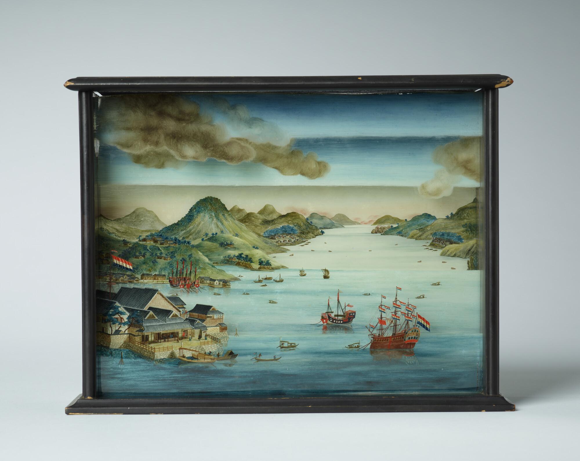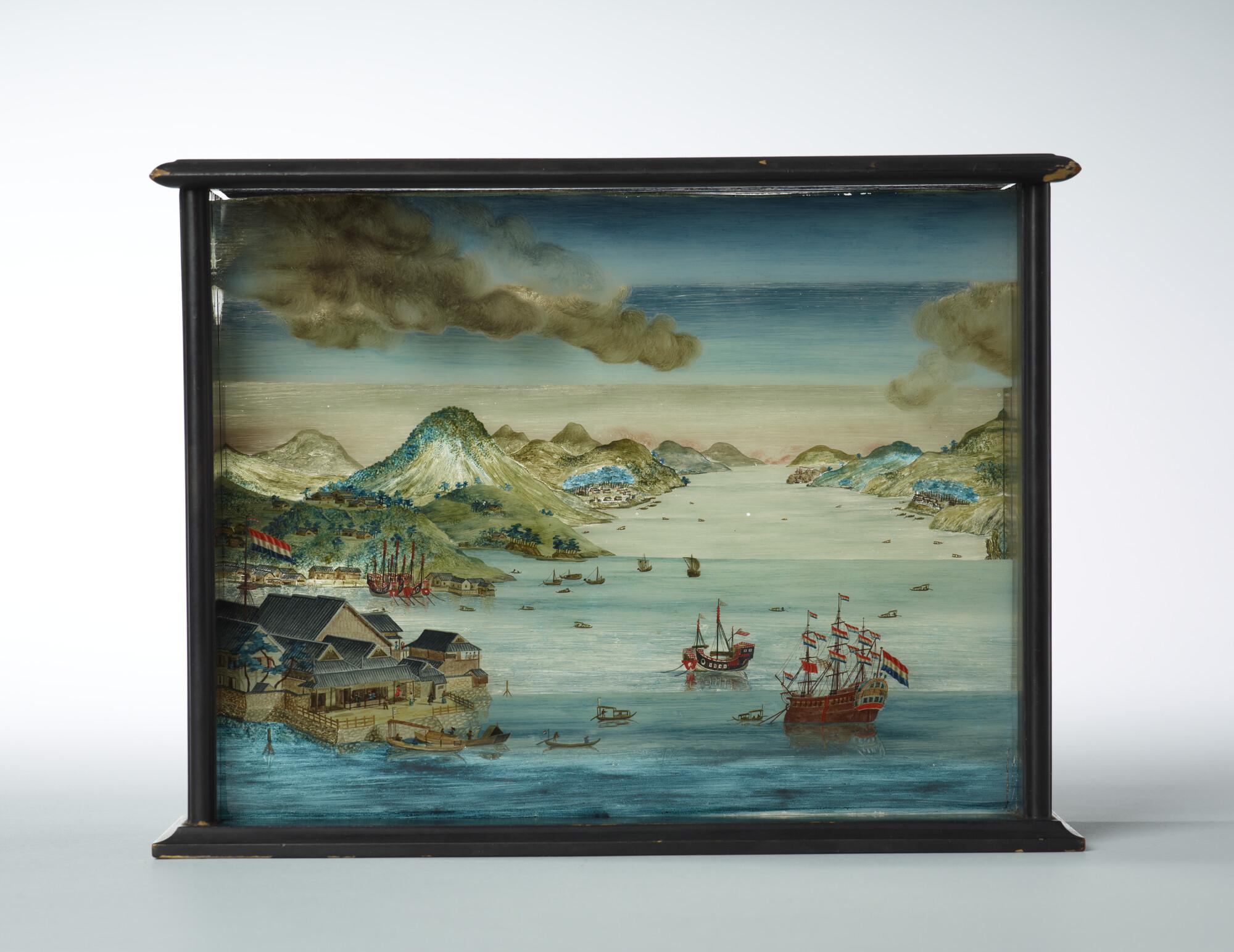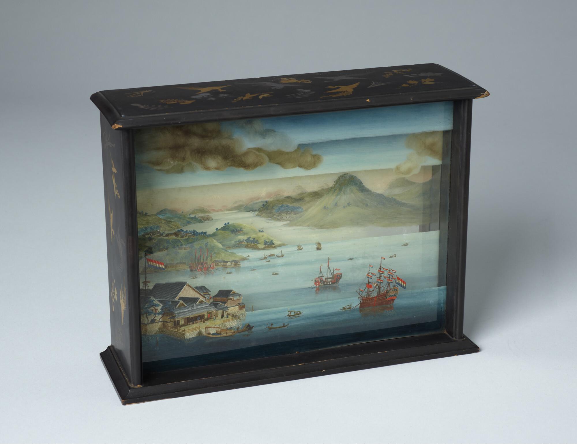 Beschilderd glas met een voorstelling van zeilschepen in de baai van Nagasaki en het eiland Deshima. Geplaatst in een kastje van Japans lakwerk. Mogelijk bedoeld of gebruikt als een diafanorama, een glasplaat voor een toverlantaarn. De glasplaat is gevat in een houten kastje van Japans lakwerk.