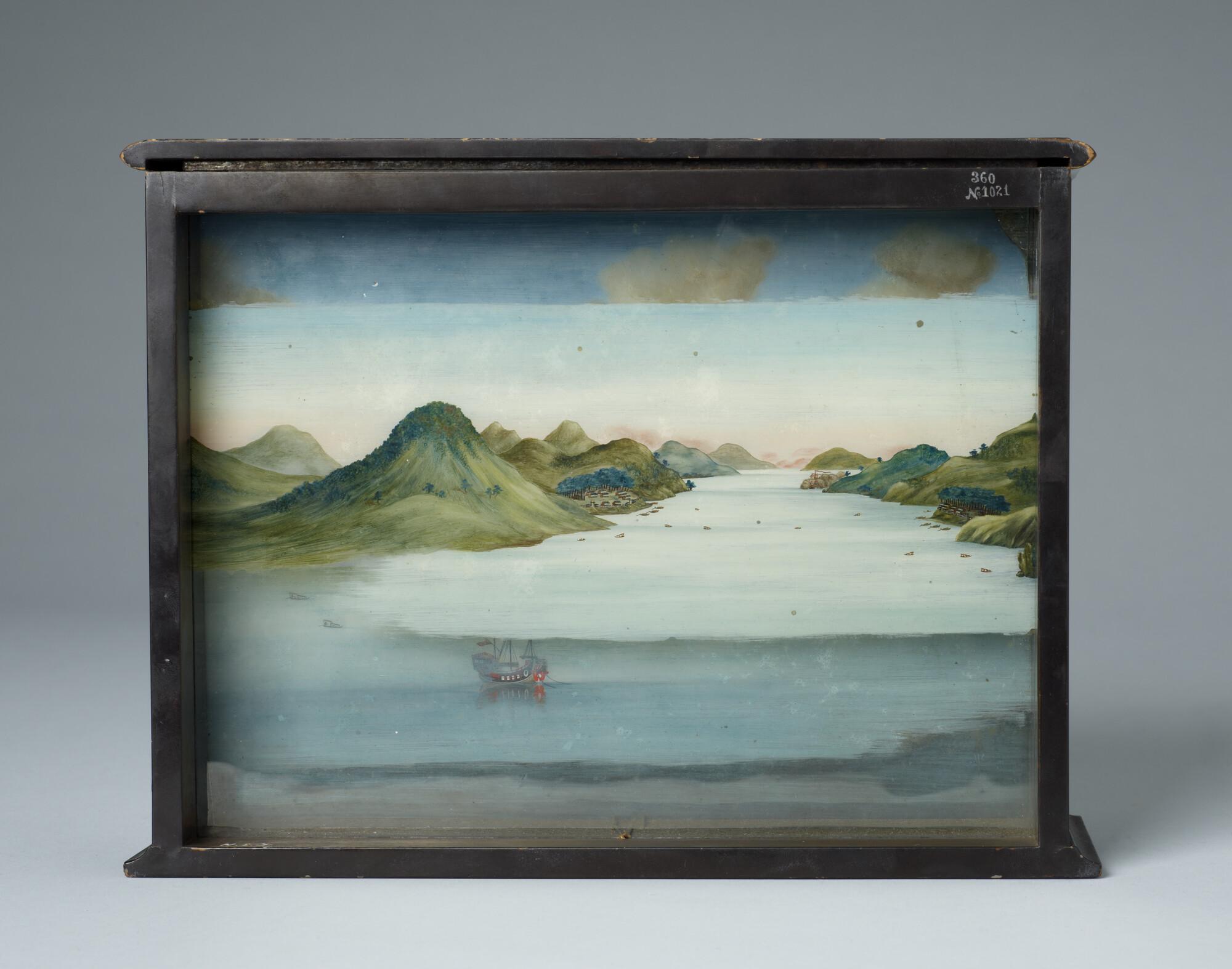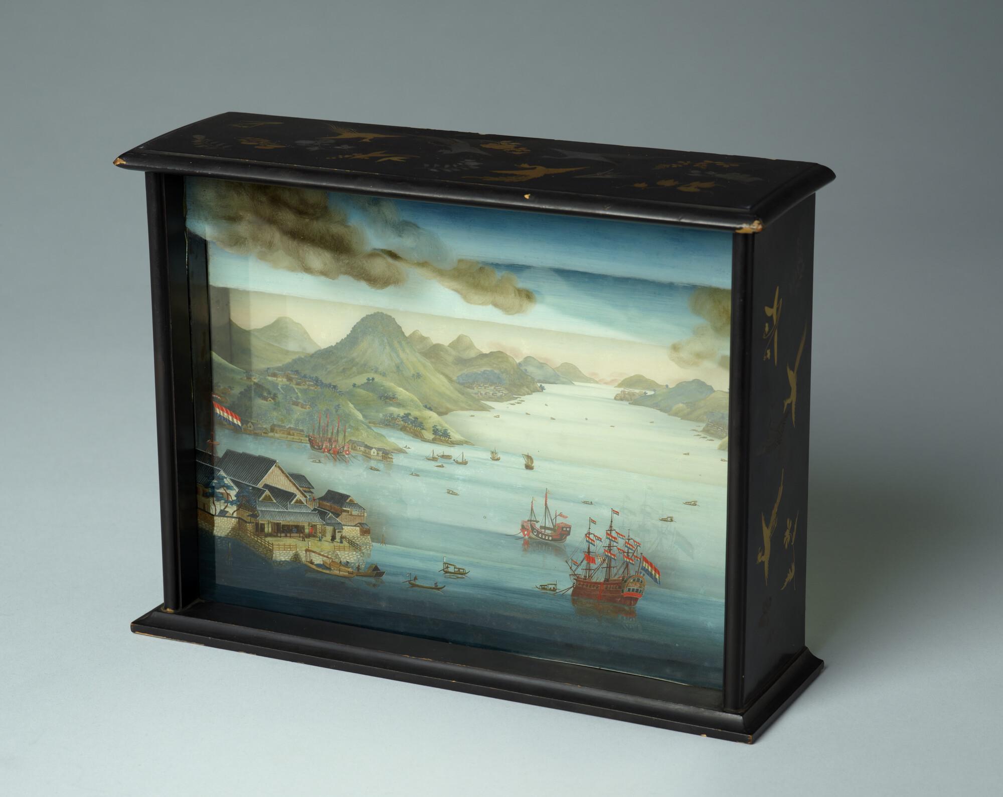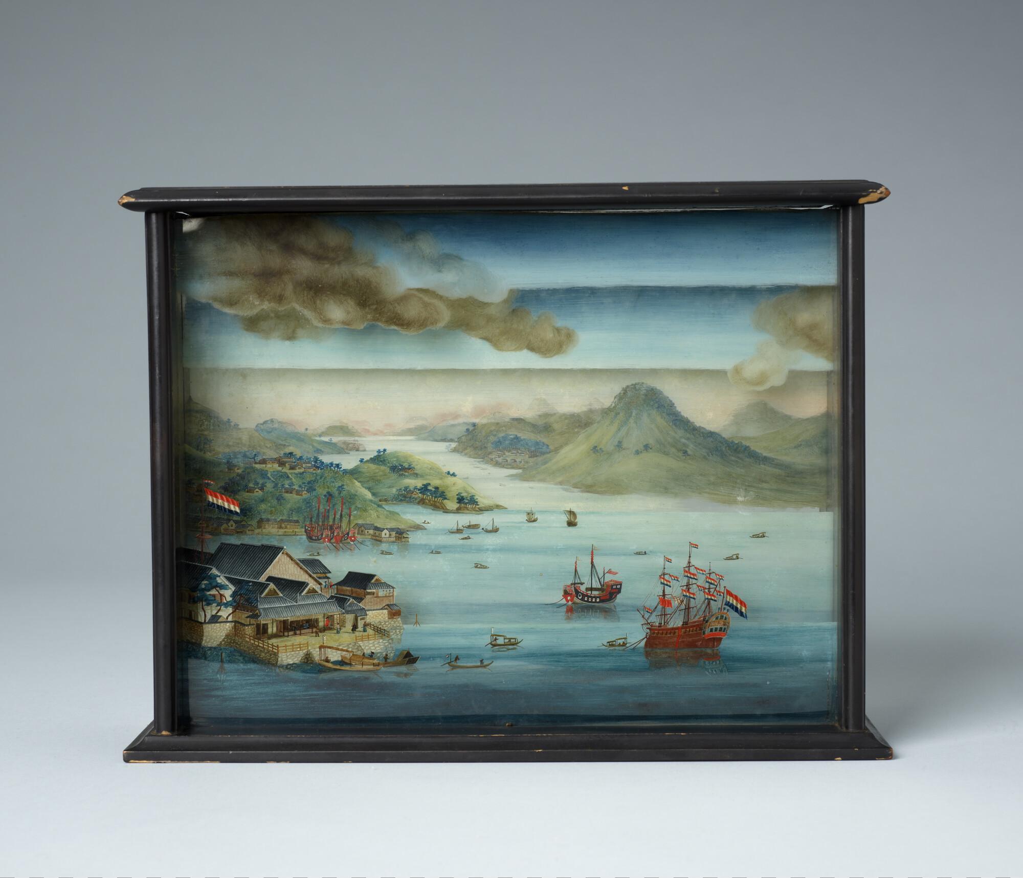 Beschilderd glas met een voorstelling van zeilschepen in de baai van Nagasaki en het eiland Deshima. Geplaatst in een kastje van Japans lakwerk. Mogelijk bedoeld of gebruikt als een diafanorama, een glasplaat voor een toverlantaarn. De glasplaat is gevat in een houten kastje van Japans lakwerk.