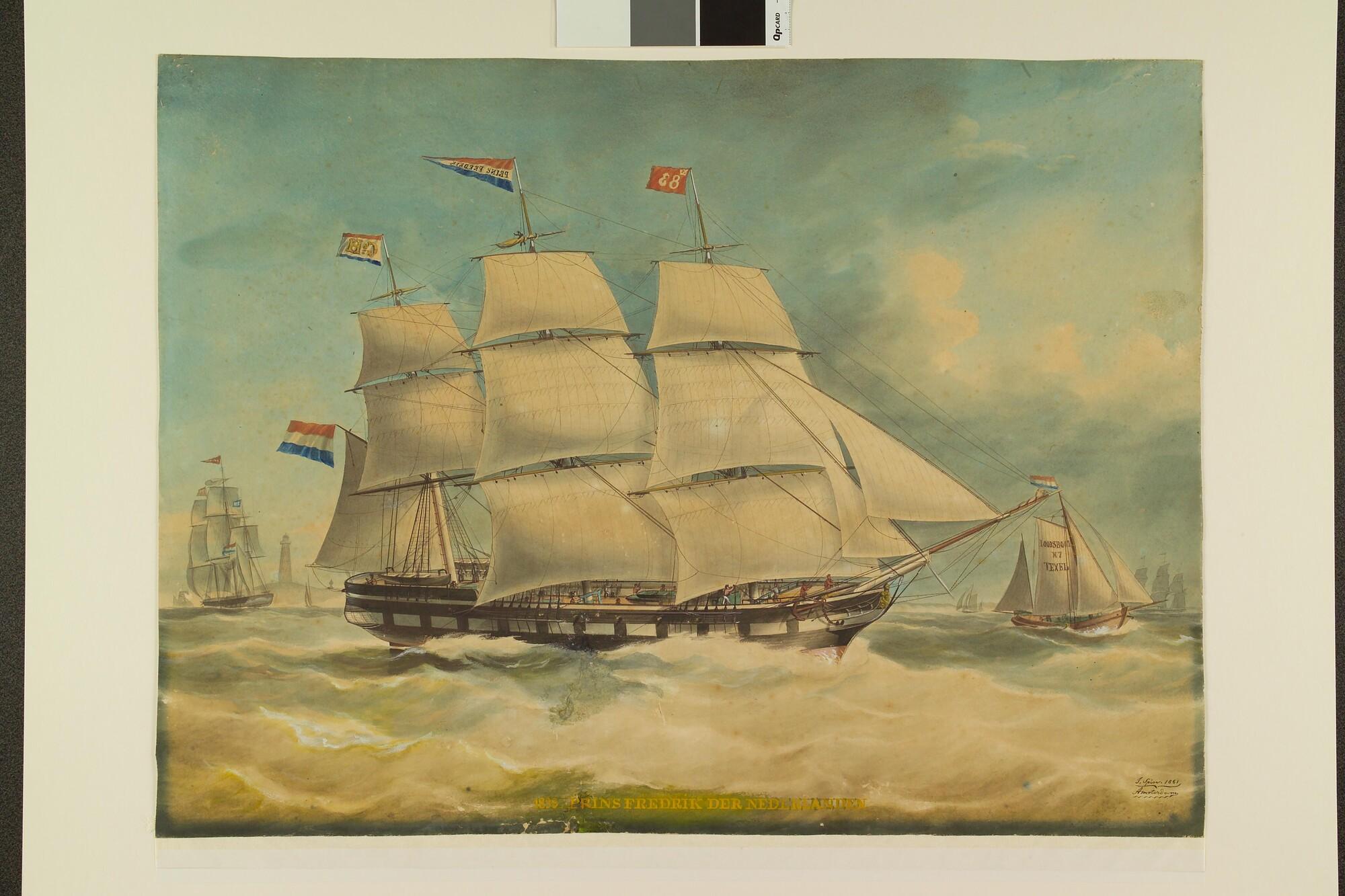 Het fregatschip Prins Frederik der Nederlanden in 1838 ter hoogte van Huisduinen. Op de achtergrond de loodsboot Texel no 7.