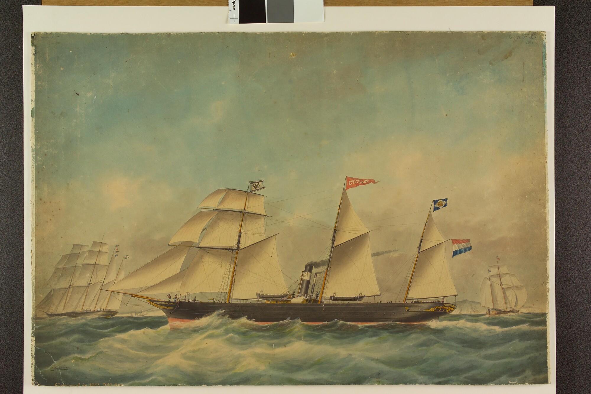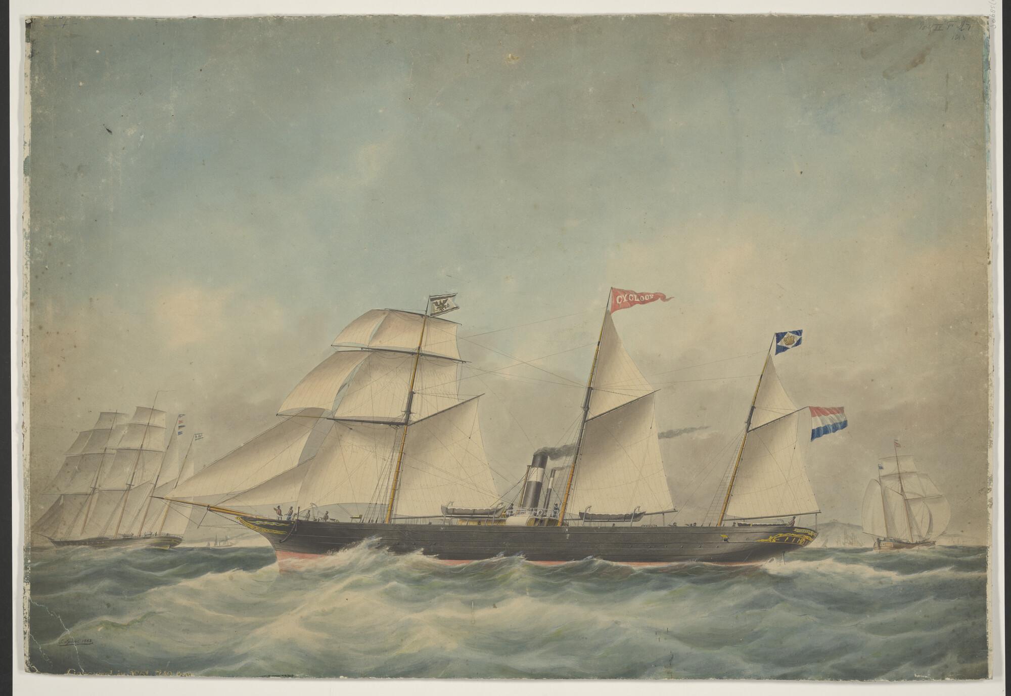 Het schroefstoomschip "Cycloop"; links op de achtergrond een viermastbark; rechts op de achtergrond een kofschip