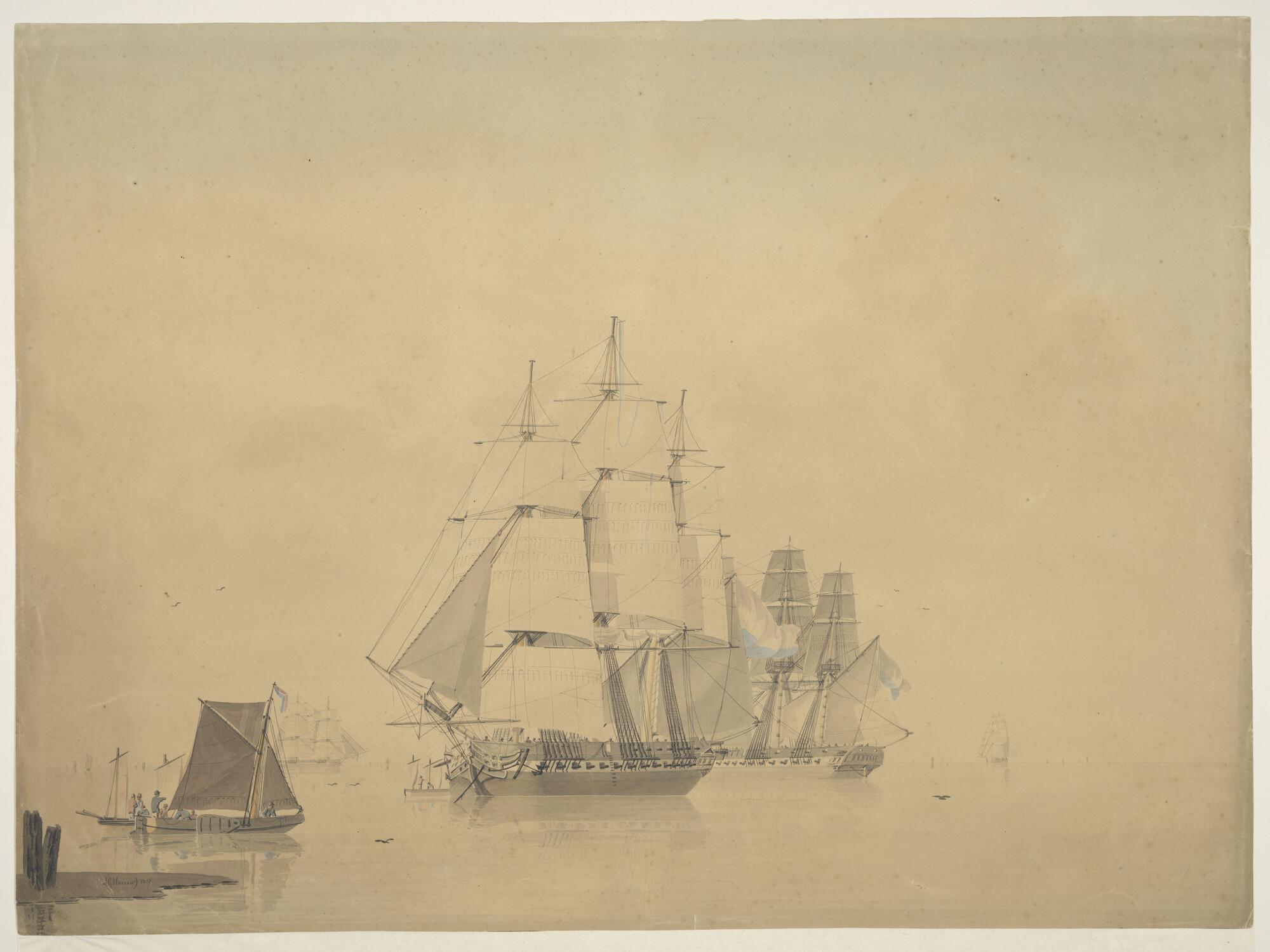 Twee Nederlandse oorlogsschepen voor anker liggend